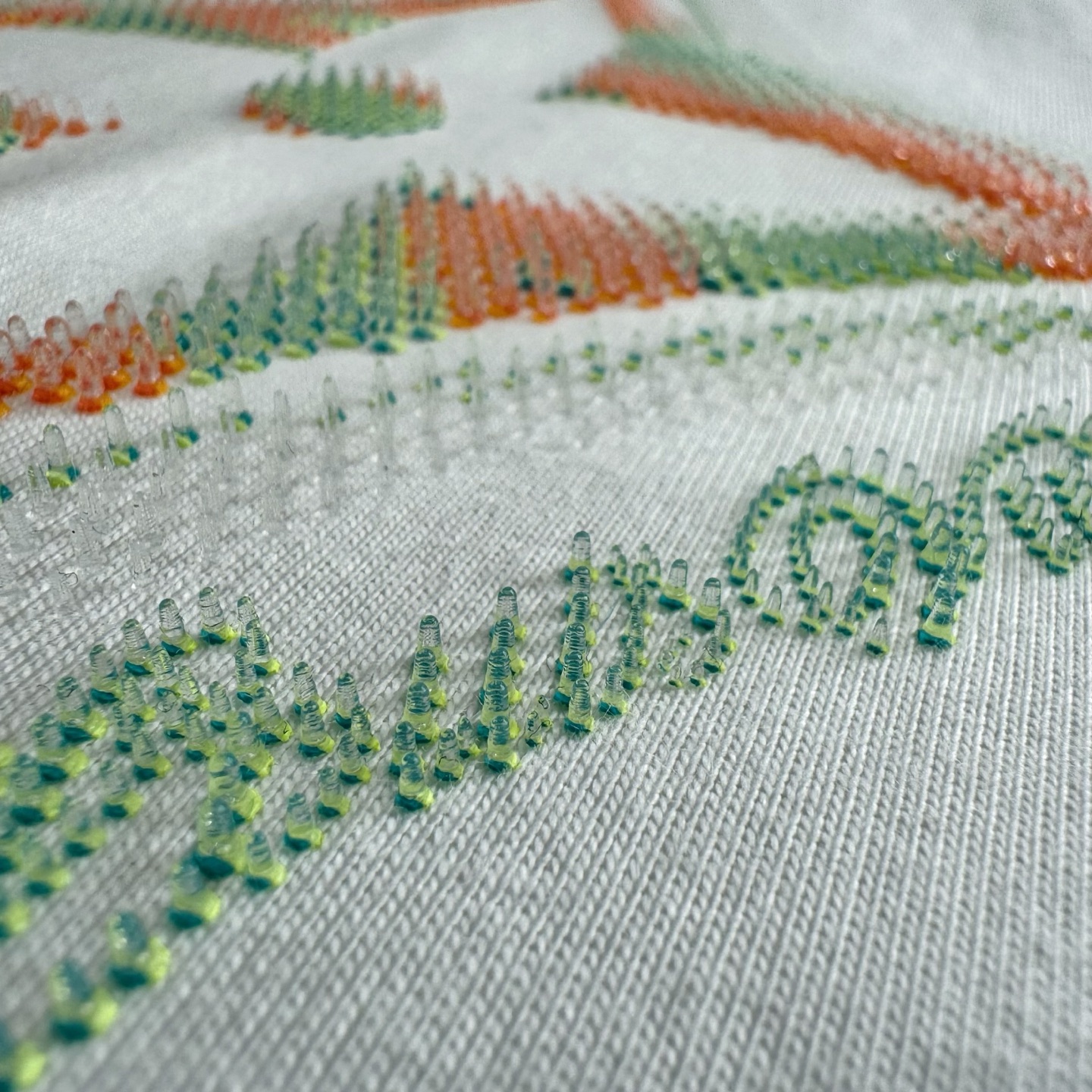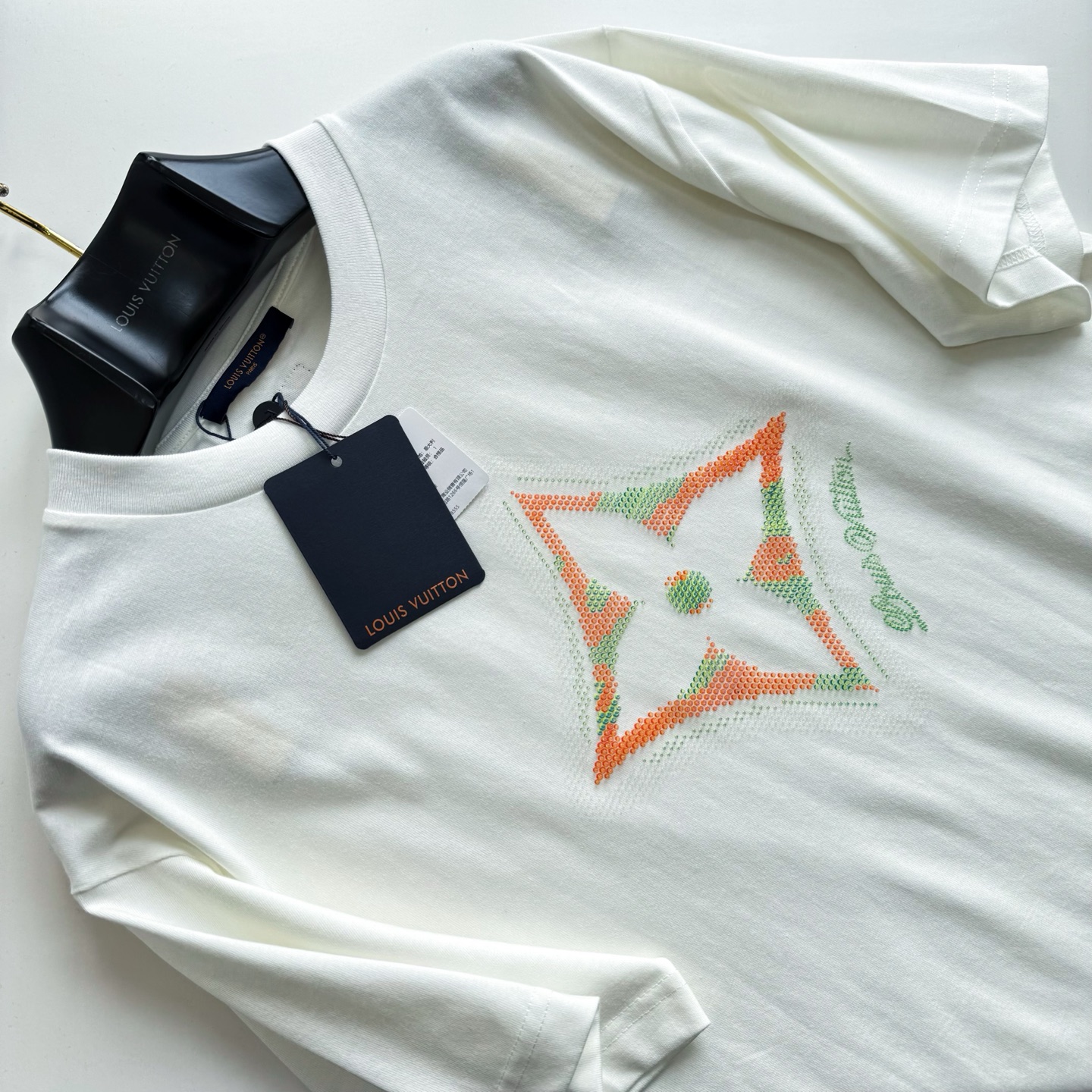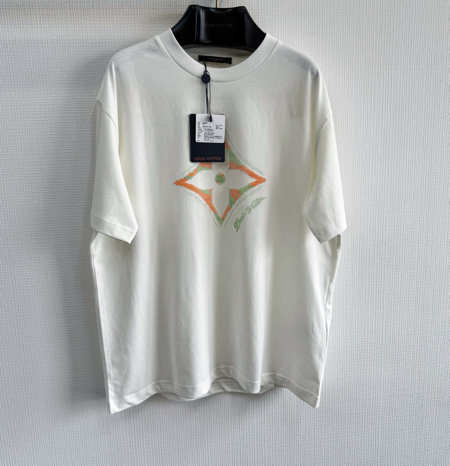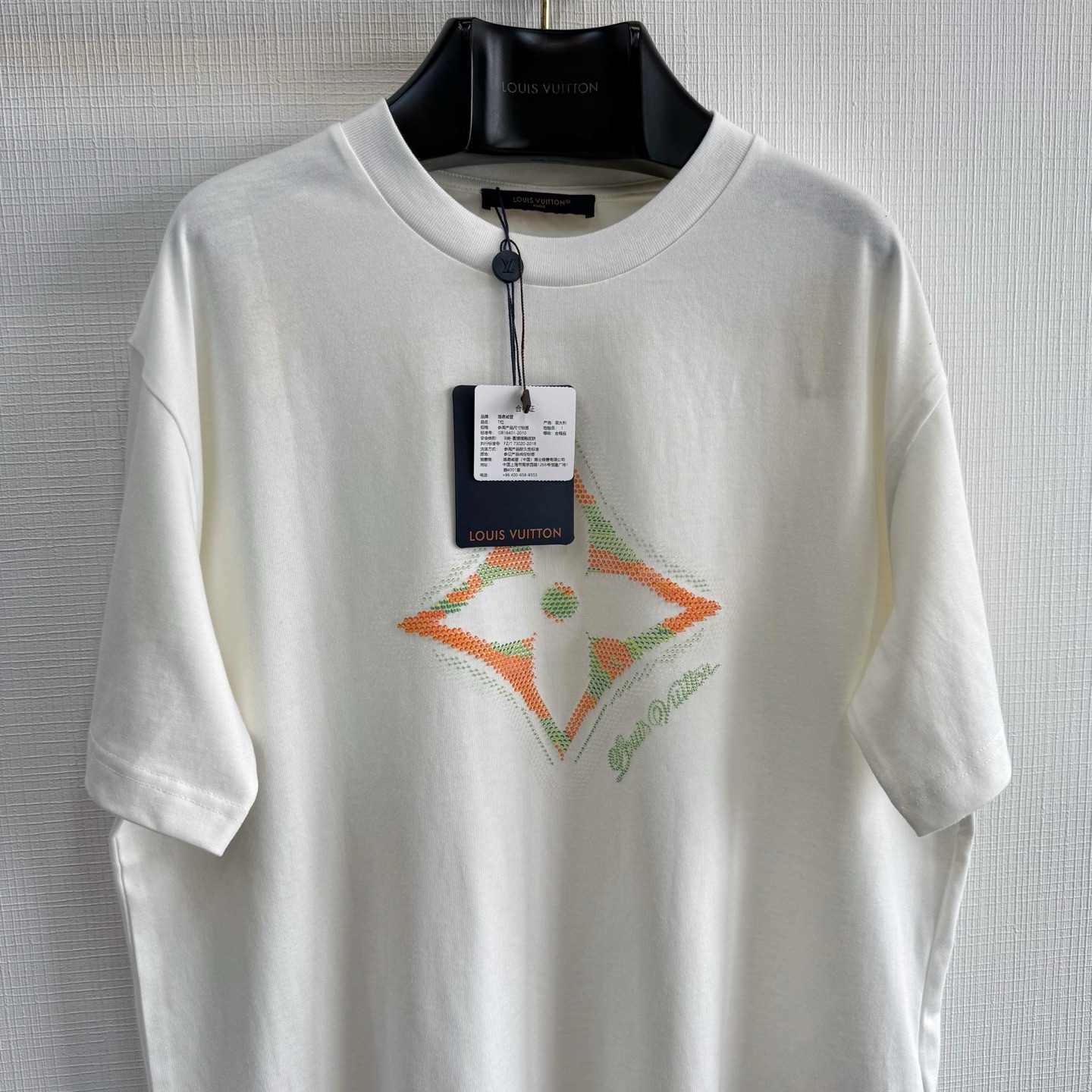 1v 25ss滴胶花卉圆领短袖 230g 1平织纯棉优质棉面料,正面标识印花 花卉图案的特点是3D渐变和滴胶工艺的结合。滴胶印花是使用胶浆在面料上形成立体图案,而3D效果可能通过多层次堆叠或透明胶浆实现渐变。六轴机械臂搭载CCD视觉相机,通过图案边缘的微米级定位点实现套印精度±0.03mm size:xs/s/m/l