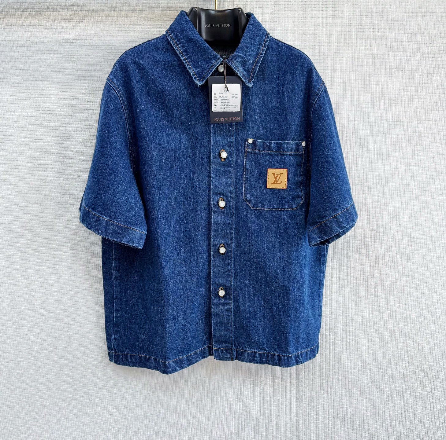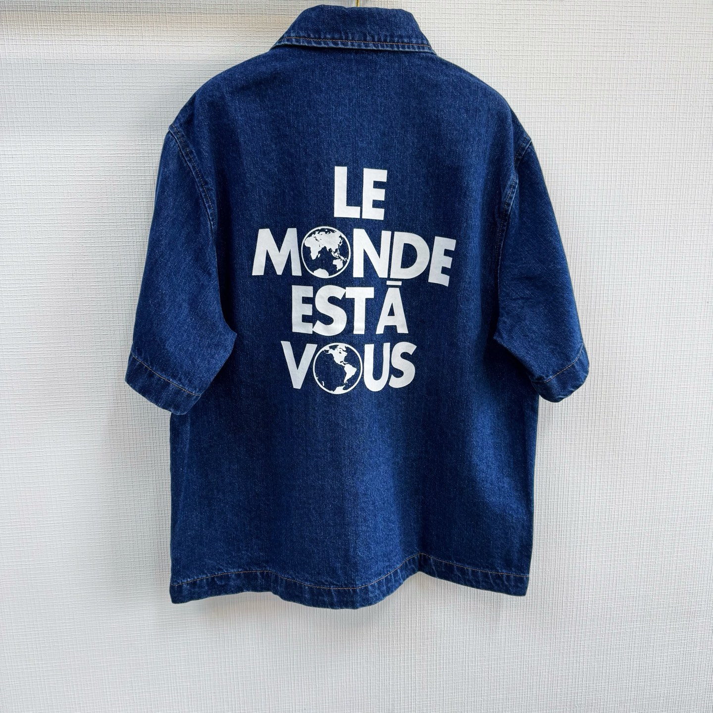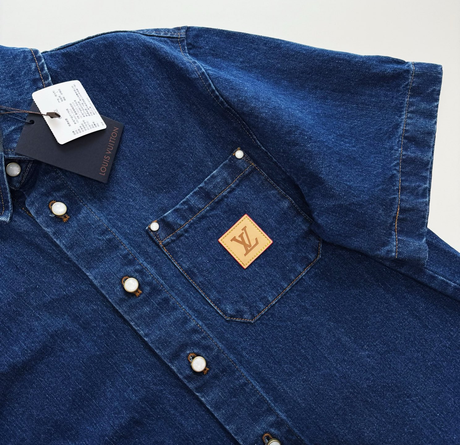 1v25ss皮标牛仔短袖衬衫 定制纯棉斜纹单宁牛仔布,宽松系扣廓形释放前卫气息。胸袋点缀压印 Marque 1.Vuitton Déposée 标识的 VVN 皮革贴饰,秀场的 Le Monde Est À Vous(世界是你们的)标语瞩目抒写于背后。面料采用单宁赤耳原色蓝牛面料,采用酵素水洗保持原色不掉色。皮标采用高温烫压logo,手摇缝纫走线。后背印花采用网板刮浆印花,无毛边。珍珠扣定制纯铜底座做旧工艺珍珠镶嵌size:s/m/l/xl