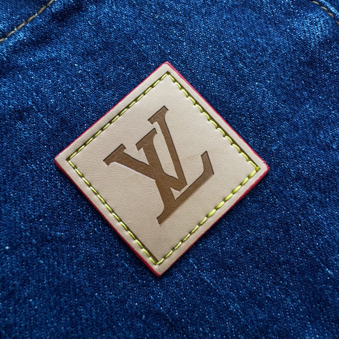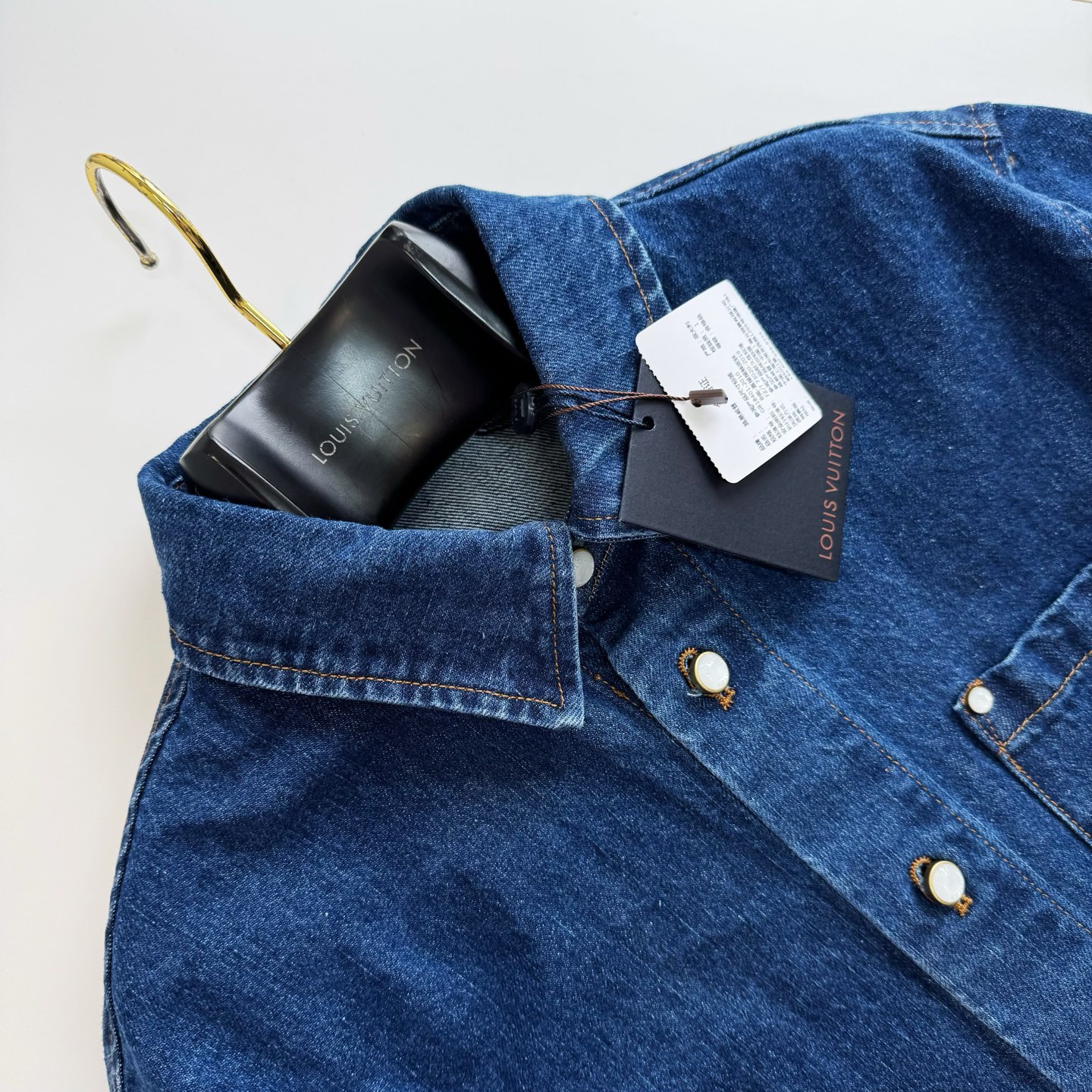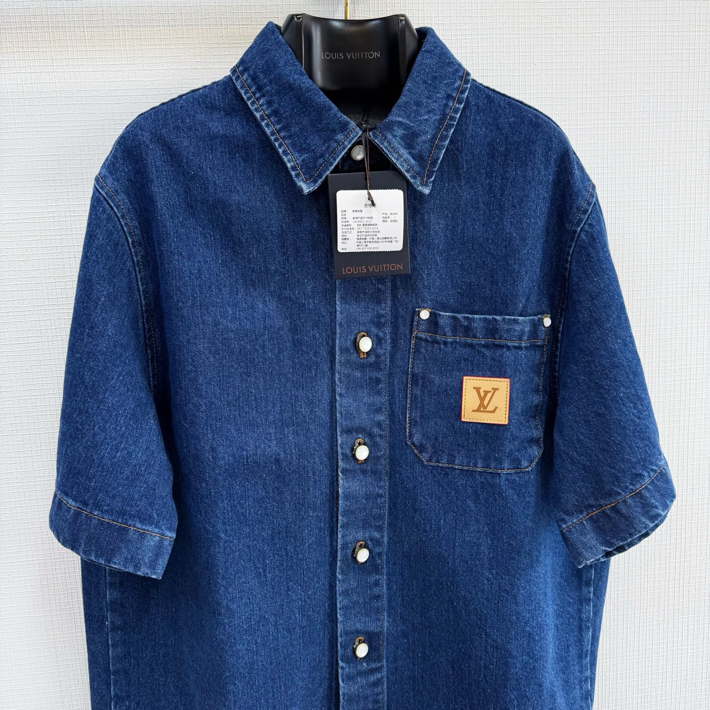 1v25ss皮标牛仔短袖衬衫 定制纯棉斜纹单宁牛仔布,宽松系扣廓形释放前卫气息。胸袋点缀压印 Marque 1.Vuitton Déposée 标识的 VVN 皮革贴饰,秀场的 Le Monde Est À Vous(世界是你们的)标语瞩目抒写于背后。面料采用单宁赤耳原色蓝牛面料,采用酵素水洗保持原色不掉色。皮标采用高温烫压logo,手摇缝纫走线。后背印花采用网板刮浆印花,无毛边。珍珠扣定制纯铜底座做旧工艺珍珠镶嵌size:s/m/l/xl