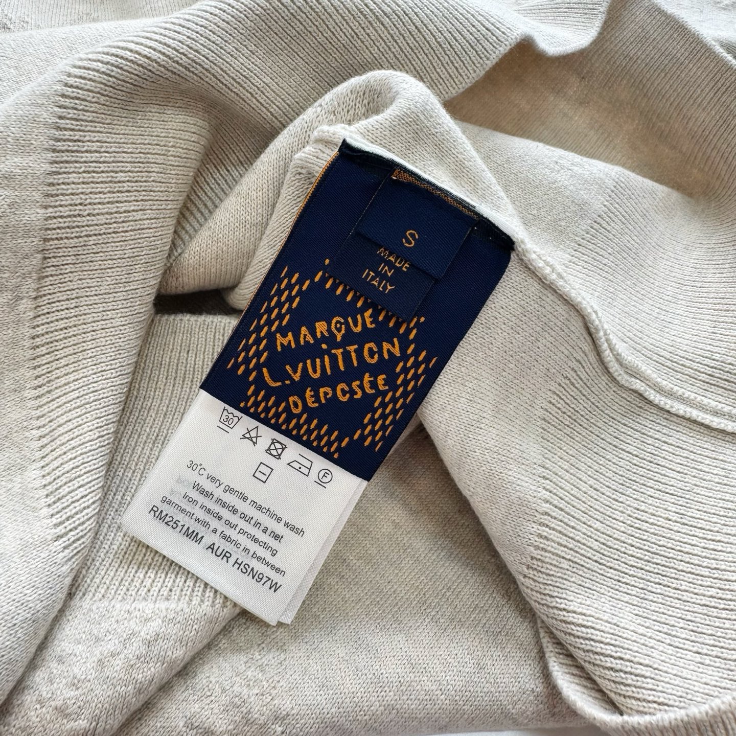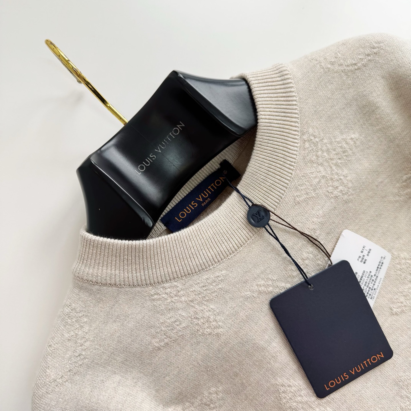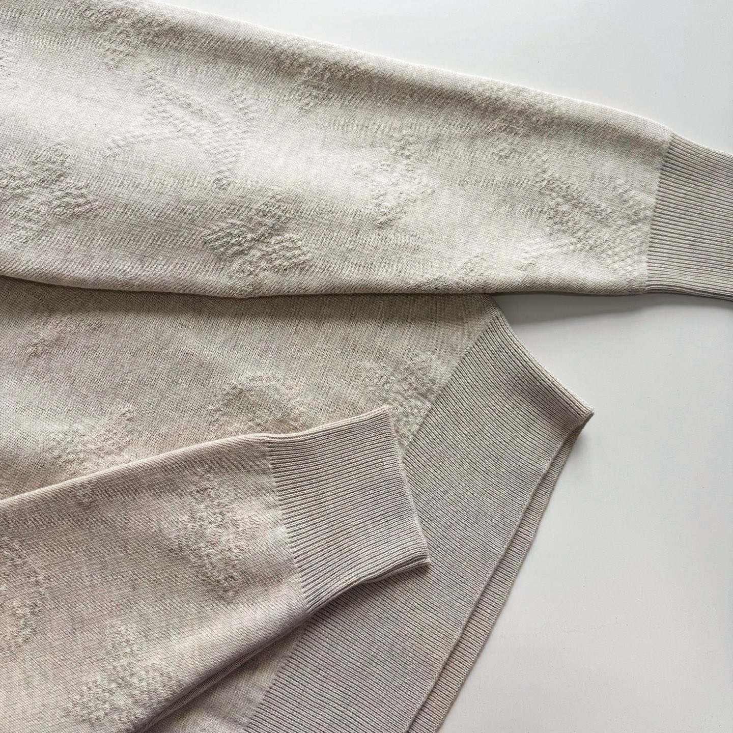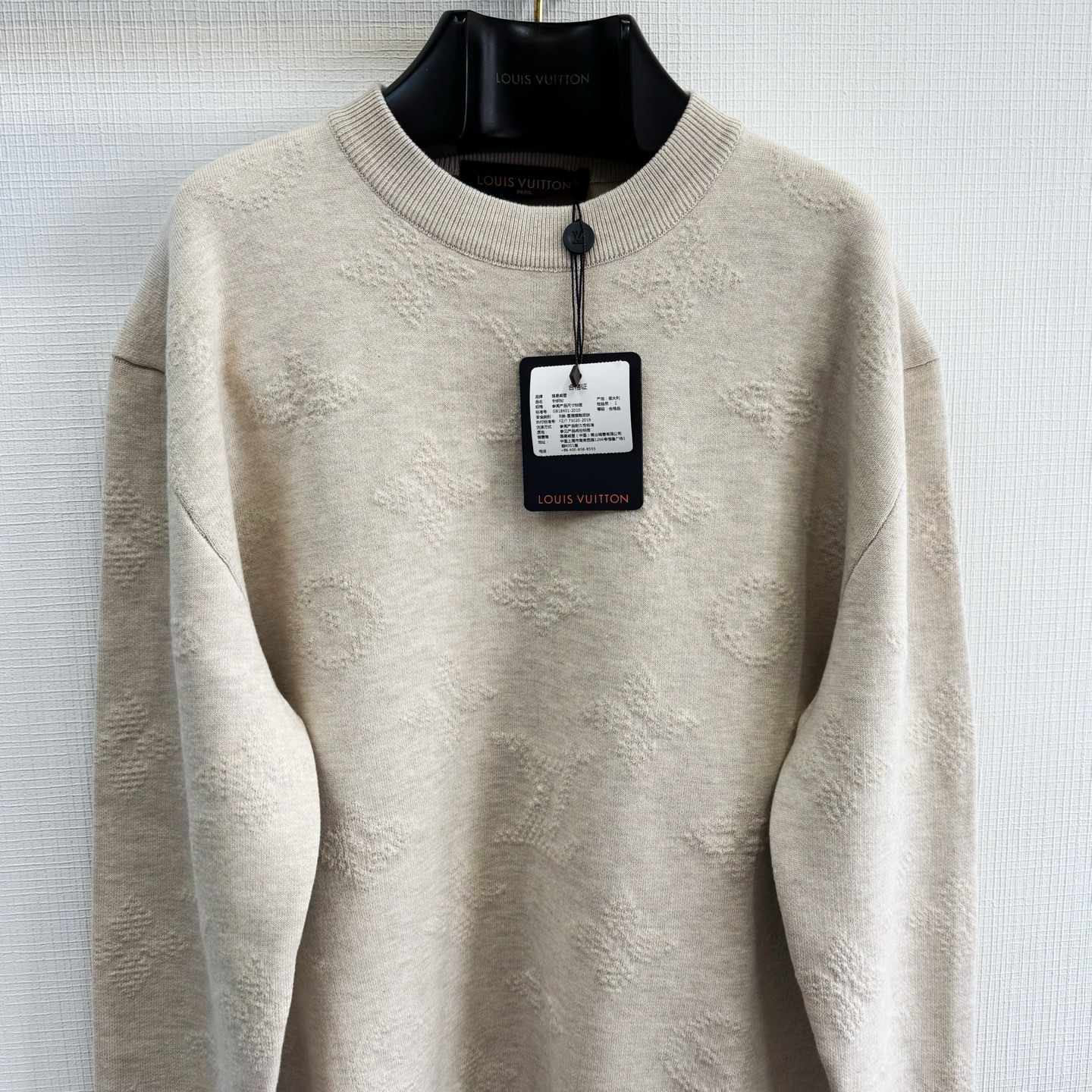 1v25ss Monogram浮雕提花毛织套头 原版进行打色定染 颜色相似度高达95%以上 纱线由底面2条2/60精梳棉+5条涤纶+1条高弹拉架制成, 织机为14针德国进口STOLL机,每件织片耗时390分钟,由于此款组织的特殊性,对机器的稳定性要求非常高,许多机器都做不了,织片时间很长,织片时极易出现费片,损耗会非常大,缝盘由20针盘缝合 为了最大还原效果 我们衣服的大身织片采用超细16针电脑横机进行编织,整件衣服衣片几乎0结头 size:xs/s/m/l