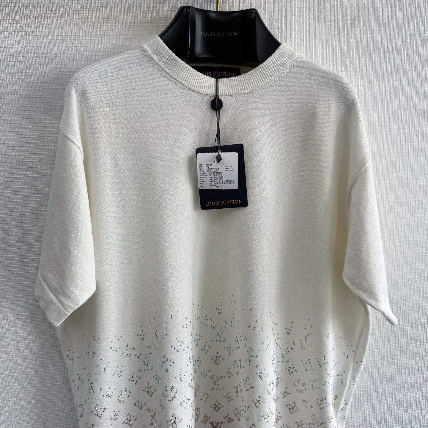 1v25ss Monogram烫钻针织T恤 精梳棉质圆领上衣参照原版进行1:1颜色打色 色最终效果高达98%以上 100%全精梳棉纱 衣服两侧锯齿位置采用挂毛嵌花方式 比平常T字型短袖多了2倍时间 才可做到原版效果 衣服人工手数花型 1针1线的画制花型出来效果100% size:xs/s/m/l