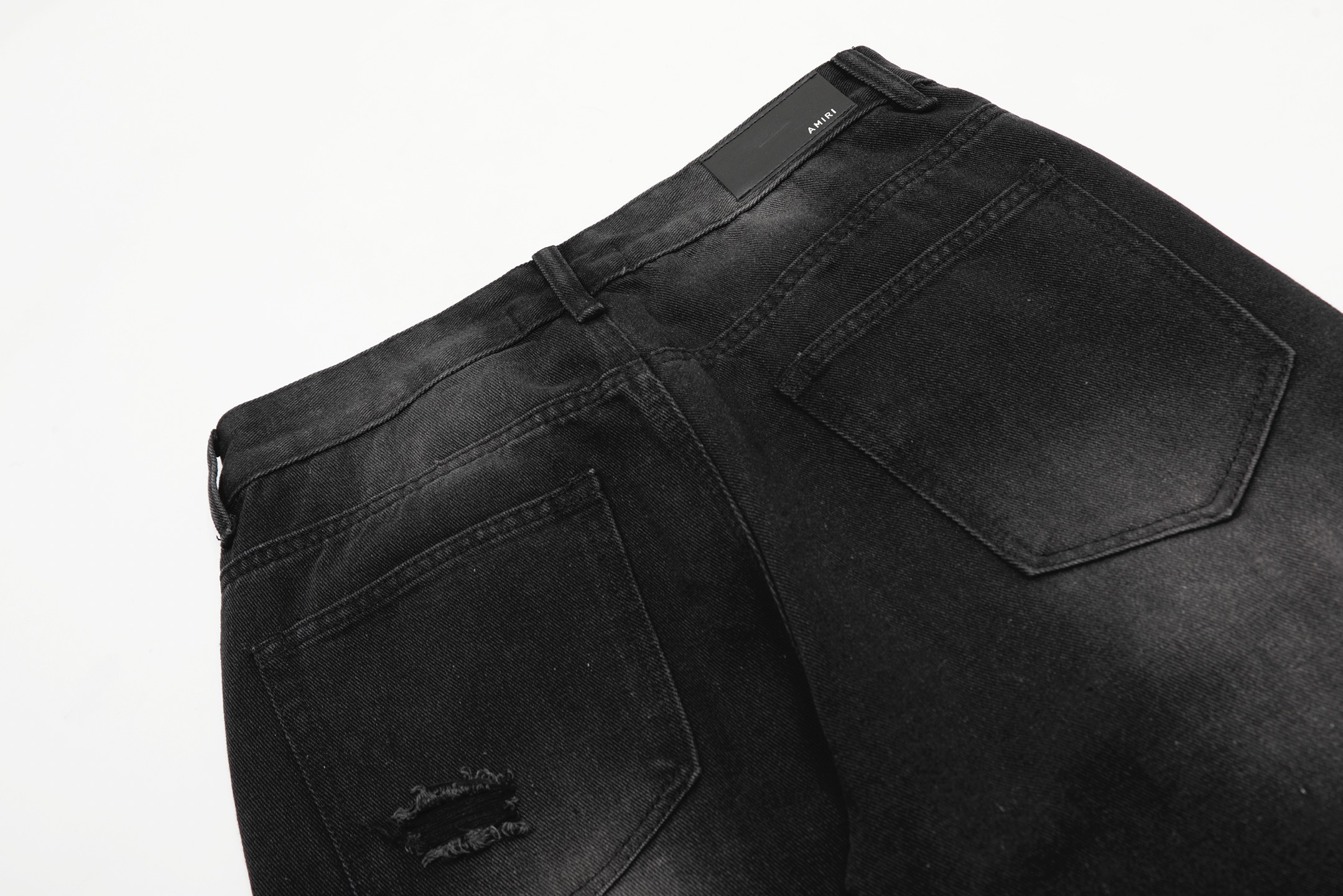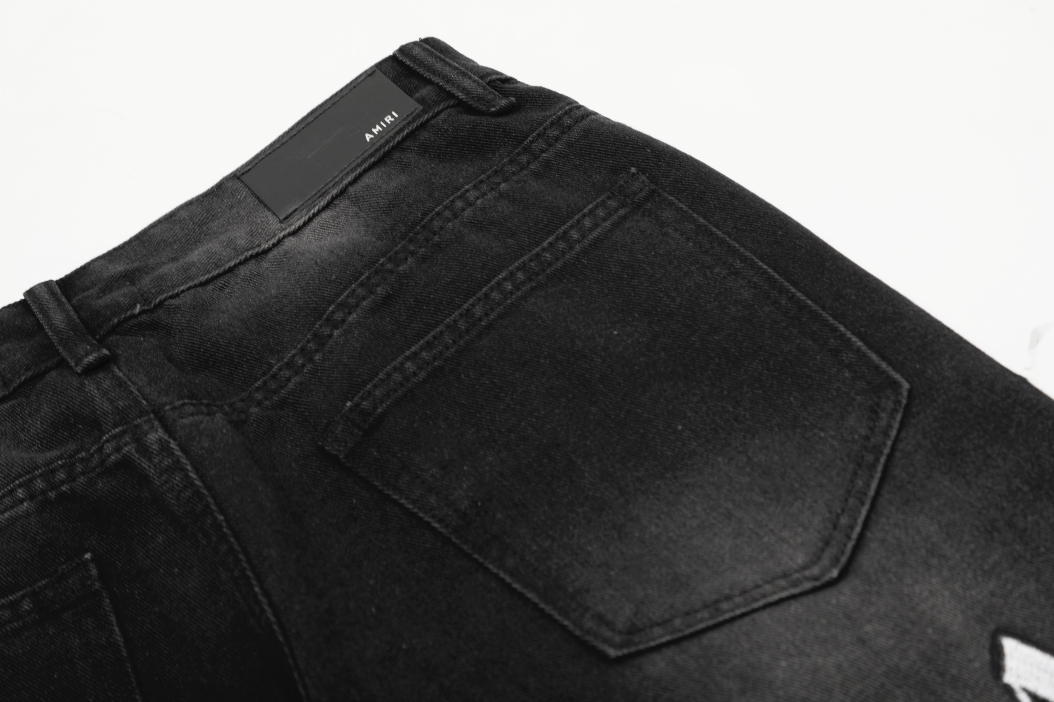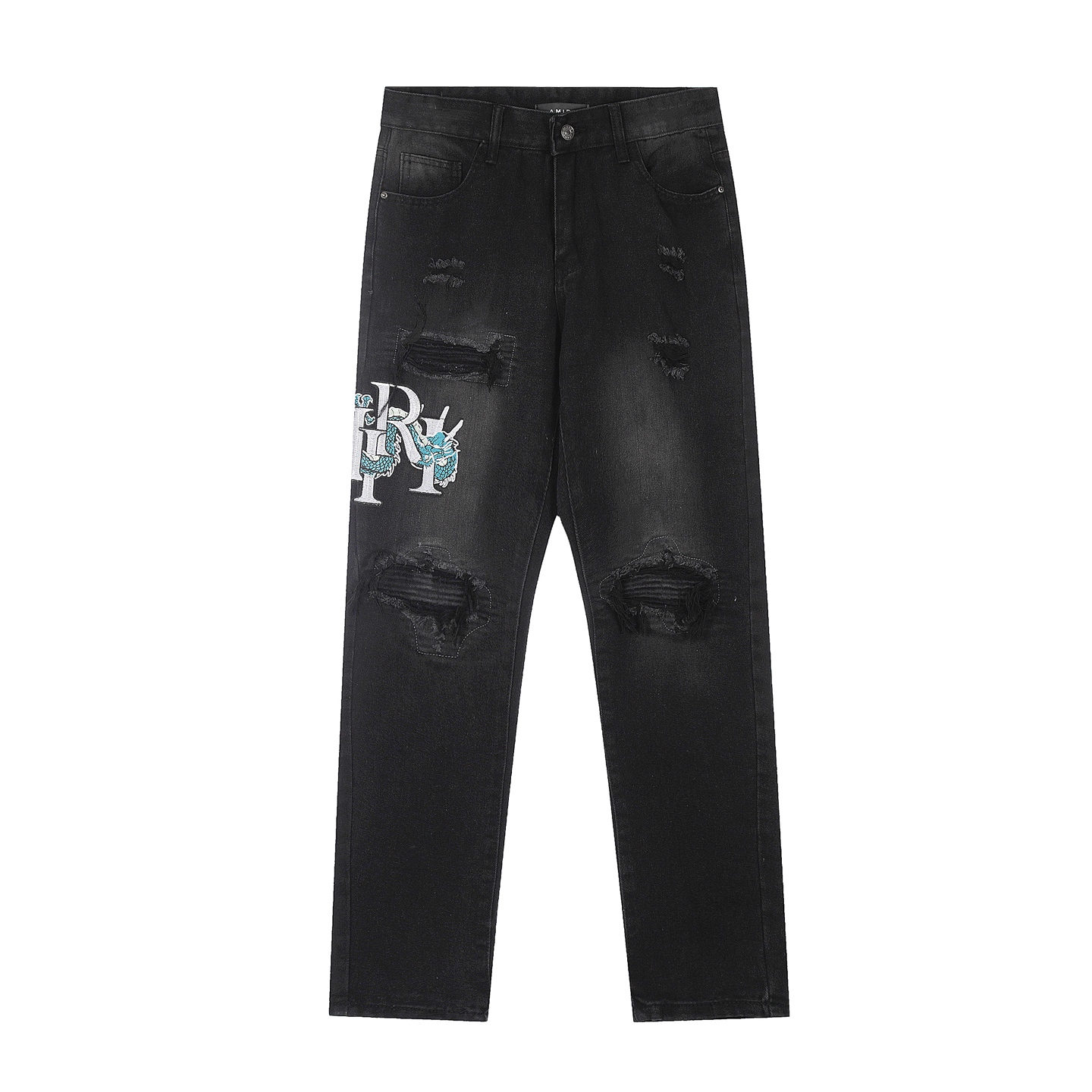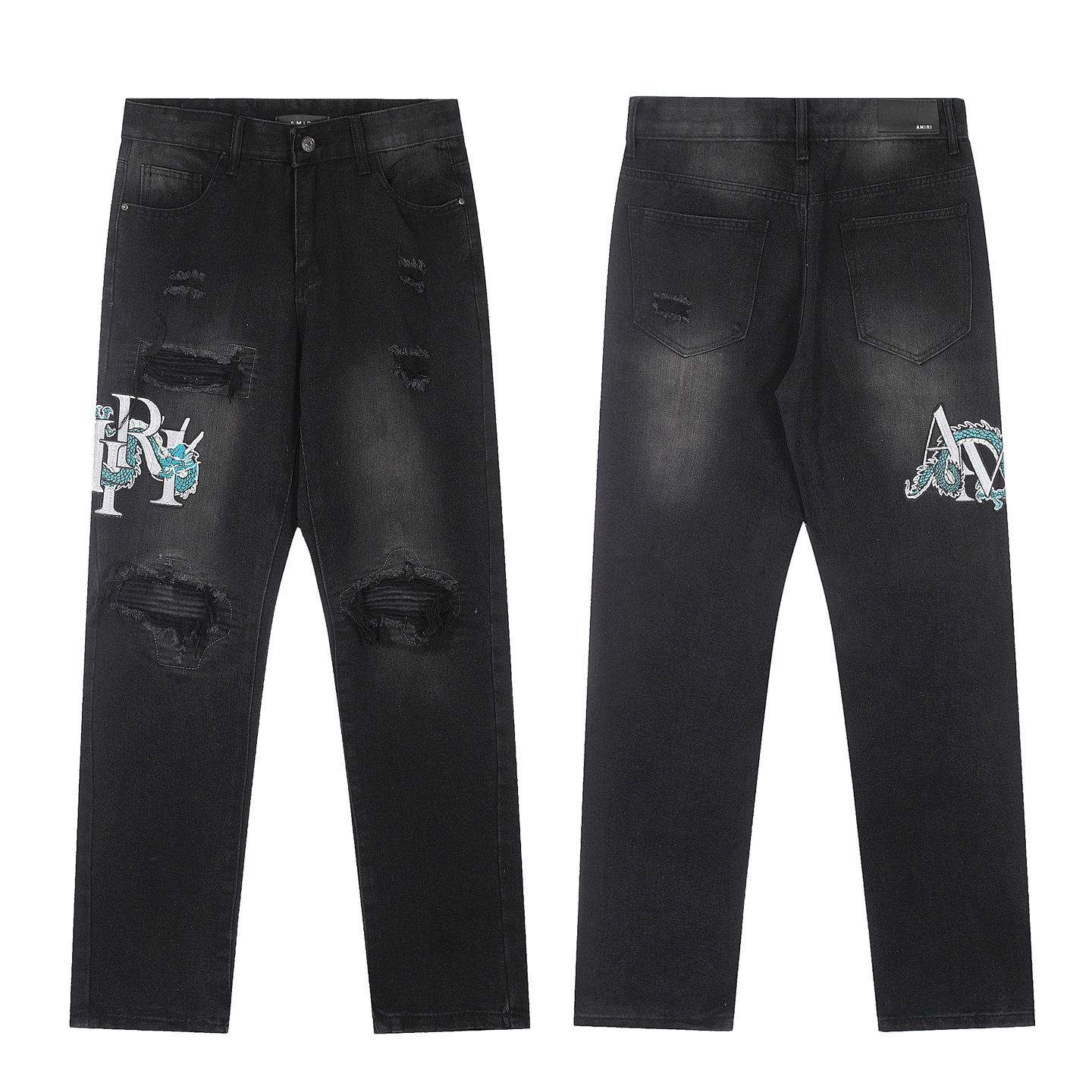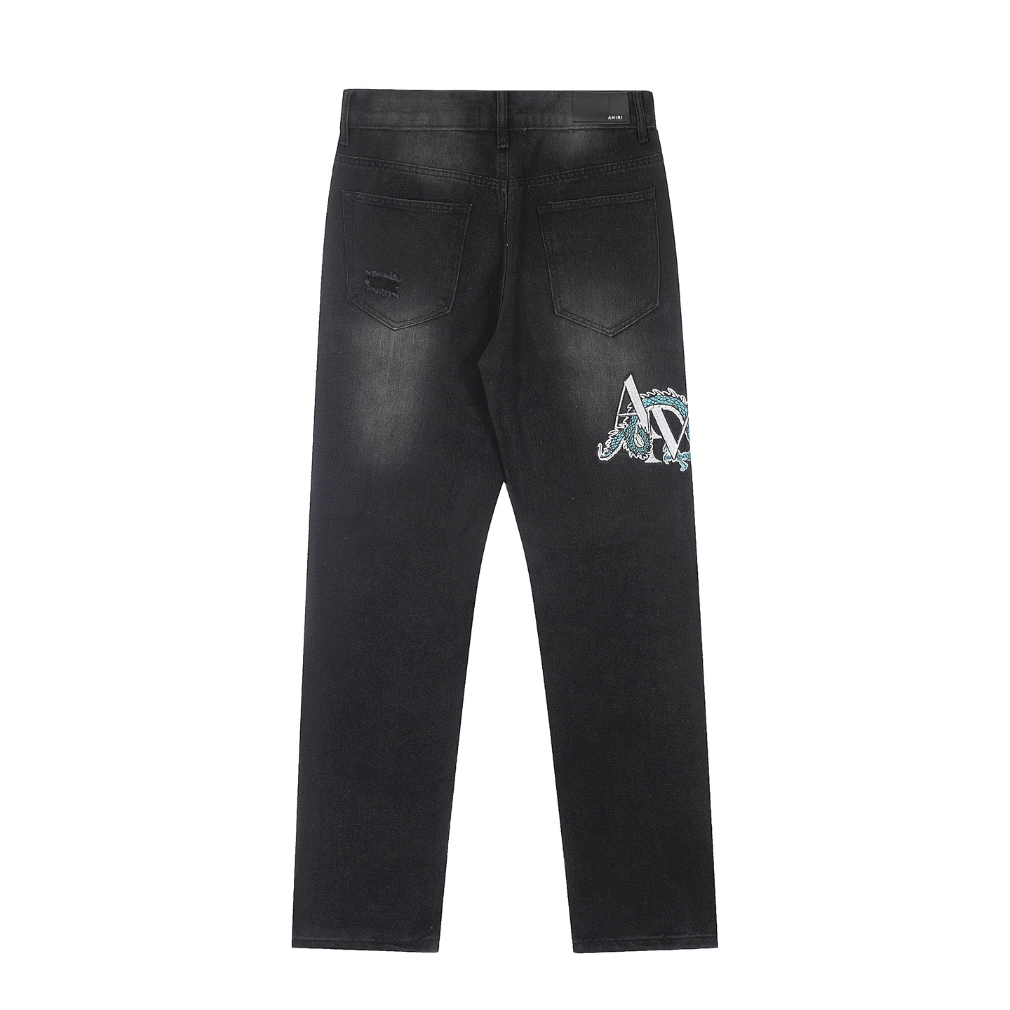 「D 」 Amiri经典字母刺绣贴补丁破洞水洗小脚牛仔裤修身小脚牛仔裤