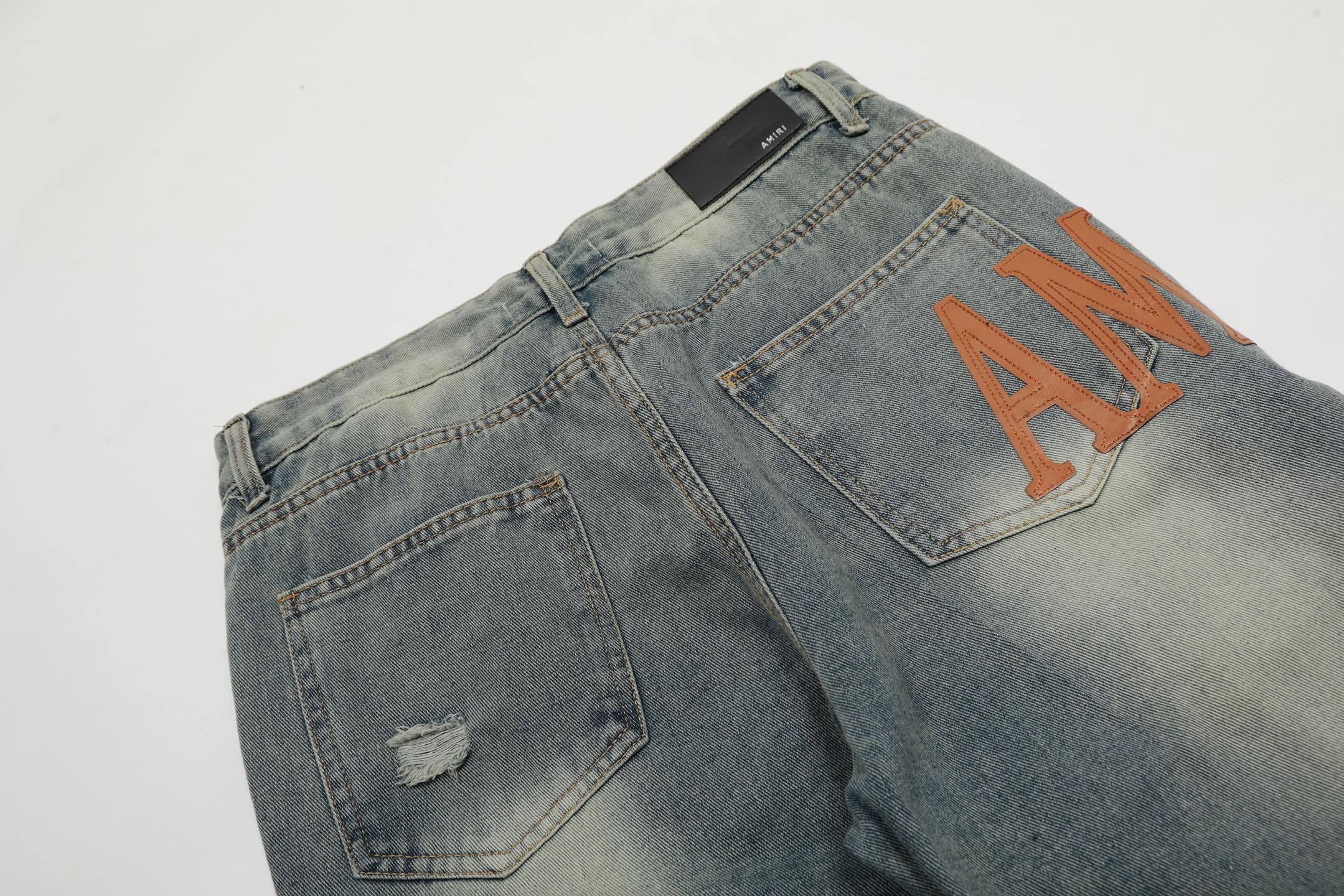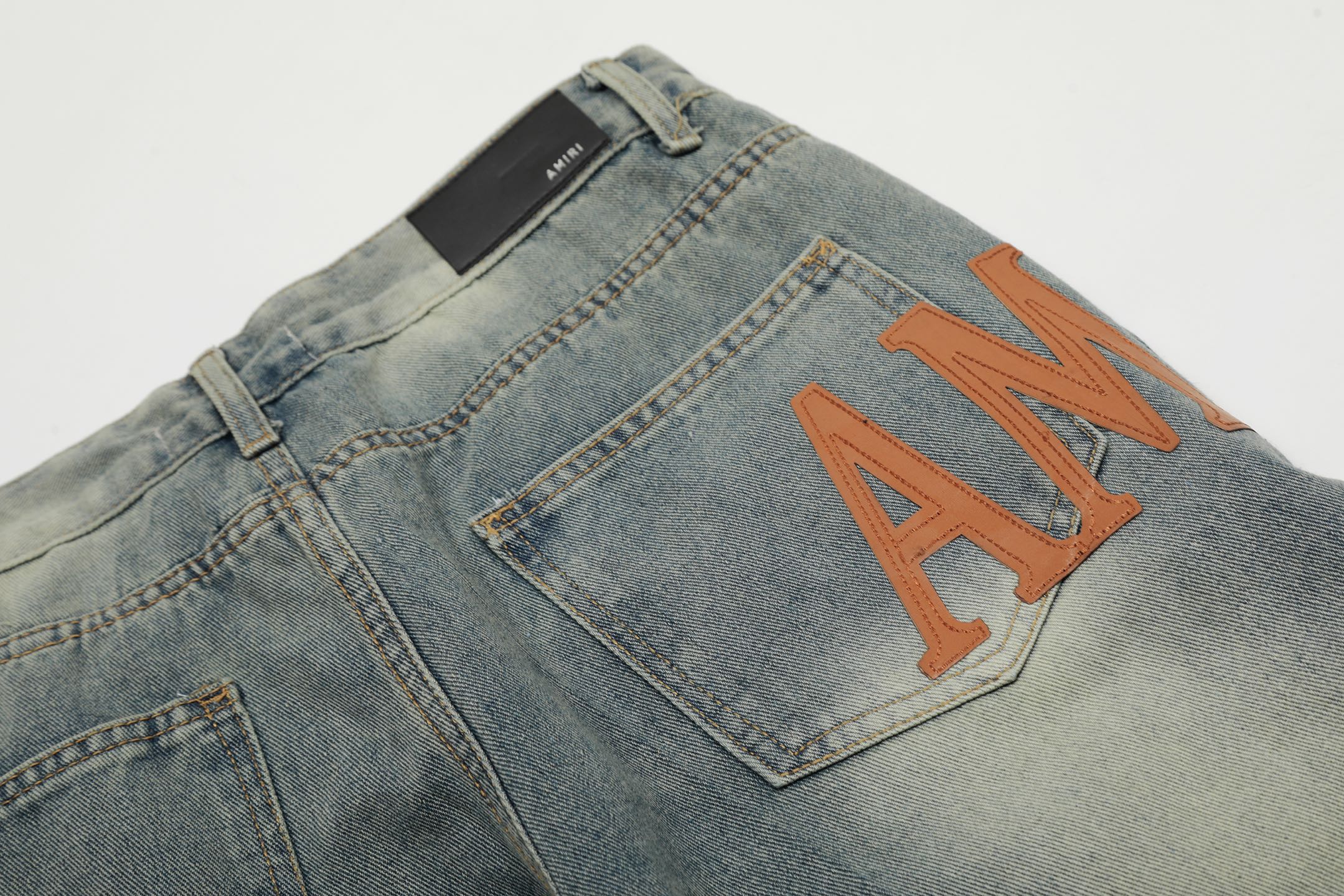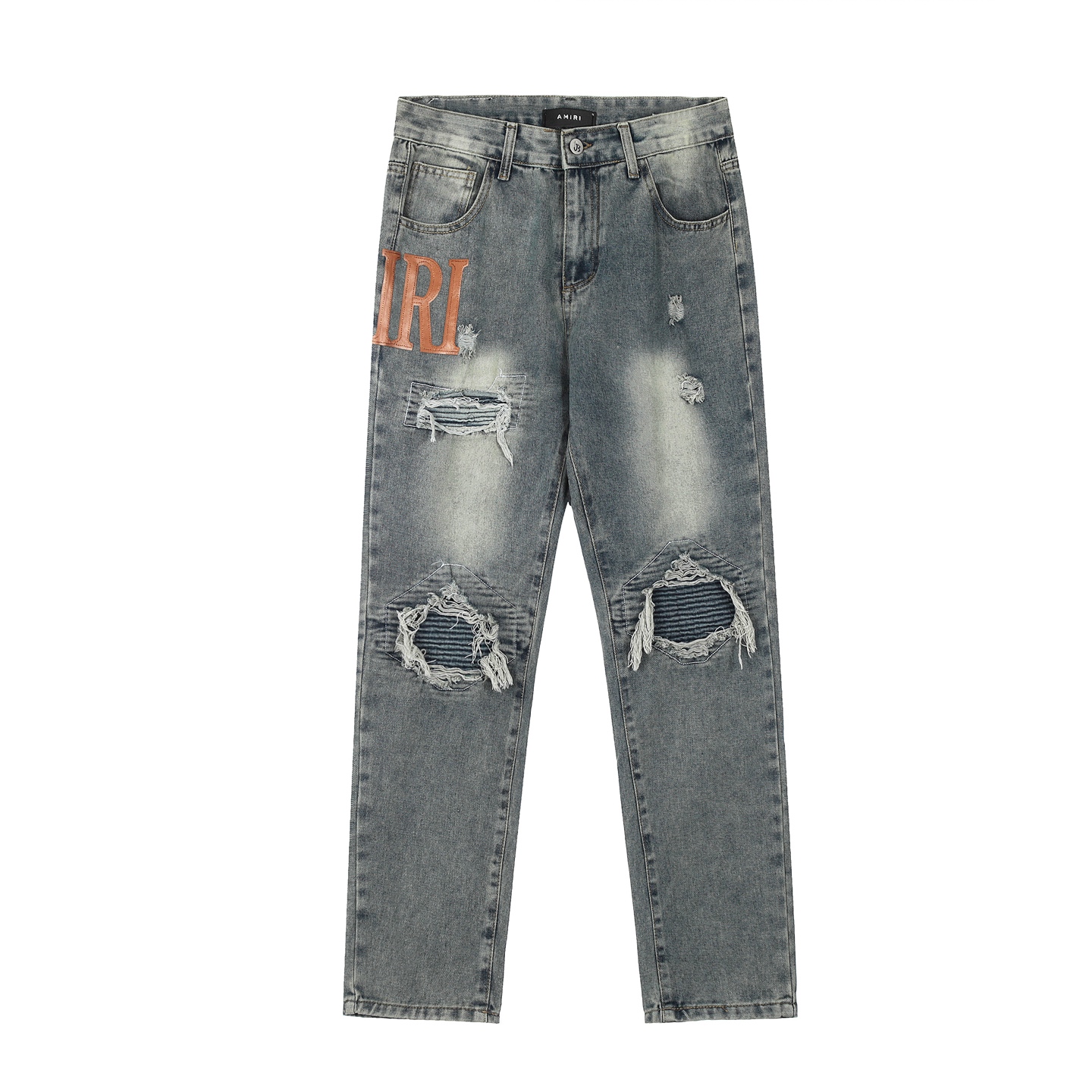 Amiri经典字母刺绣贴补丁破洞水洗小脚牛仔裤修身小脚牛仔裤