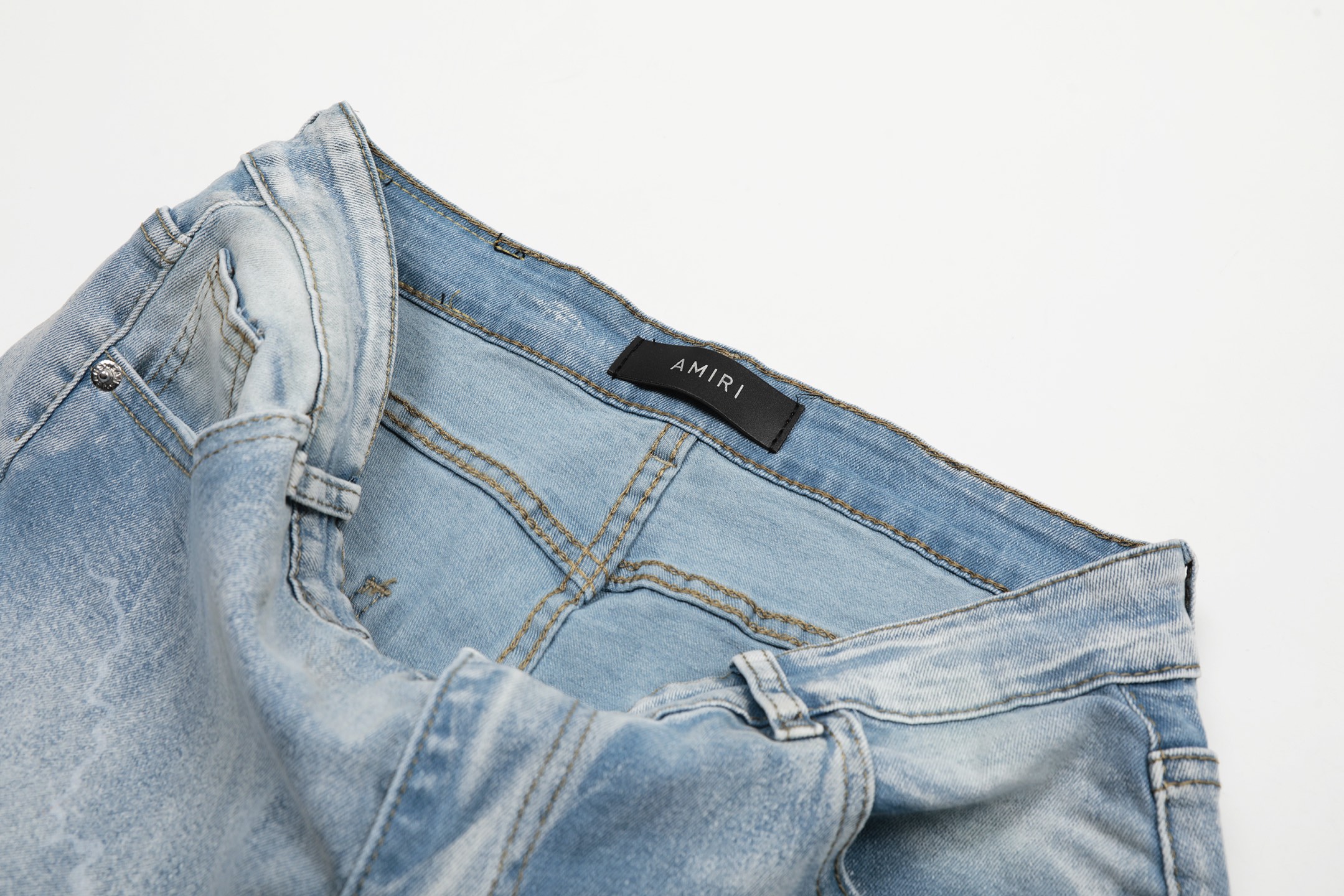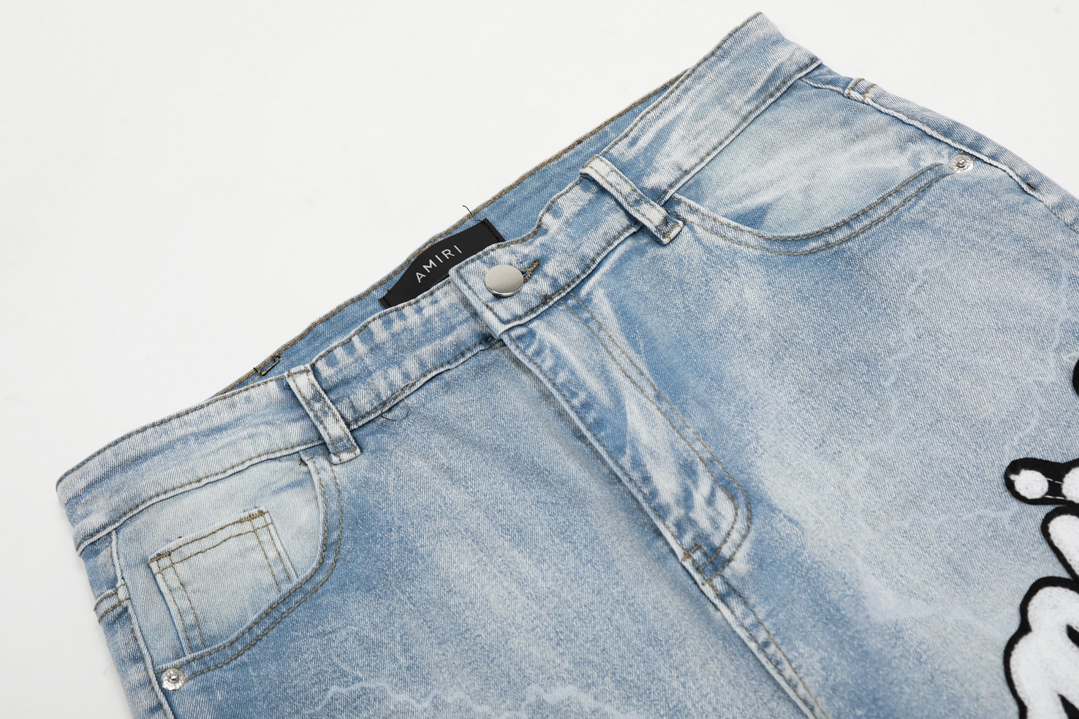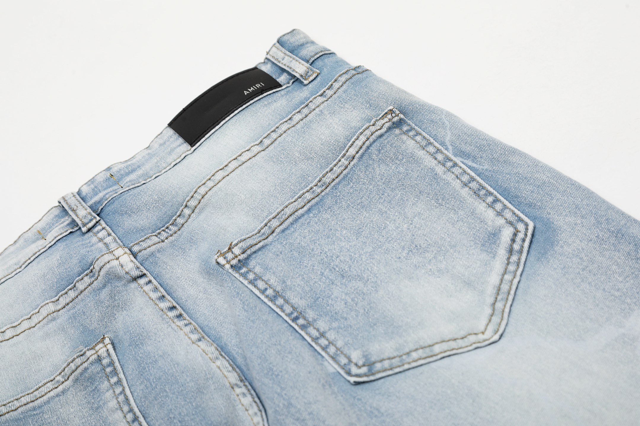 「D 」 AMIRI贴布刺绣 牛仔裤长裤 AMIRI高街基础破洞紧身弹力牛仔裤长裤 amiri品牌的牛仔裤打破的原有牛仔裤的制作工艺和裁剪,布料都比较柔软舒适 手工缝制领标 定制logo钮扣 真皮皮牌 颜色:蓝色 尺码:30-32-34-36