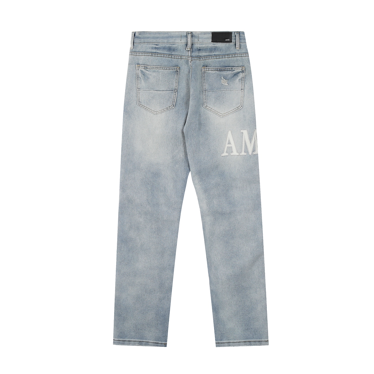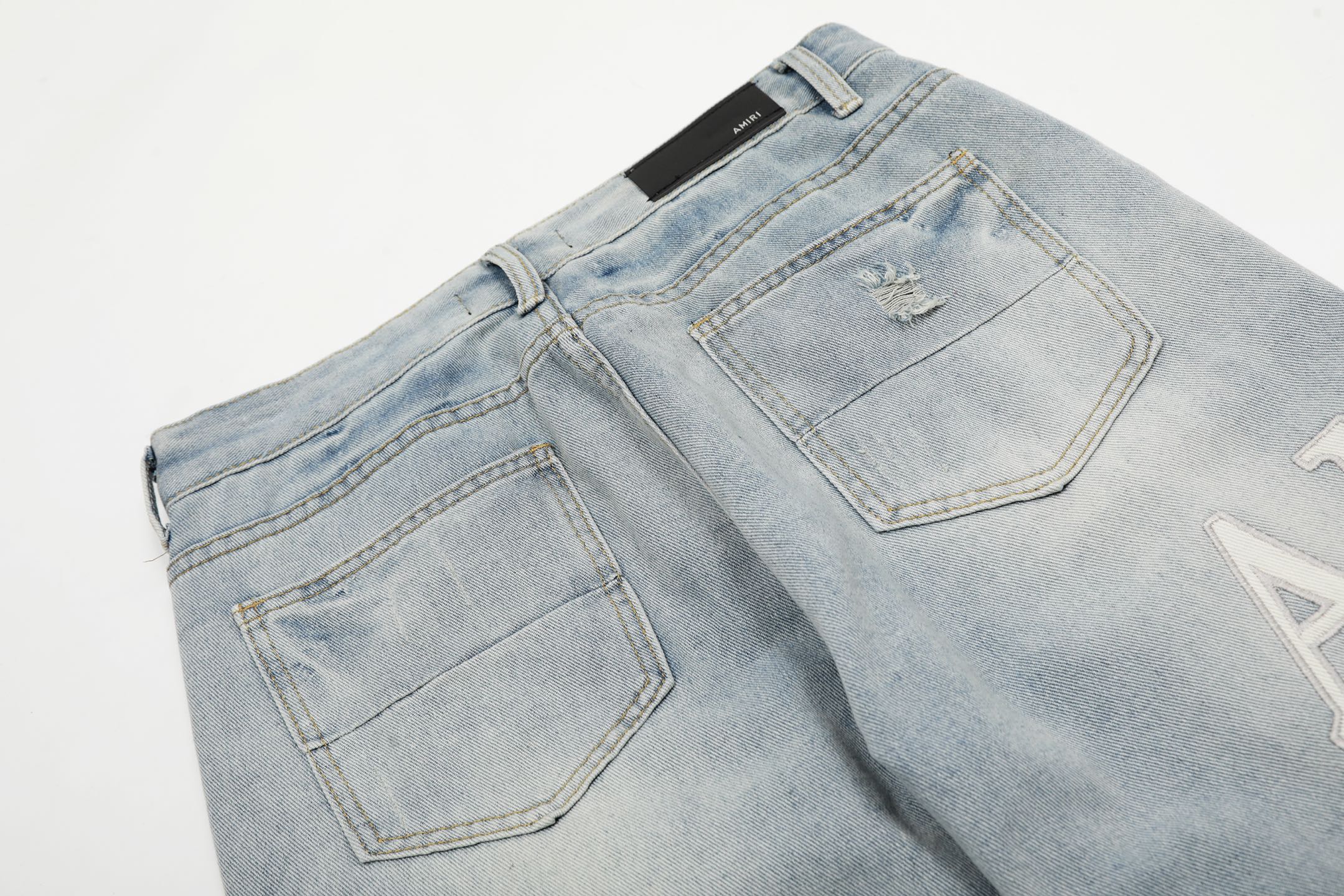 「D 」 AMIRI贴布刺绣 牛仔裤长裤 AMIRI高街基础破洞紧身弹力牛仔裤长裤 amiri品牌的牛仔裤打破的原有牛仔裤的制作工艺和裁剪,布料都比较柔软舒适 手工缝制领标 定制logo钮扣 真皮皮牌 颜色:蓝色 尺码:30-32-34-36