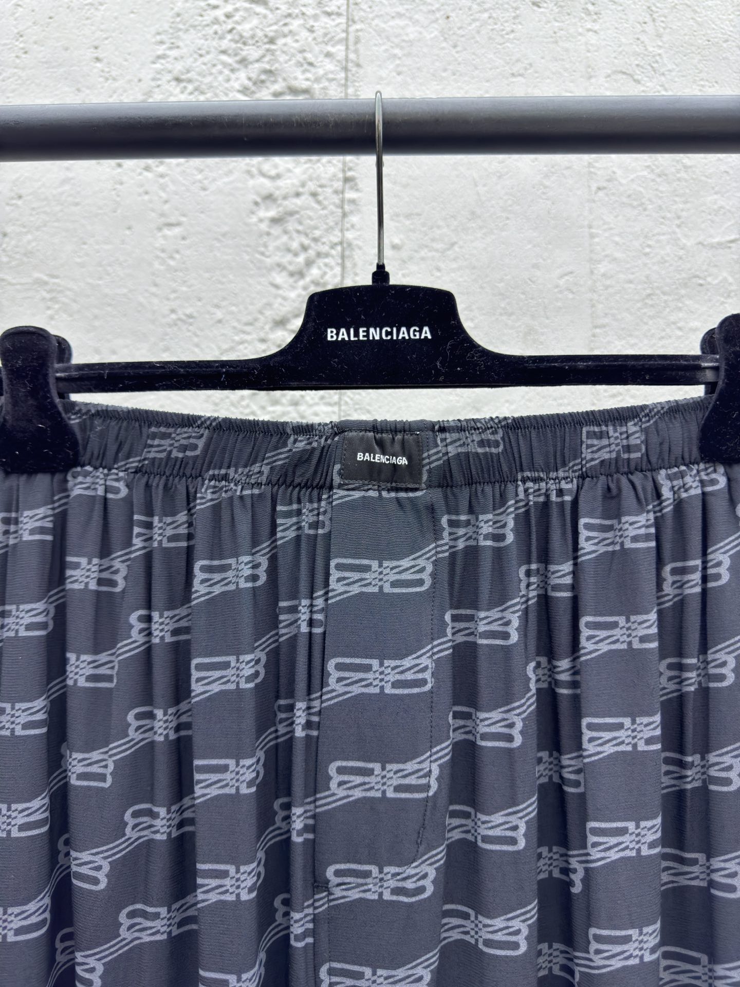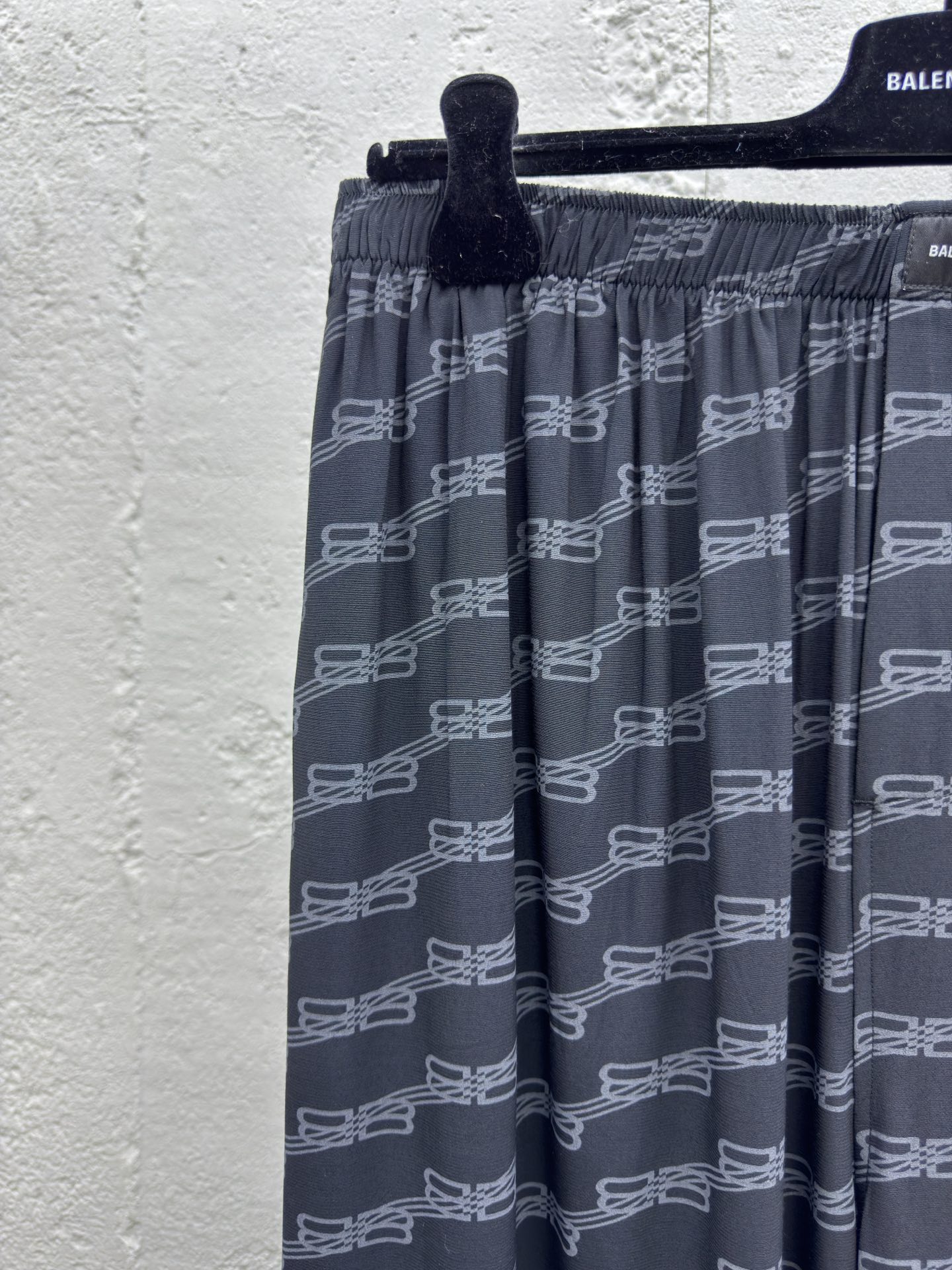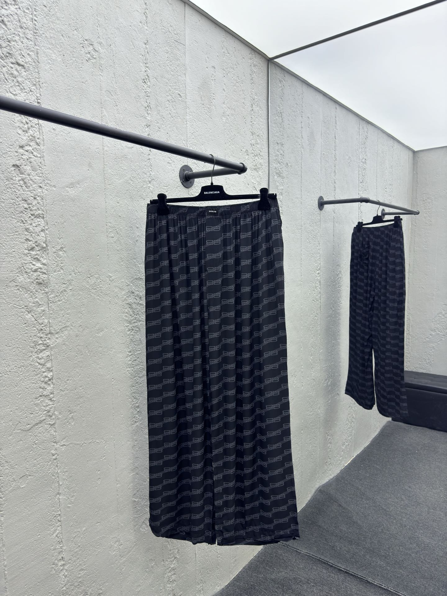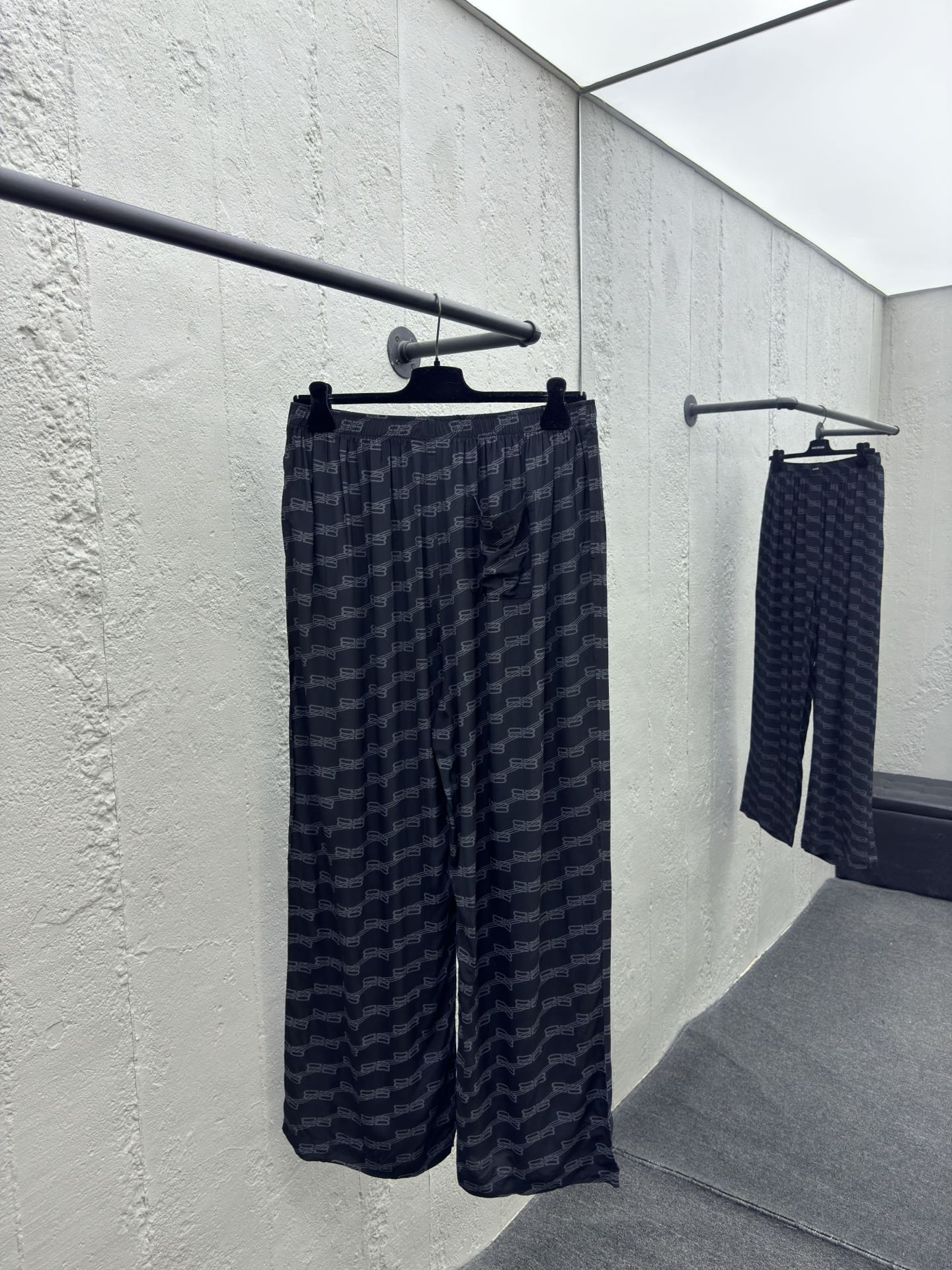 Balenciaga 斜锁扣双绉长裤 工艺说明:面料采用120D半消光人造丝顺雨皱面料,根据Y版打AB色样,订染大货面料,印花采用圆网胶浆涂料满幅印花,裤子后袋采用还原花手工裁剪,纸板口袋位置全部挖空,纸样铺摆在面料上比对裤筒花型位置画线,裁片与裤筒两者均打上编号,单件流裁剪极其耗费时间,前腰中贴黑色底白字母小标,内包4cm橡皮筋,腰头内里开止眼配本布腰绳,门筒配套天然贝壳白蝶贝激光刻字母焗色扣子。 ⚠️颜色:黑色 ⚠️Size:34/36/38/40