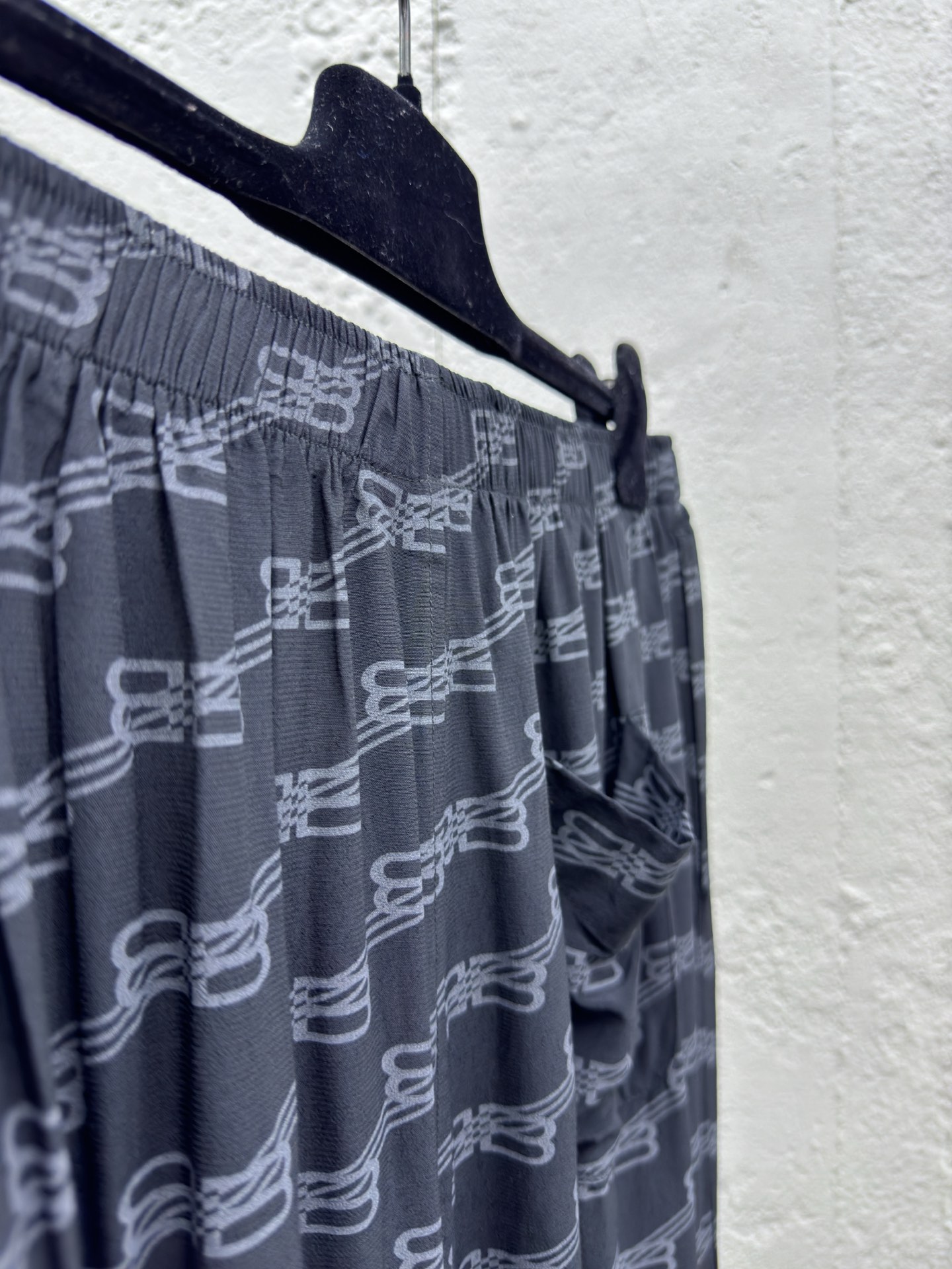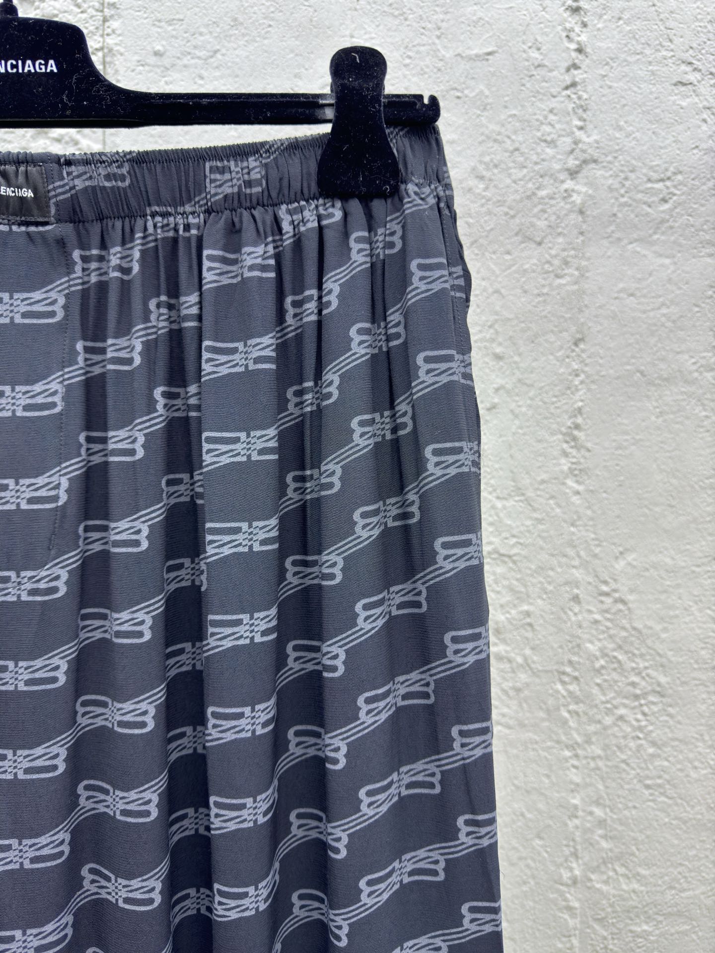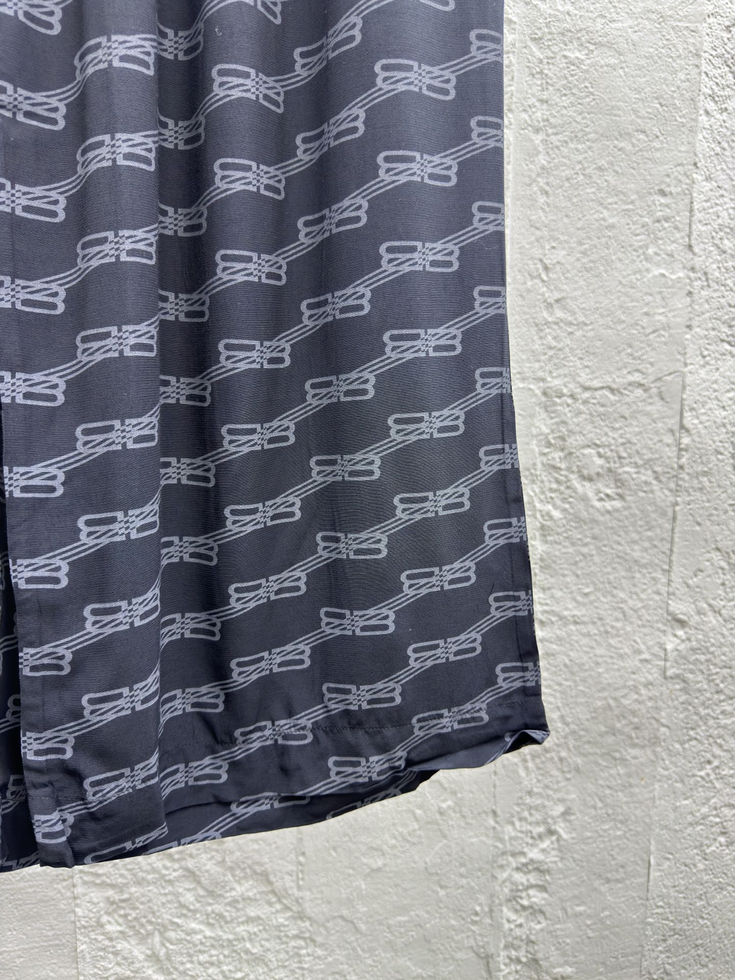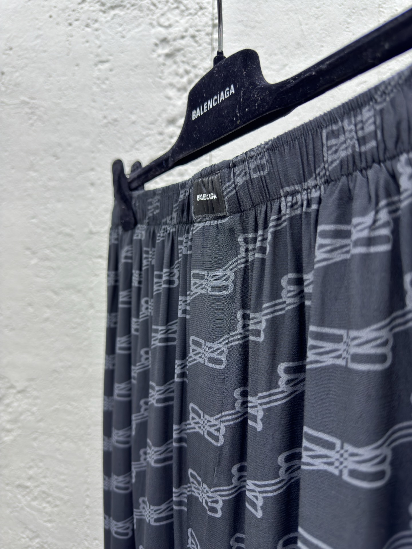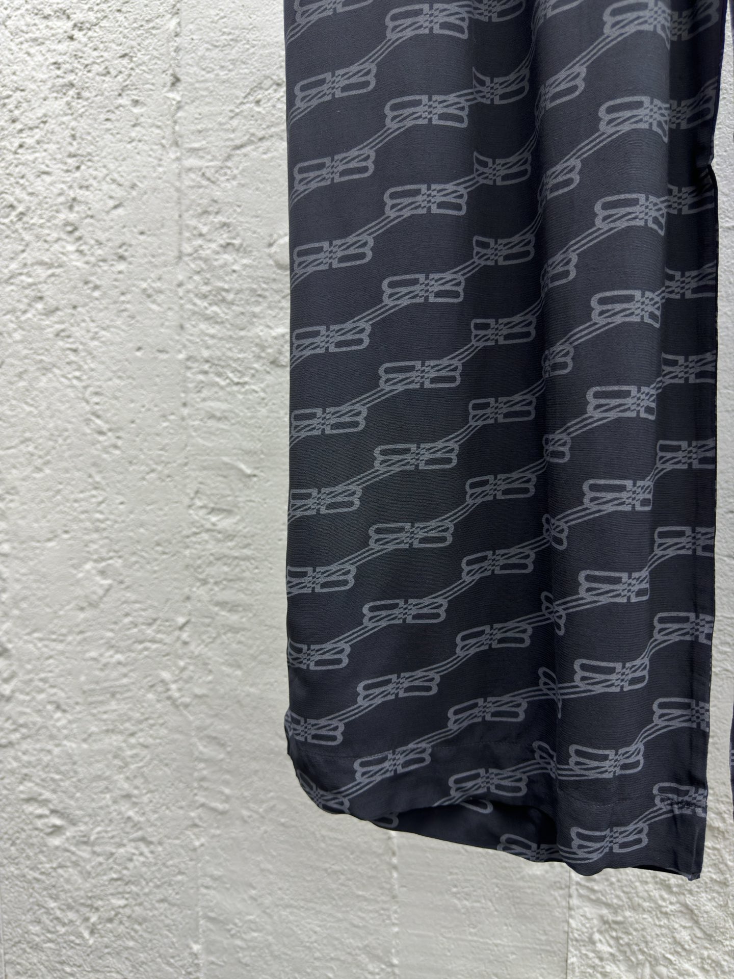 Balenciaga 斜锁扣双绉长裤 工艺说明:面料采用120D半消光人造丝顺雨皱面料,根据Y版打AB色样,订染大货面料,印花采用圆网胶浆涂料满幅印花,裤子后袋采用还原花手工裁剪,纸板口袋位置全部挖空,纸样铺摆在面料上比对裤筒花型位置画线,裁片与裤筒两者均打上编号,单件流裁剪极其耗费时间,前腰中贴黑色底白字母小标,内包4cm橡皮筋,腰头内里开止眼配本布腰绳,门筒配套天然贝壳白蝶贝激光刻字母焗色扣子。 ⚠️颜色:黑色 ⚠️Size:34/36/38/40