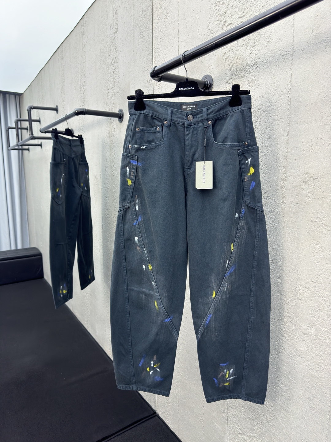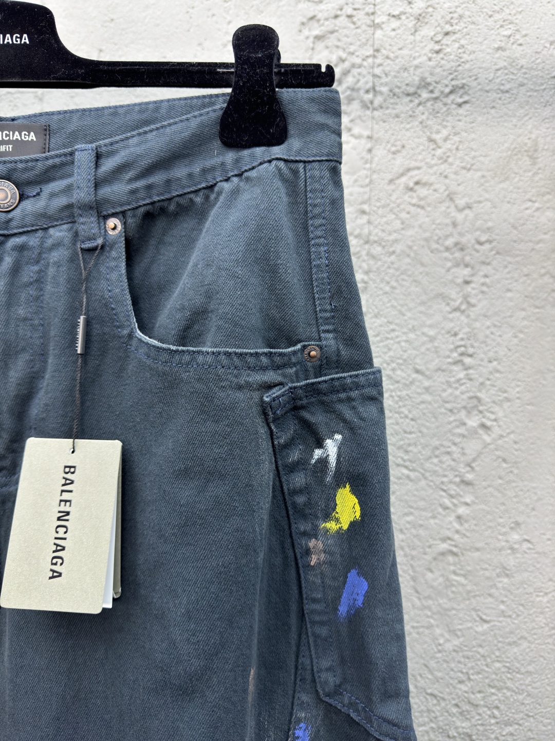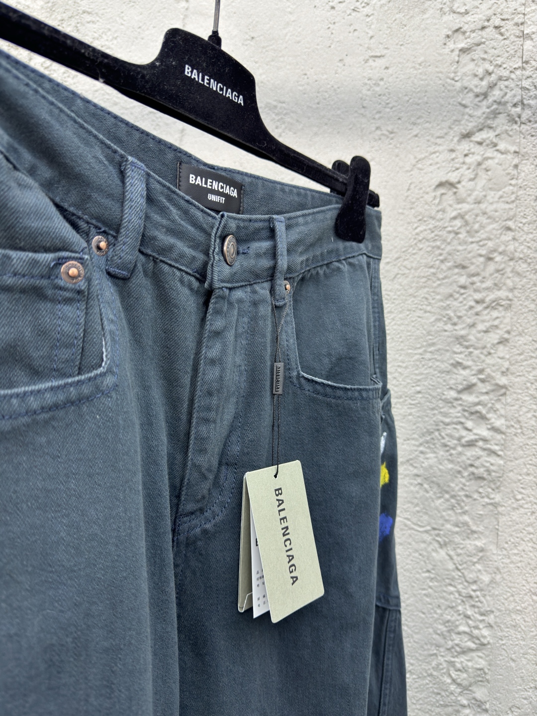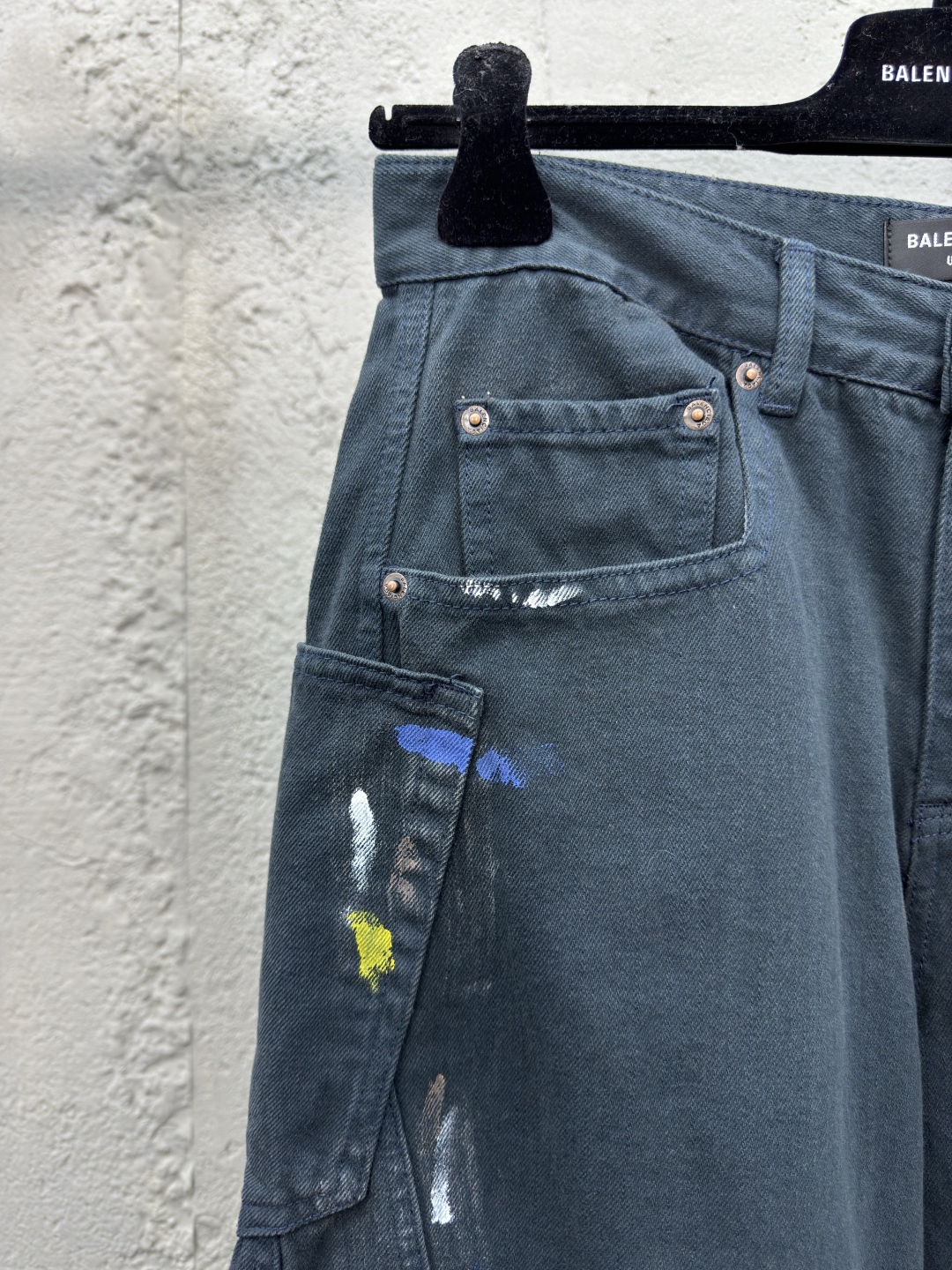 Balenciaga 泼墨牛仔工装裤 工艺说明:整体采用的阔腿版型设计,定制的牛仔面料与裁剪比普通工艺复杂很多调整了好多次进口的牛仔面料,面料水洗做旧后,再进行涂鸦,都是纯手工泼墨做旧涂浆做脏!很重工的一条牛仔裤!整体走线平直细腻,面料舒适柔软,颜色一致无色差 能与同款搭配营造时尚造型,驾驭各种场合,定制辅料,三标齐全,男女同款! ⚠️颜色:藏青色 ⚠️Size:XS/S/M/L