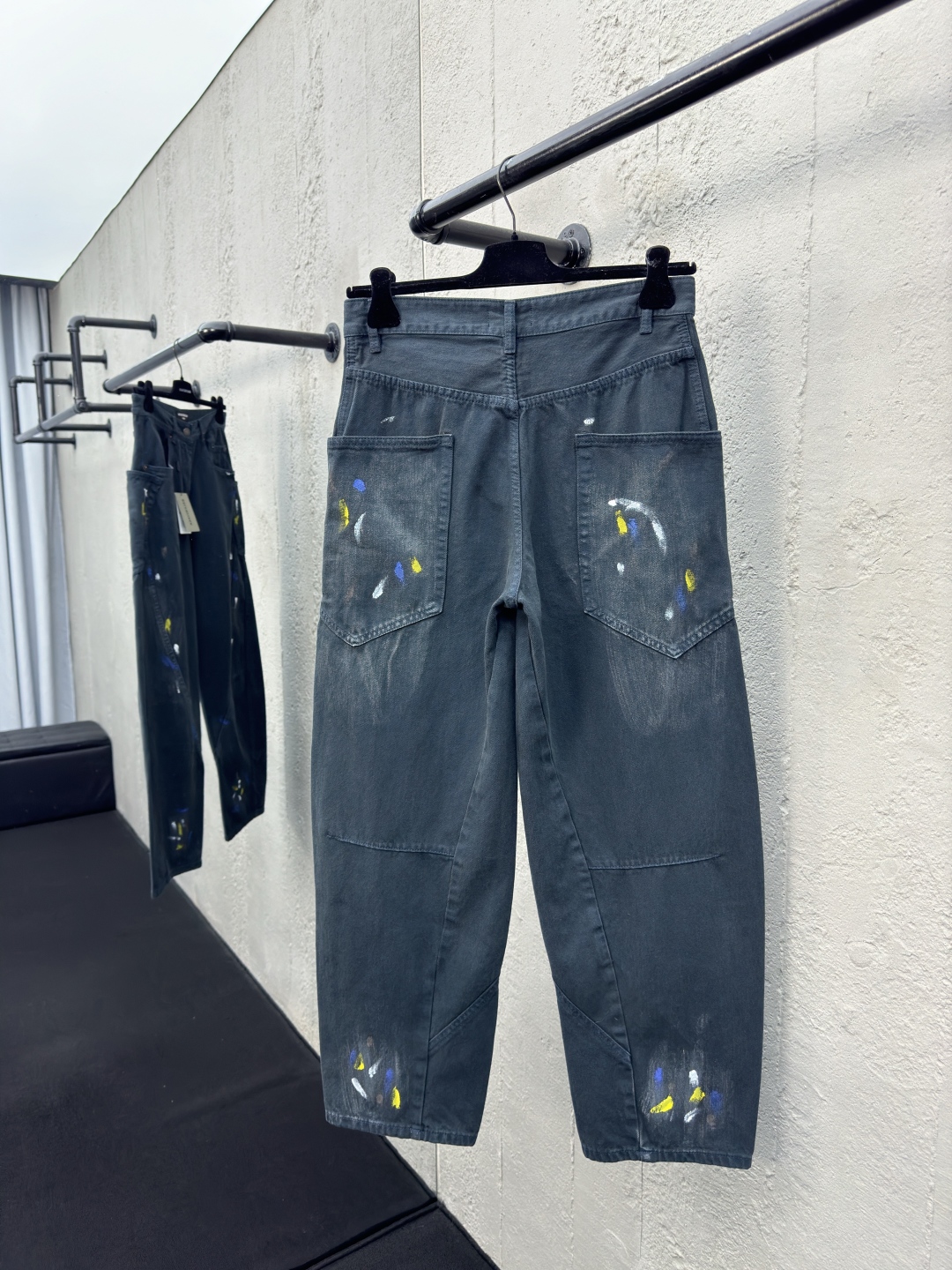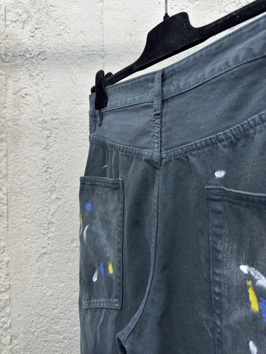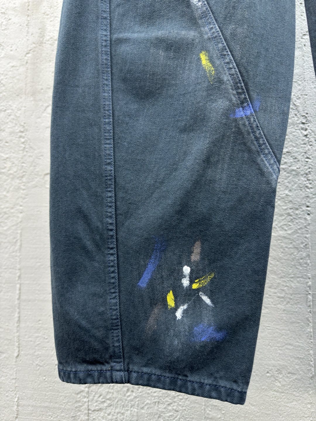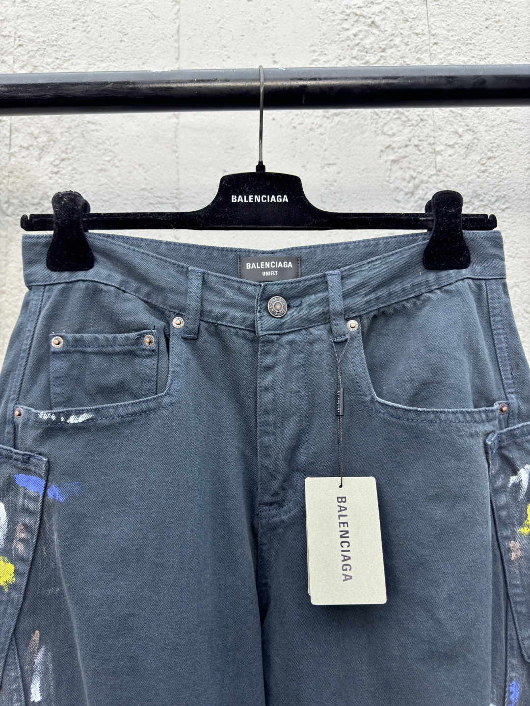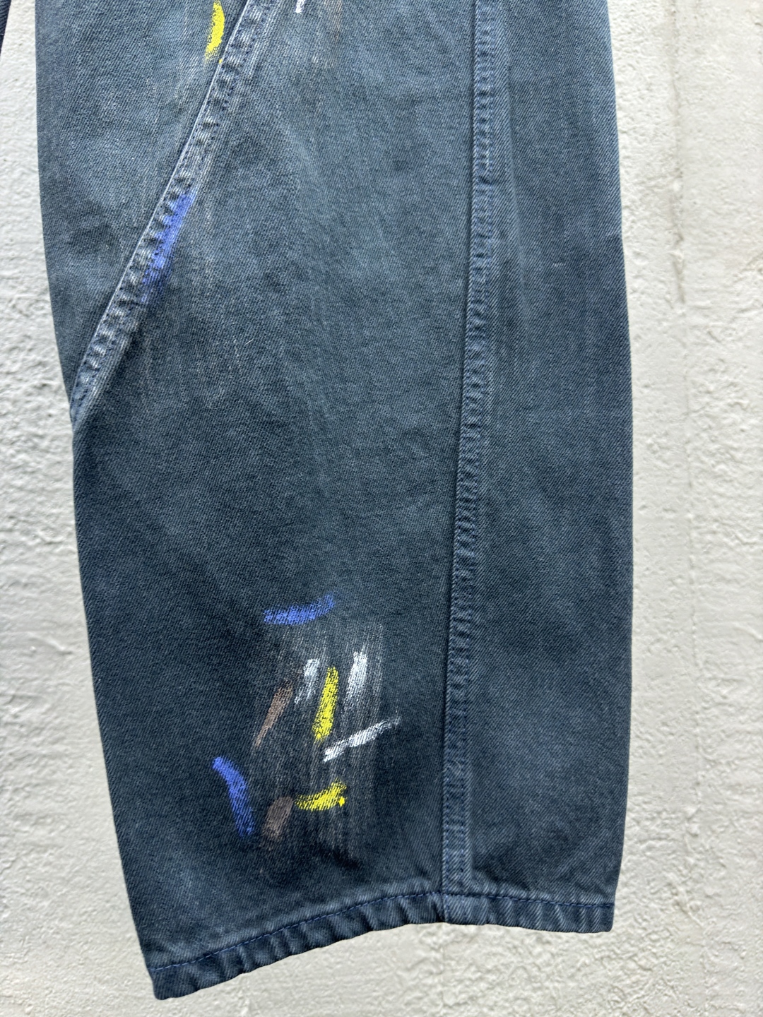 Balenciaga 泼墨牛仔工装裤 工艺说明:整体采用的阔腿版型设计,定制的牛仔面料与裁剪比普通工艺复杂很多调整了好多次进口的牛仔面料,面料水洗做旧后,再进行涂鸦,都是纯手工泼墨做旧涂浆做脏!很重工的一条牛仔裤!整体走线平直细腻,面料舒适柔软,颜色一致无色差 能与同款搭配营造时尚造型,驾驭各种场合,定制辅料,三标齐全,男女同款! ⚠️颜色:藏青色 ⚠️Size:XS/S/M/L