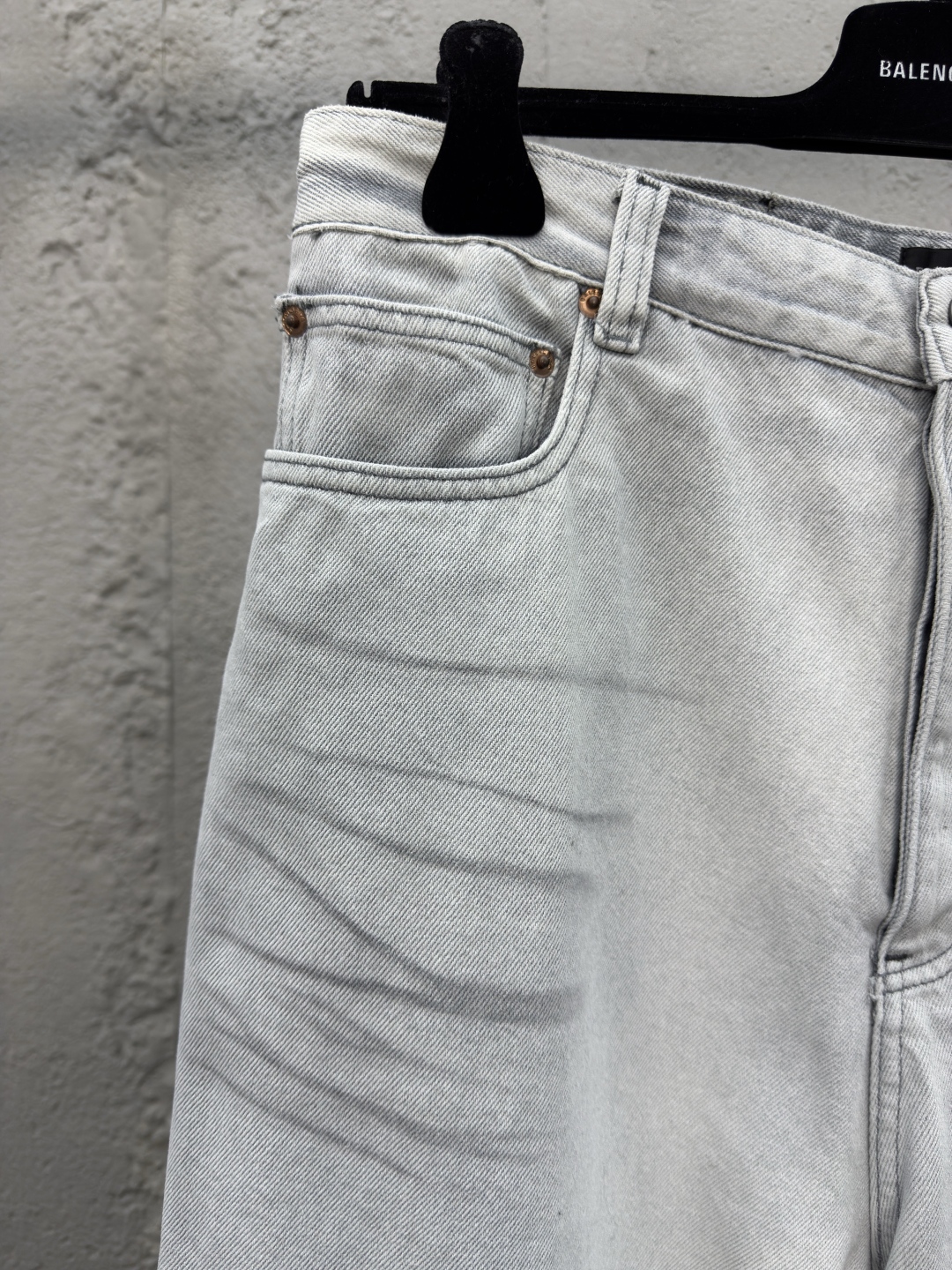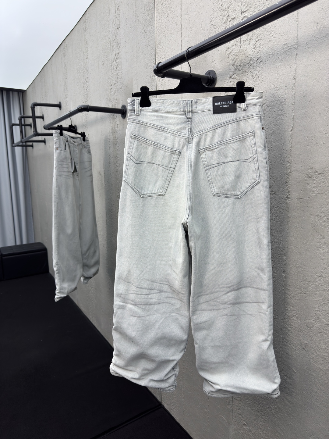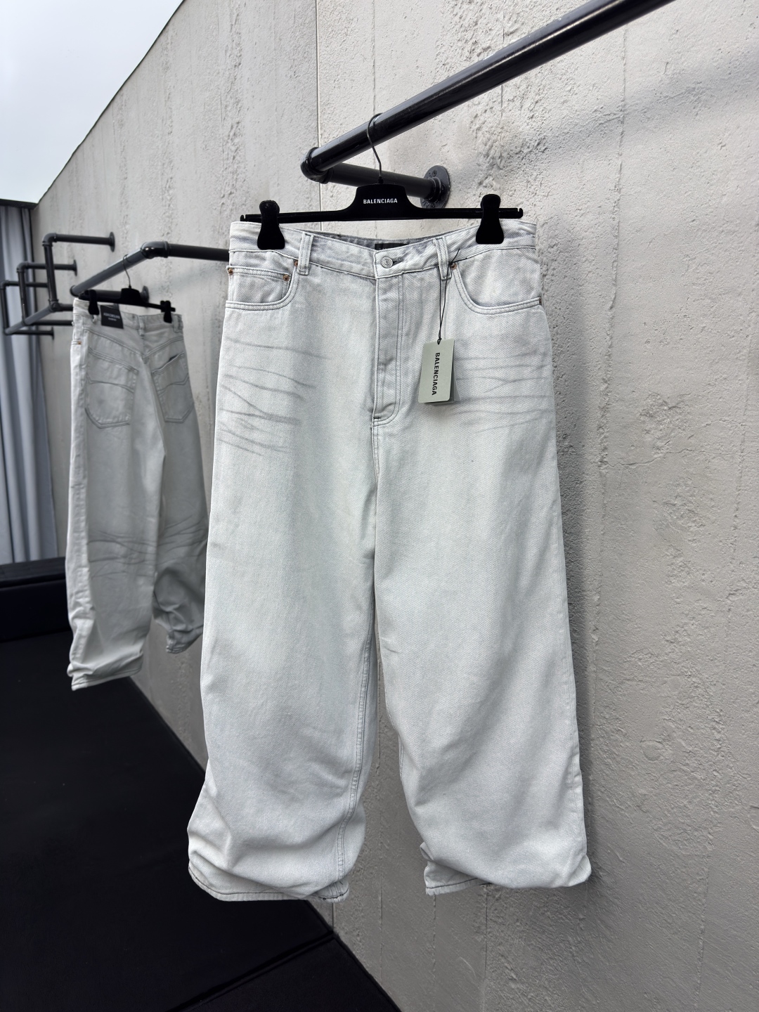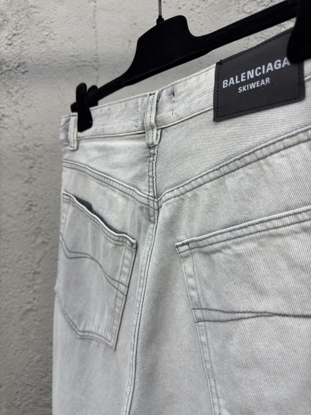 Balenciaga 滑雪系列加绒牛仔长裤 工艺说明:斜纹11.5oz面料,先做一遍洗水脱浆,洗出底色之后,做人工定位猫须+褶皱,注意后面两处裤脚都是翻起来的 (跟原版一样)此处的褶皱抓的很重,做完这些之后还要喷色刷蜡,相当于给整条裤子做涂层,摸上去有阻塞感还有蜡感在的,整体走线平直细腻,面料舒适柔软,颜色一致无色差 能与同款搭配营造时尚造型,驾驭各种场合,定制辅料,三标齐全,男女同款! ⚠️颜色:银白色 ⚠️Size:30/31/32/33/34