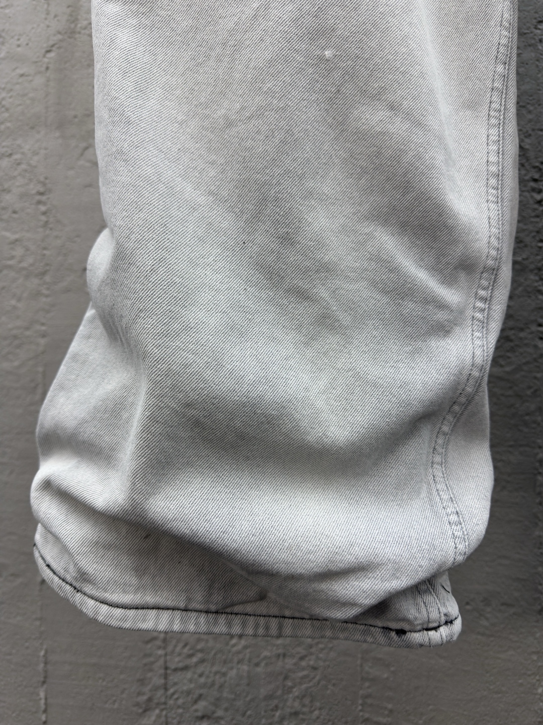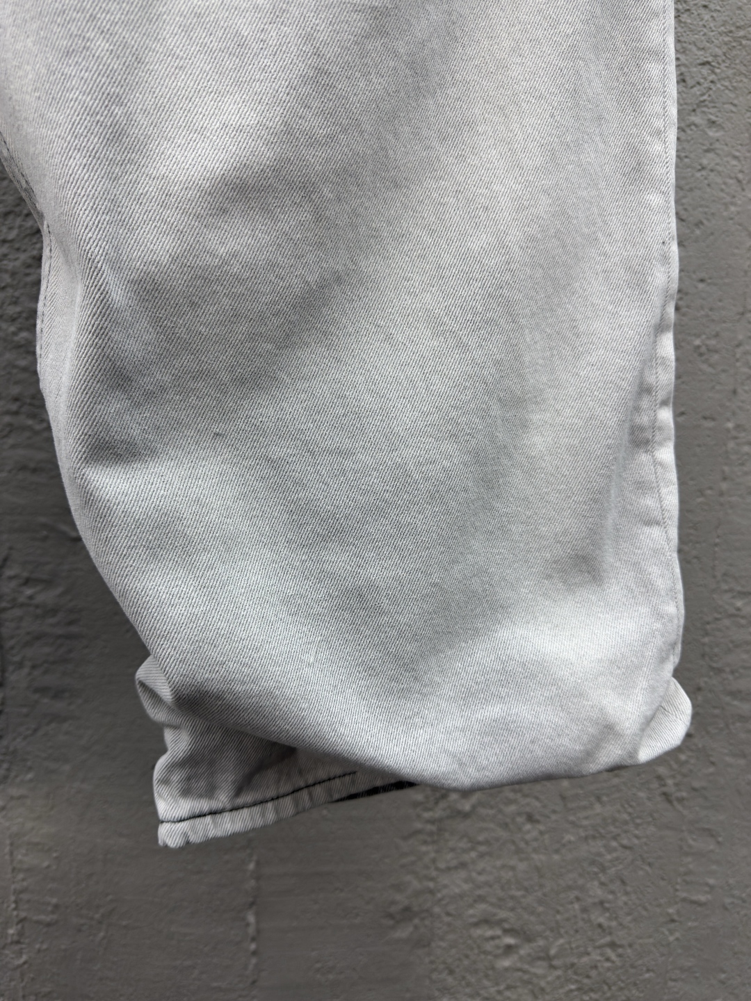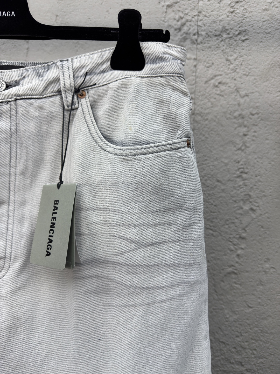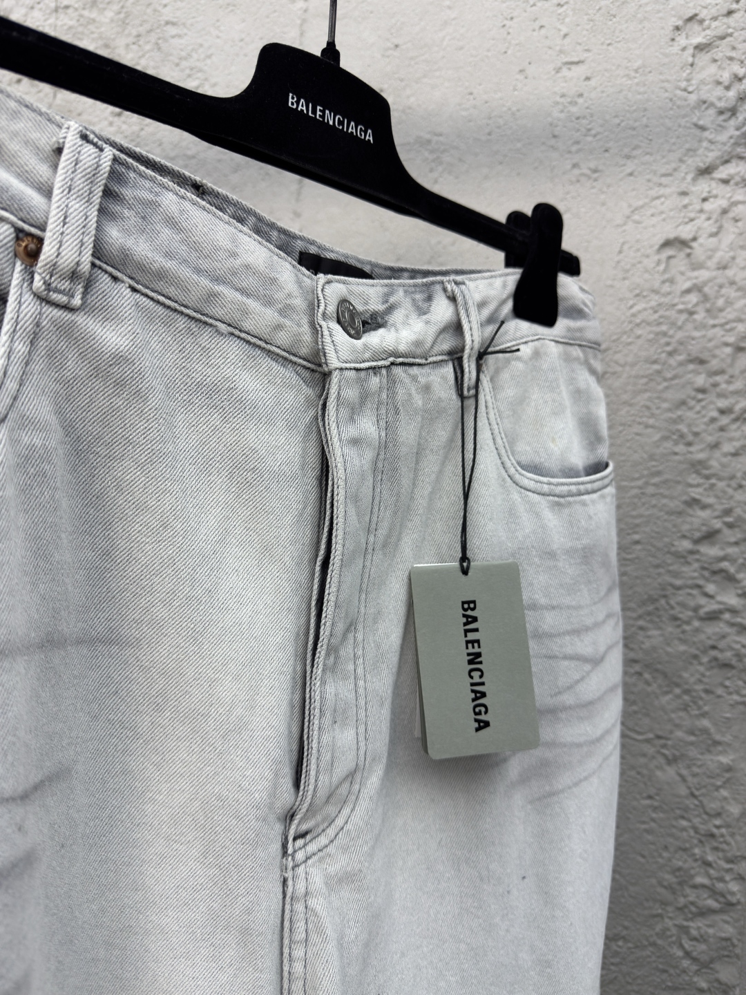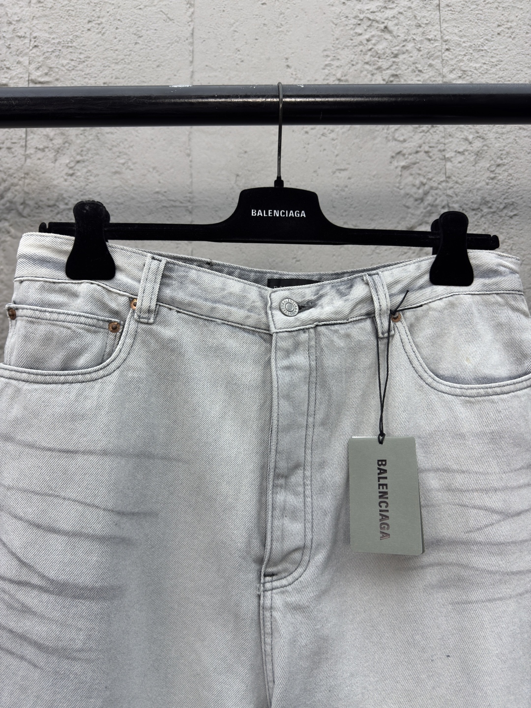 Balenciaga 滑雪系列加绒牛仔长裤 工艺说明:斜纹11.5oz面料,先做一遍洗水脱浆,洗出底色之后,做人工定位猫须+褶皱,注意后面两处裤脚都是翻起来的 (跟原版一样)此处的褶皱抓的很重,做完这些之后还要喷色刷蜡,相当于给整条裤子做涂层,摸上去有阻塞感还有蜡感在的,整体走线平直细腻,面料舒适柔软,颜色一致无色差 能与同款搭配营造时尚造型,驾驭各种场合,定制辅料,三标齐全,男女同款! ⚠️颜色:银白色 ⚠️Size:30/31/32/33/34