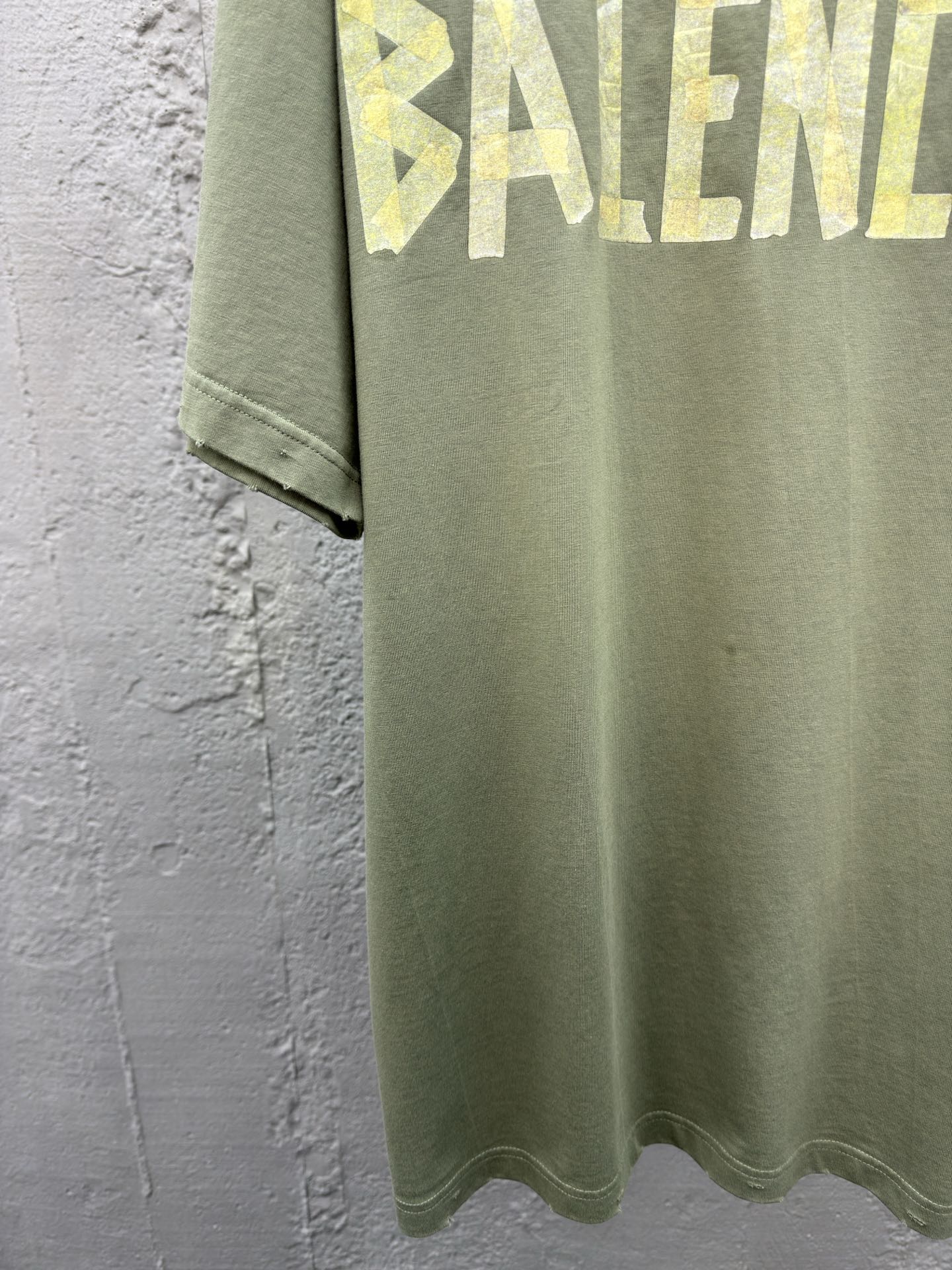 Balenciaga 美纹纸胶带T恤 工艺说明: 袖子以及下摆采用磨烂效果 内里处理干净 无线头 无余边 肩部采用磨烂设计 车线平直 三针五线工艺 肩膀处内里带压条 面料采用做旧洗水磨毛工艺 领口部位磨烂破洞设计 罗纹面料定织定染色 颜色一致无色差 胸前运用美纹纸胶带字母 整体重工艺的工序 水洗面料 舒适柔软 磨损洗旧效果 背后字母采用人工对位用烫版定型做胶浆印花工艺 ⚠️颜色:绿色 ⚠️Size:XS/S/M/L