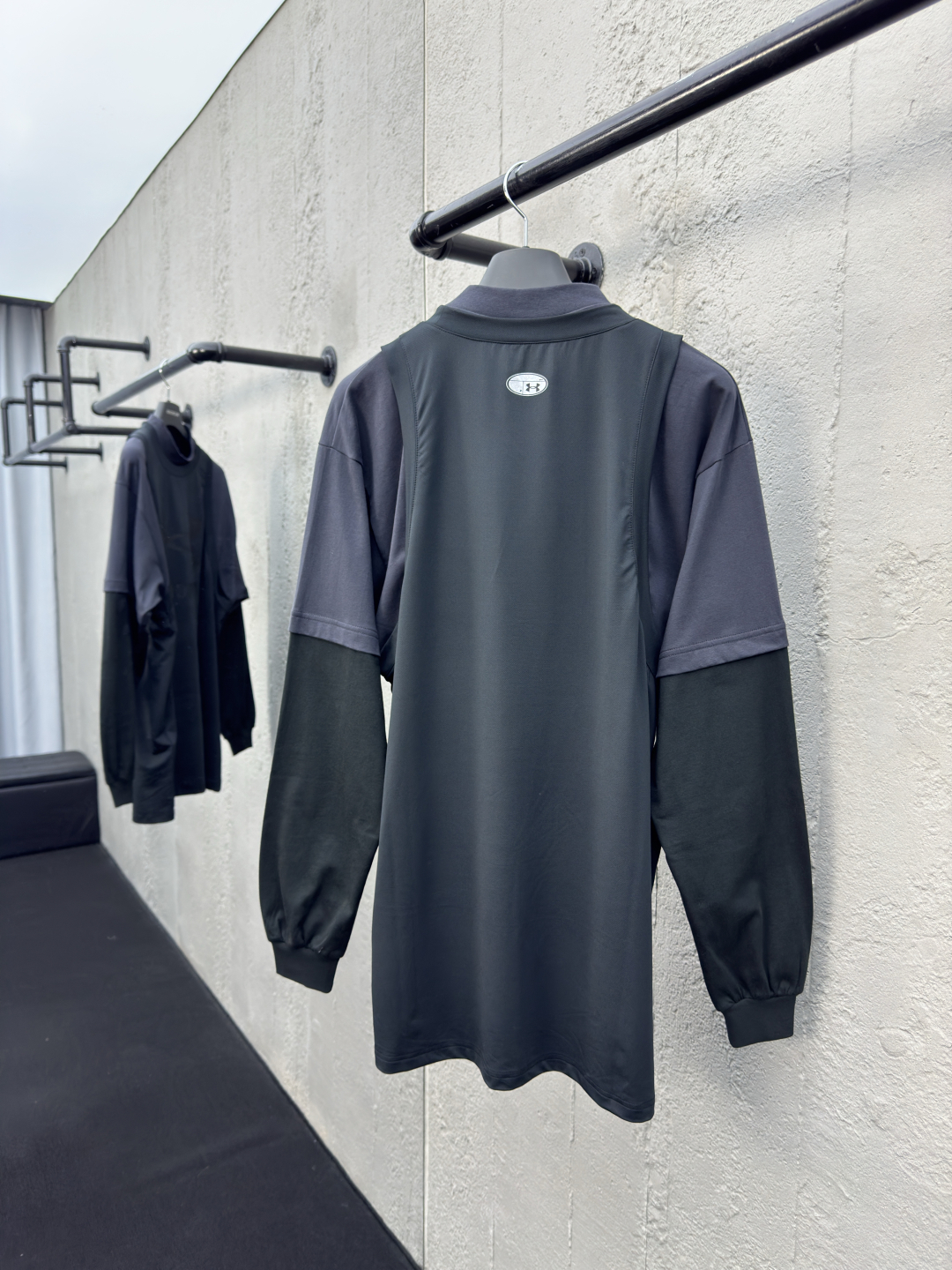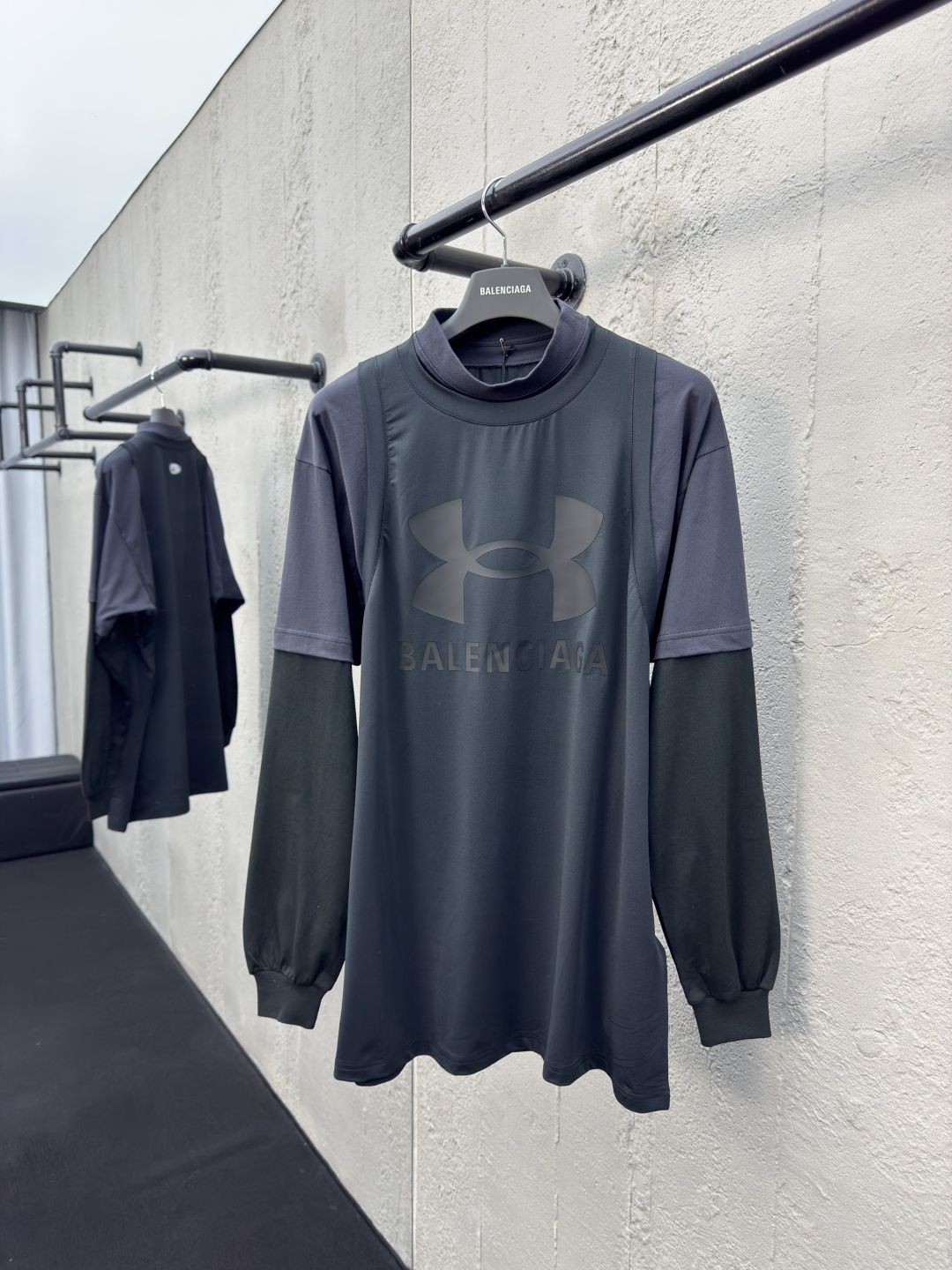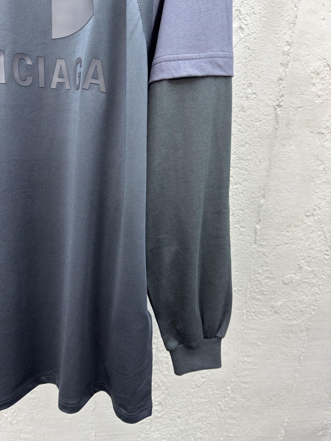 Balenciaga 假三件梭织运动长袖 工艺说明:采用定制棉质面料,前后胶印工艺,它的前后采用了胶印工艺,龟背印花小图案真的太有设计感了,胶印的图案清晰又牢固,独特假三件设计与灰黑拼接色:背心+短袖+长袖的独特假三件设计,整体走线平直细腻,面料舒适柔软,颜色一致无色差 能与同款搭配营造时尚造型,驾驭各种场合,定制辅料,三标齐全,男女同款! ⚠️颜色:黑色 ⚠️Size:S/M/L/XL