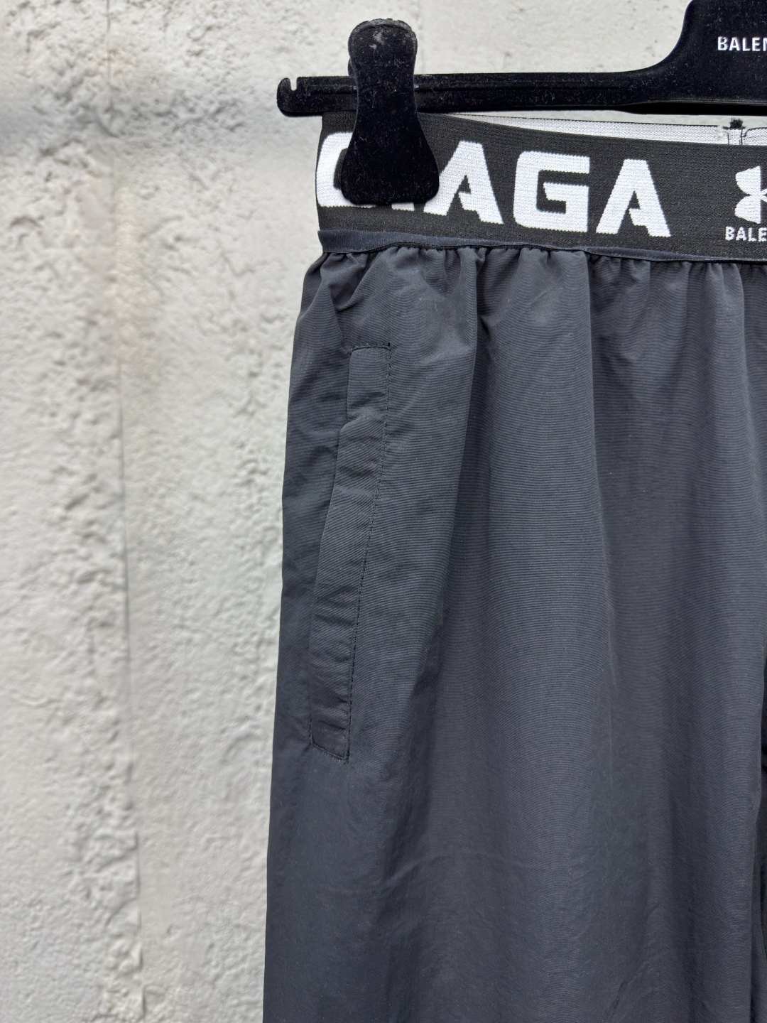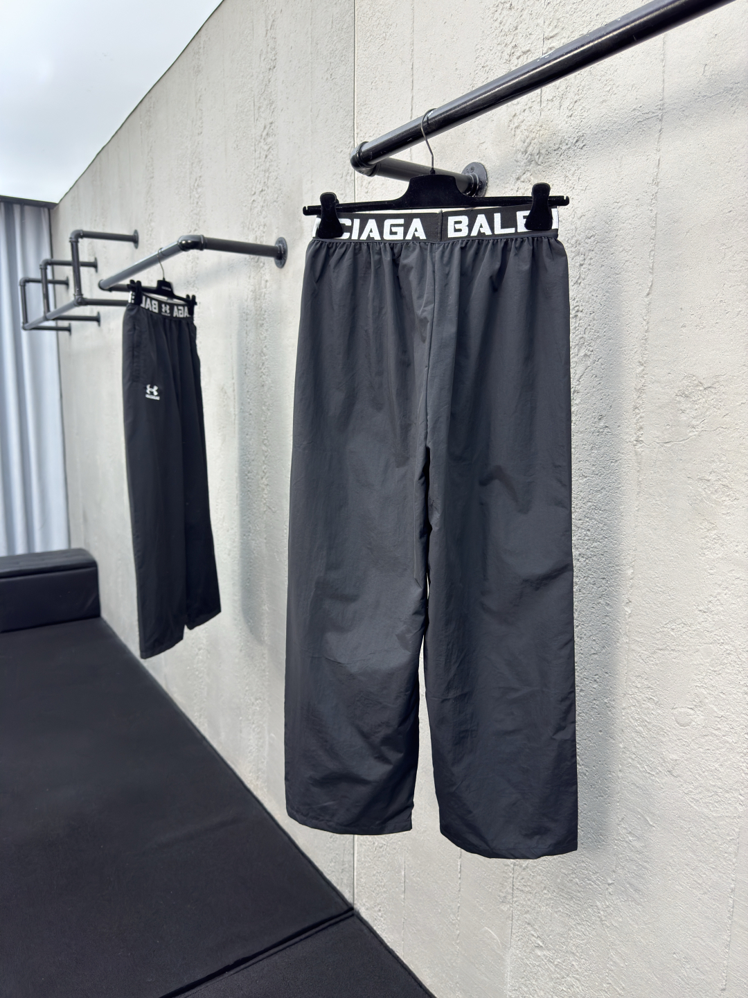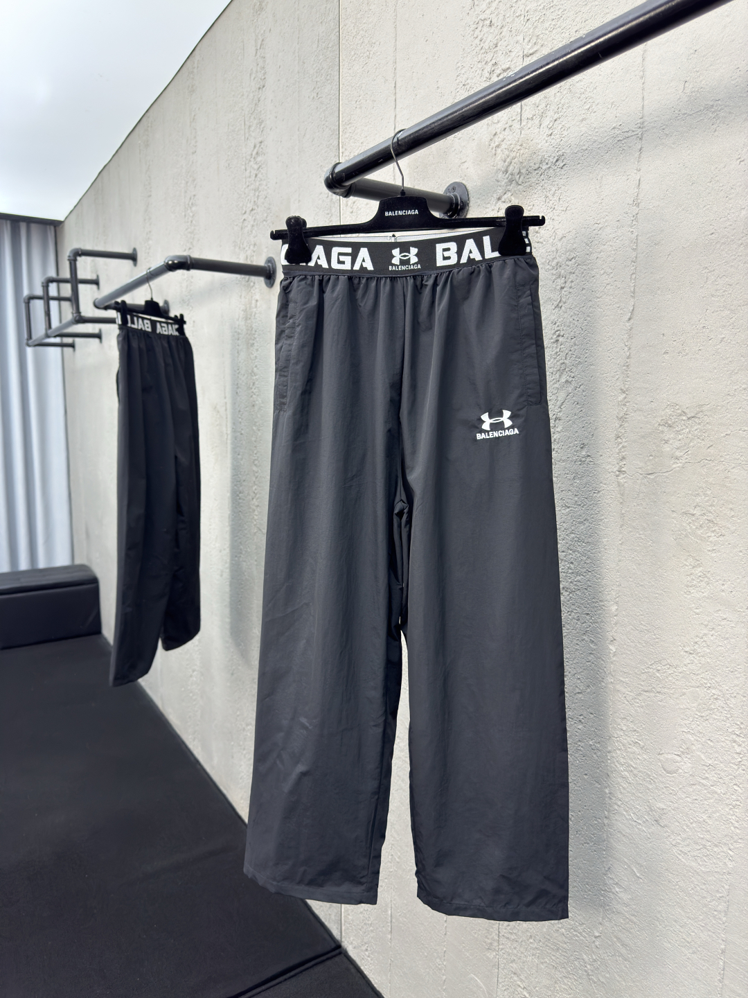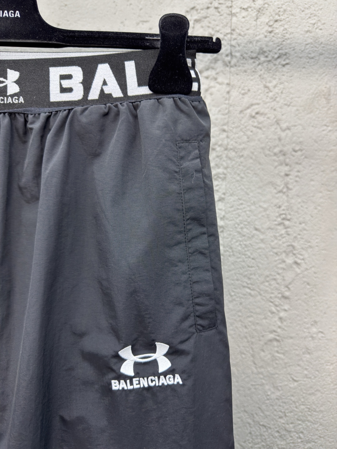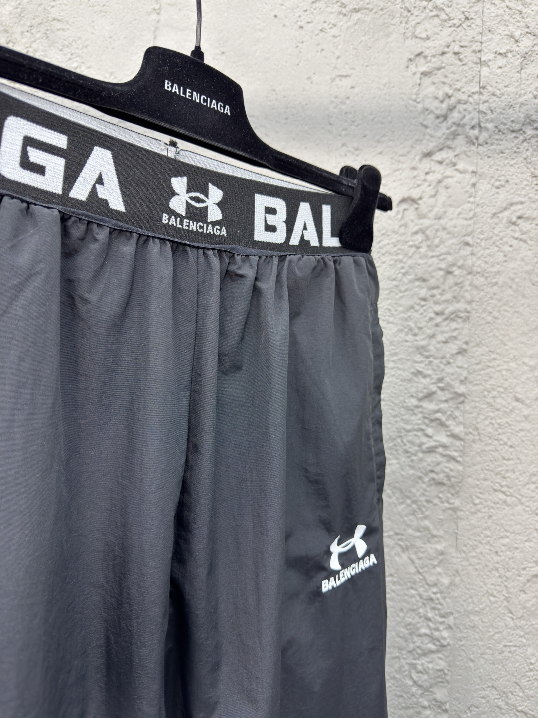 Balenciaga X 安德玛联名刺绣梭织长裤 工艺说明:定制消光塔丝隆面料 面料经过防水涂层工艺 内里采用三级聚酯鸟眼网布 田岛高速绣花机十万针立体整体走线平直细腻,面料舒适柔软,颜色一致无色差 能与同款搭配营造时尚造型,驾驭各种场合,定制辅料,三标齐全,男女同款! ⚠️颜色:黑色 ⚠️Size:1/2/3/4