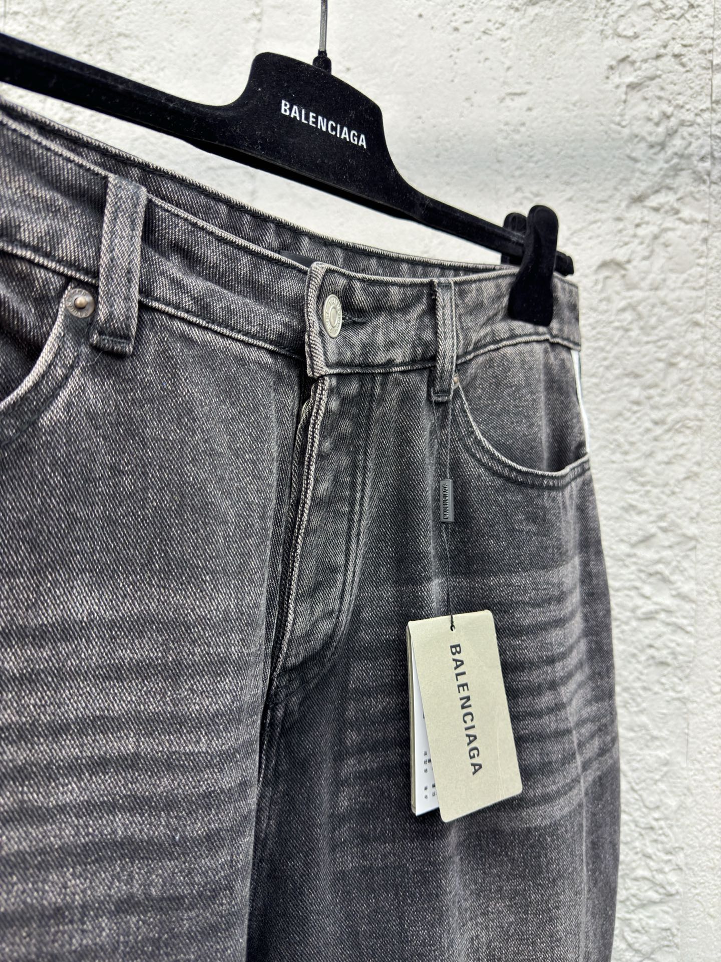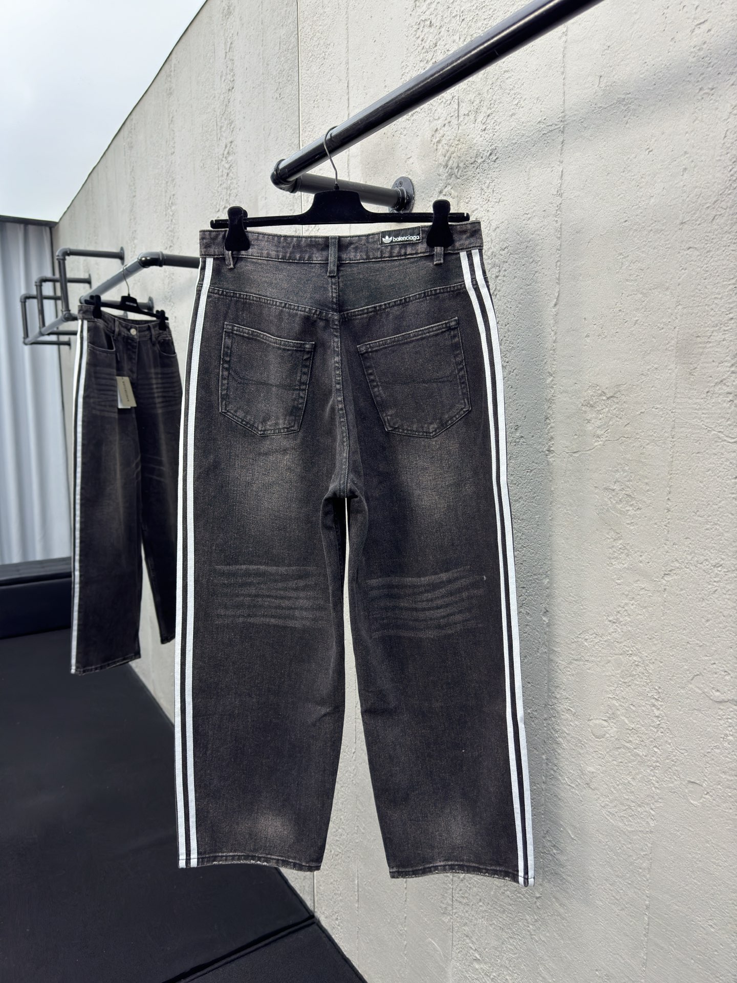 Balenciaga X AD联名 三条杠拼接牛仔裤 工艺说明: 双重酵素洗水 口袋部位做工精细 走线平直 搭配BLCG刻纹纽扣点缀 两侧定制织带 拉长腿部线条 加入运动服饰设计更加有层次感 背后嵌入AD标纯手工缝制 育克分割线适当的角度有提臀效果 视觉感十足 搭配两个贴袋 造型感十足的拼接直筒后期进行磨烂效果 裤腿走线平直细腻 YB开模定制纽扣 logo字母刻纹痕迹清晰 男女同款! ⚠️颜色:黑色 ⚠️Size:XS/S/M/L