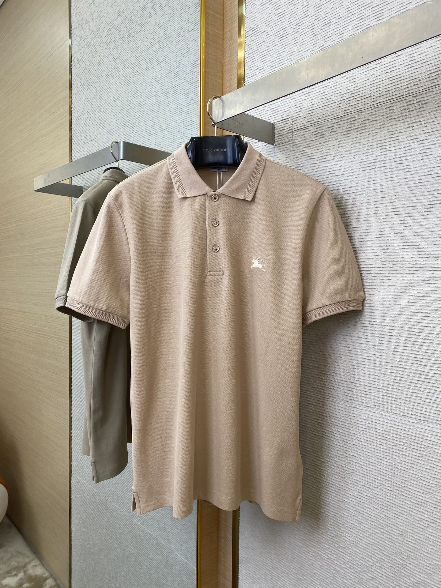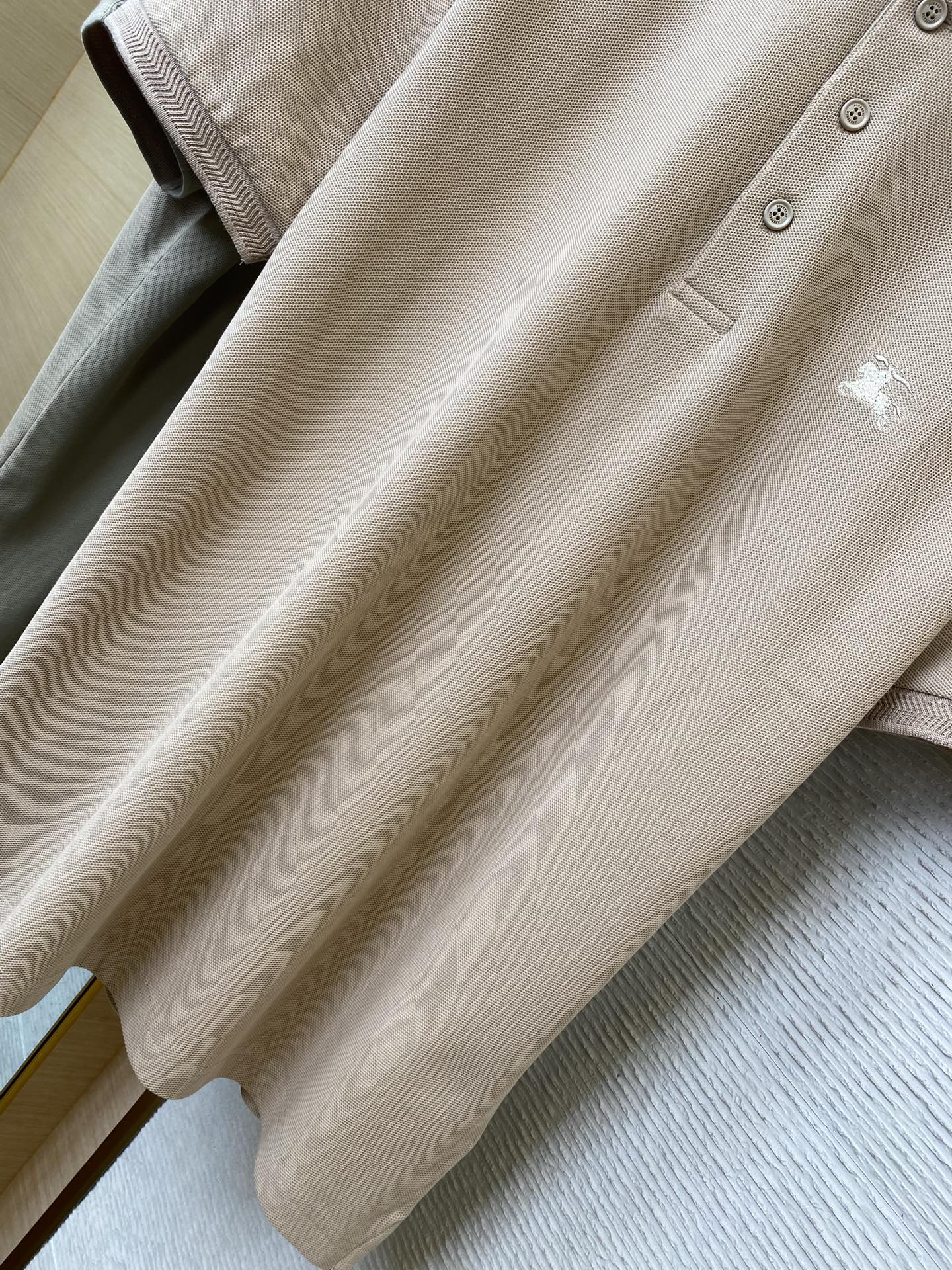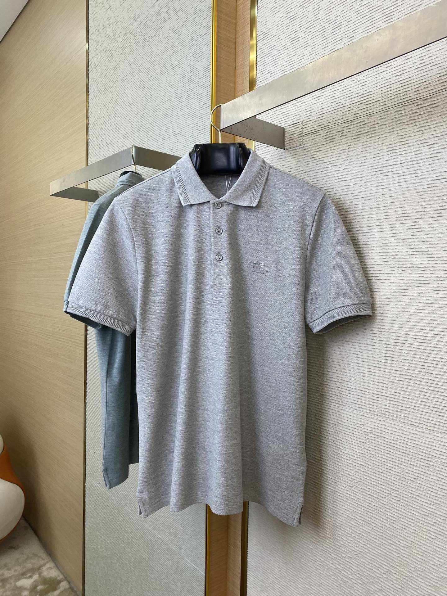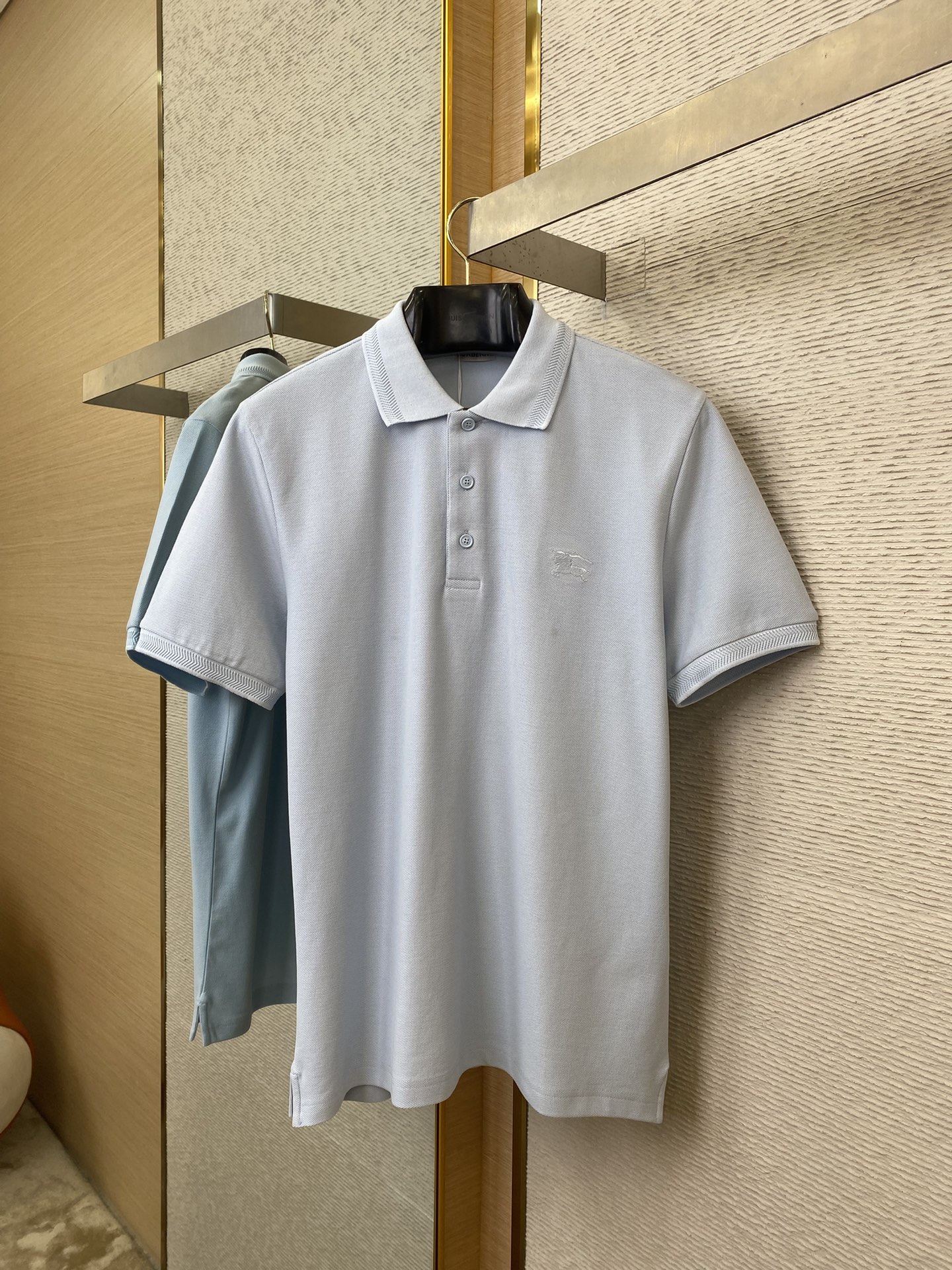 YB购入打版,采用定制选用棉质珠地网眼布面料打造,点缀同色系马术骑士徽标(EKD)刺绣。开襟处搭配Burberry格纹内衬,呈现修身版型,刻字纽扣开襟