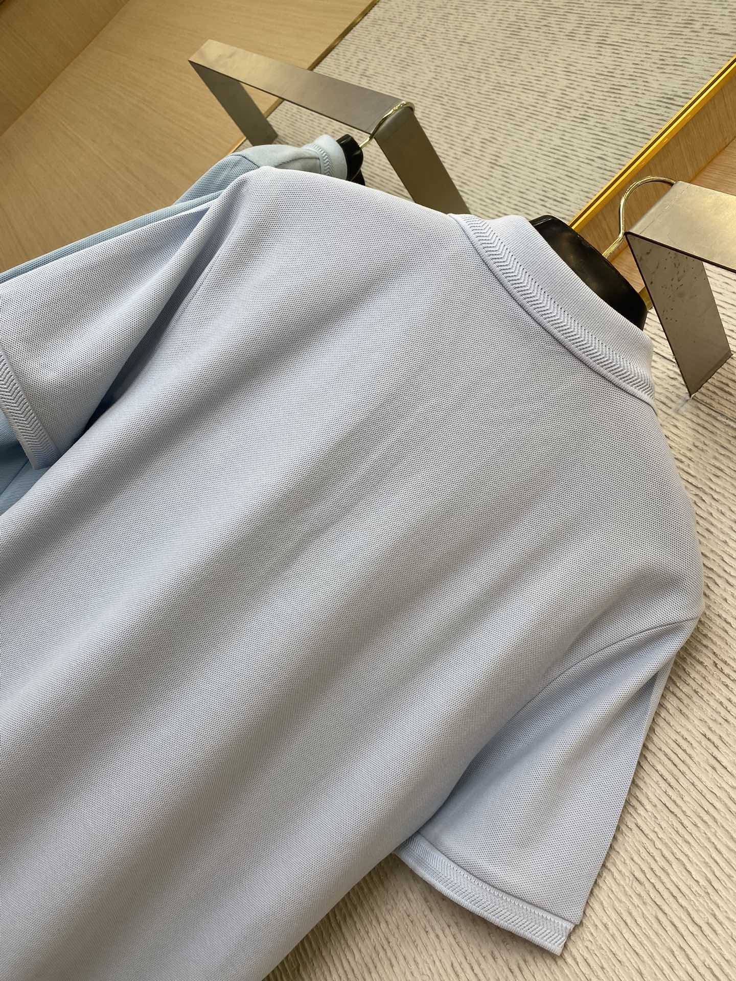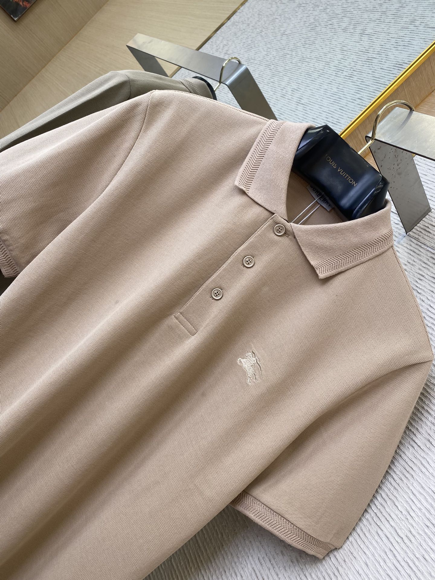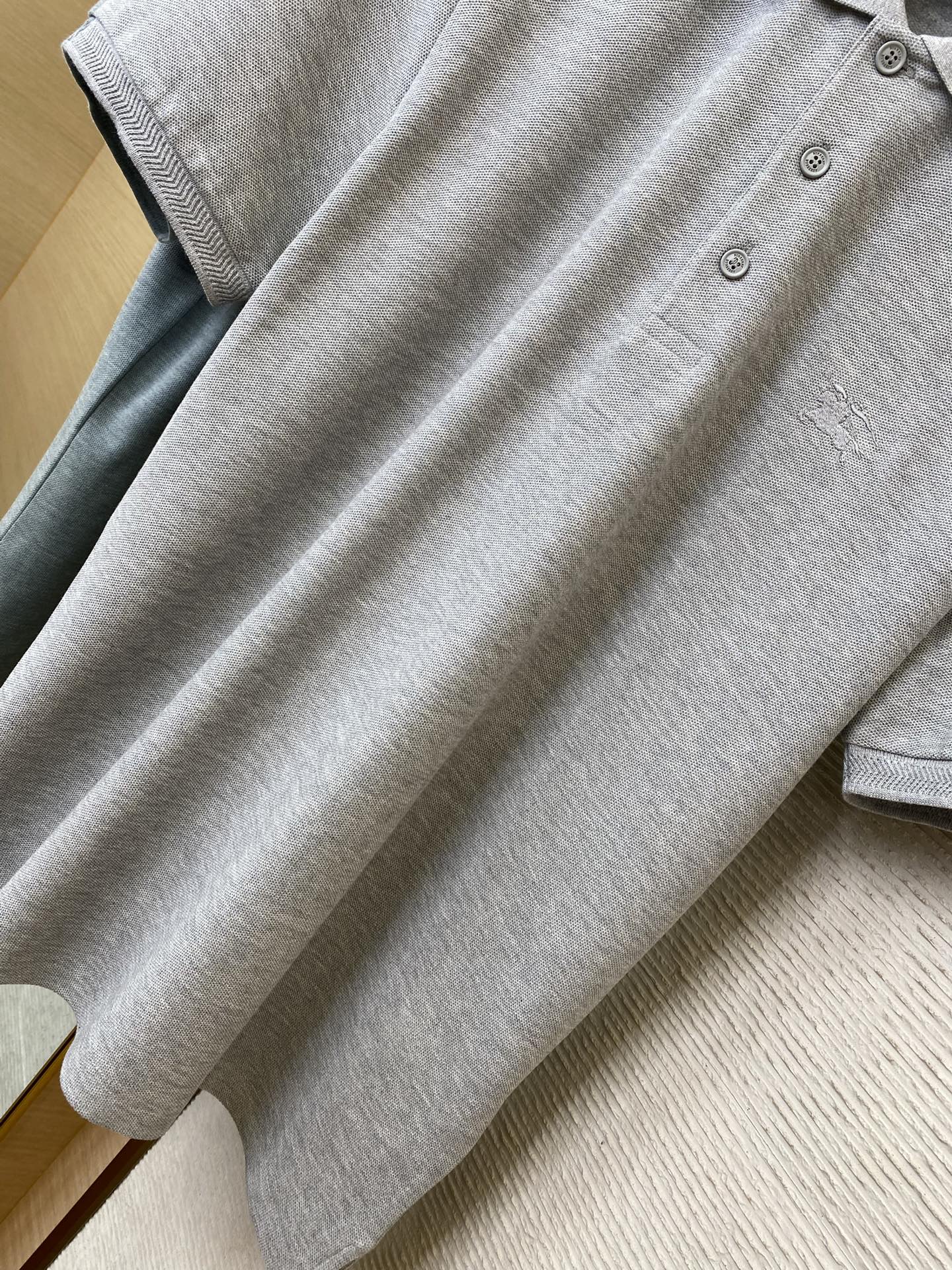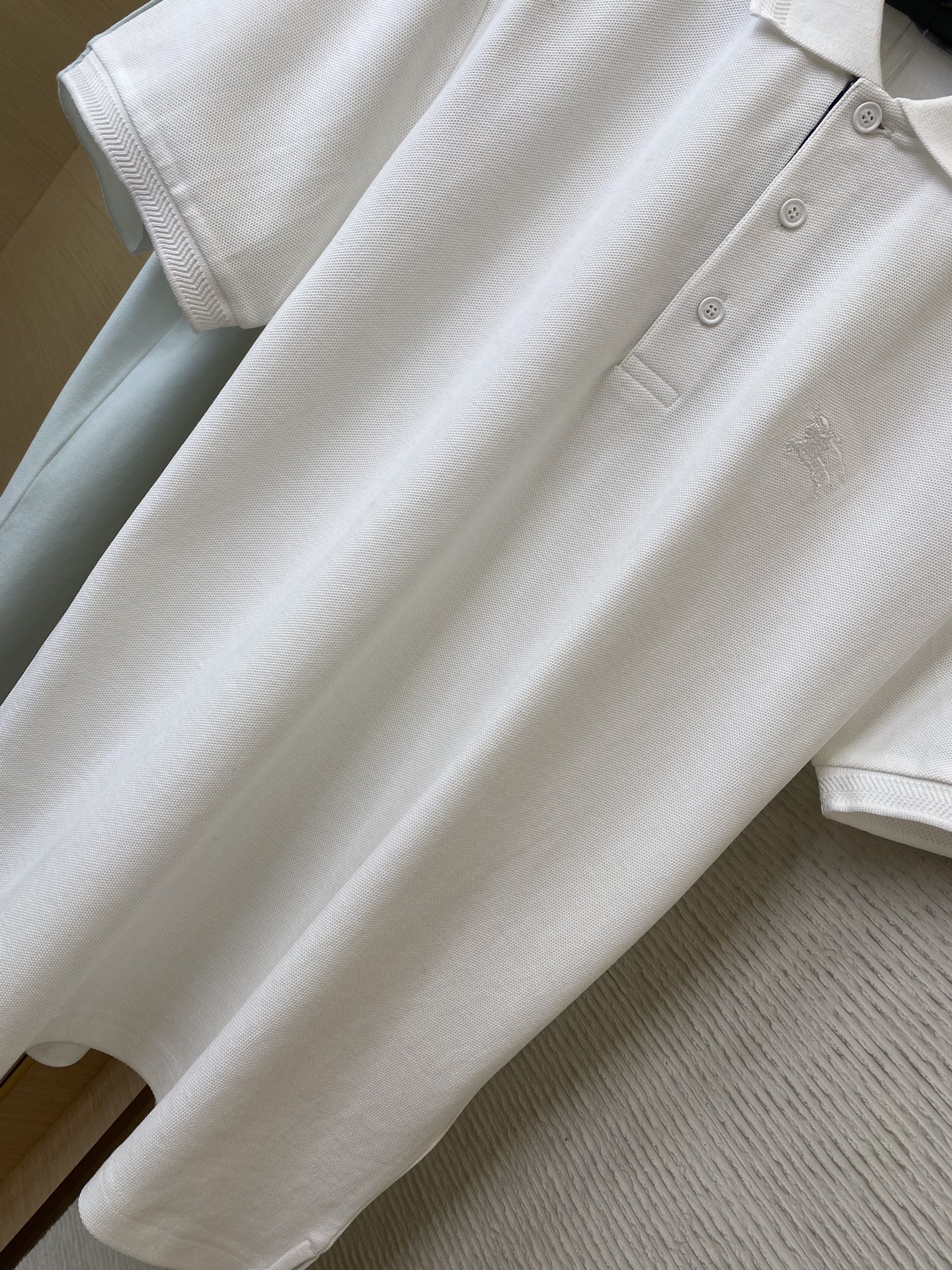 YB购入打版,采用定制选用棉质珠地网眼布面料打造,点缀同色系马术骑士徽标(EKD)刺绣。开襟处搭配Burberry格纹内衬,呈现修身版型,刻字纽扣开襟