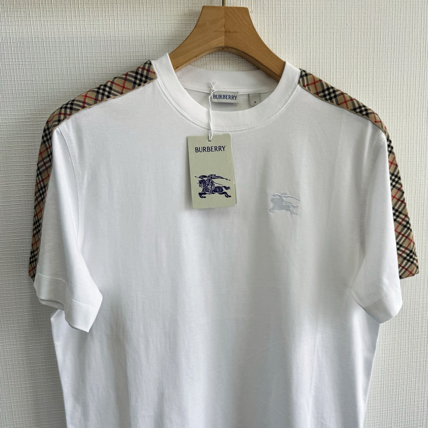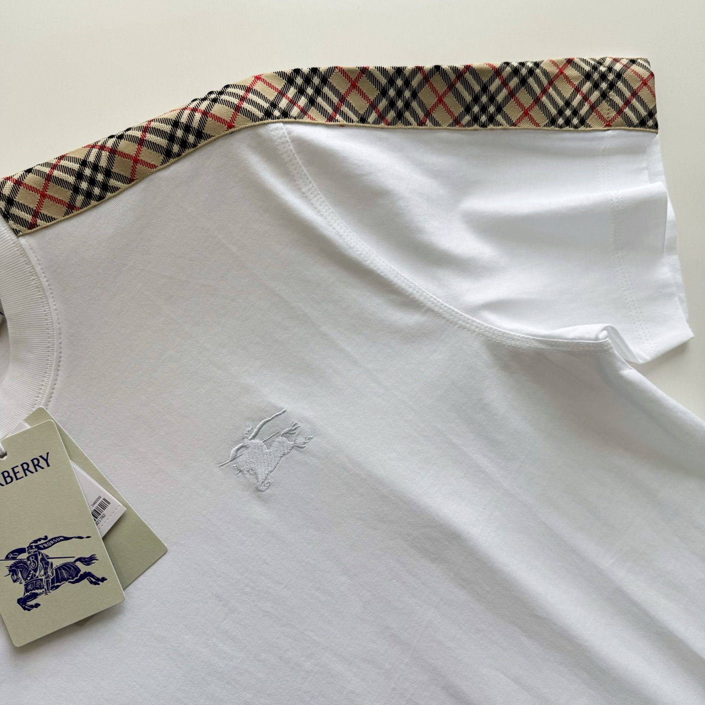 bbr 25ss 袖子格子织带装饰T恤 100%全棉的40支特订双股长绒棉纱 全新系列的T恤衫继续沿用经典的格纹系列与以往不同的是25年夏装将格纹布料改用了织带装饰做法(织带的纹路和颜色比布料更难织)左胸位置搭配了同布色经典骑士战马的绣花logo 在染色方面:每个颜色都需要有基本的染色数量,特别是布料颜色里面有黑色和白色的配搭,对颜色的色牢度要求极高,一定要做的达标的4+级以上色牢度才能保证成衣在水洗和浸泡情况下不会出现串色的情况,普通市面棉纱黑色色牢度均在3级左右,很容易出现掉色情况Size:s/m/l/xl