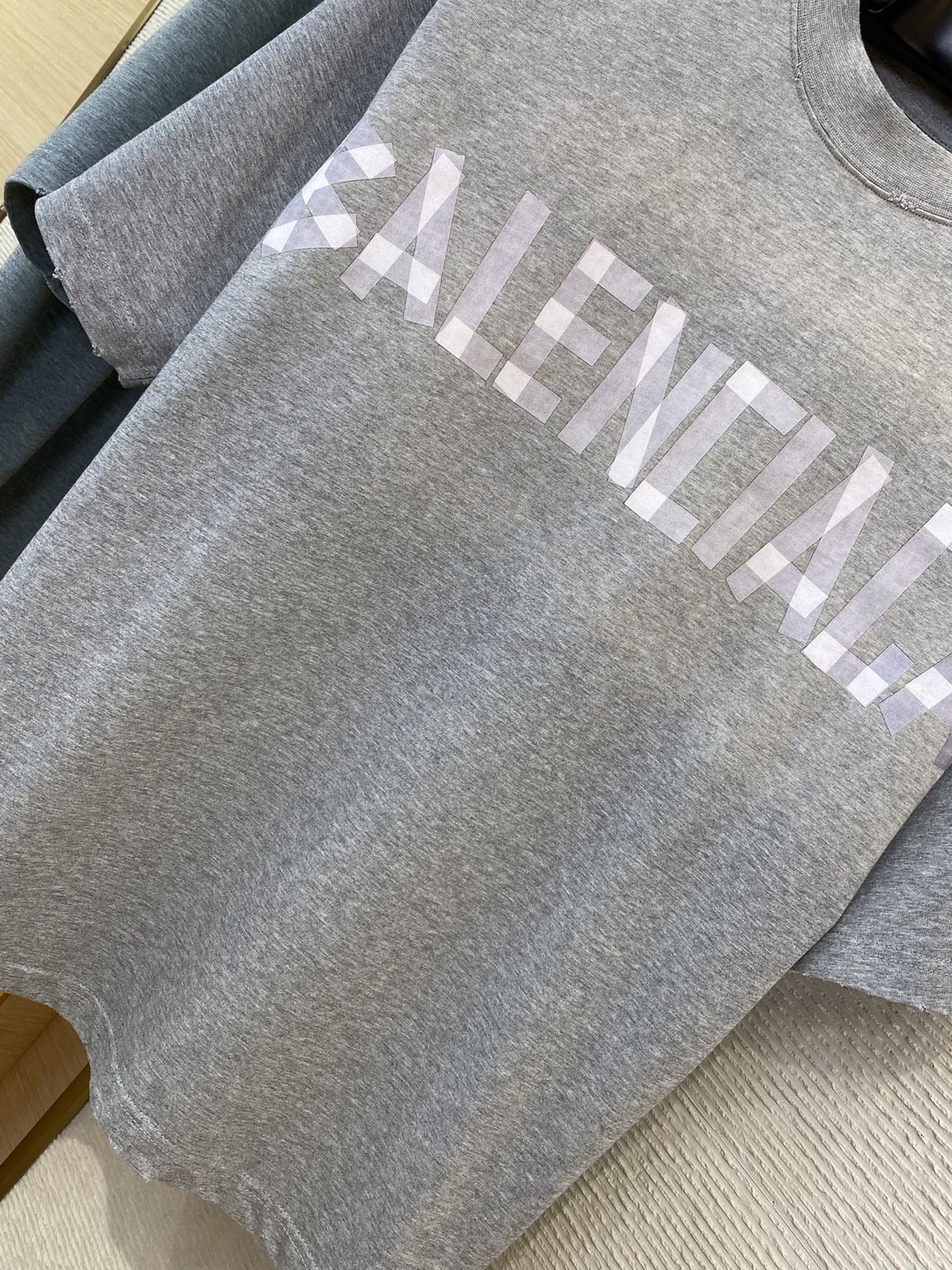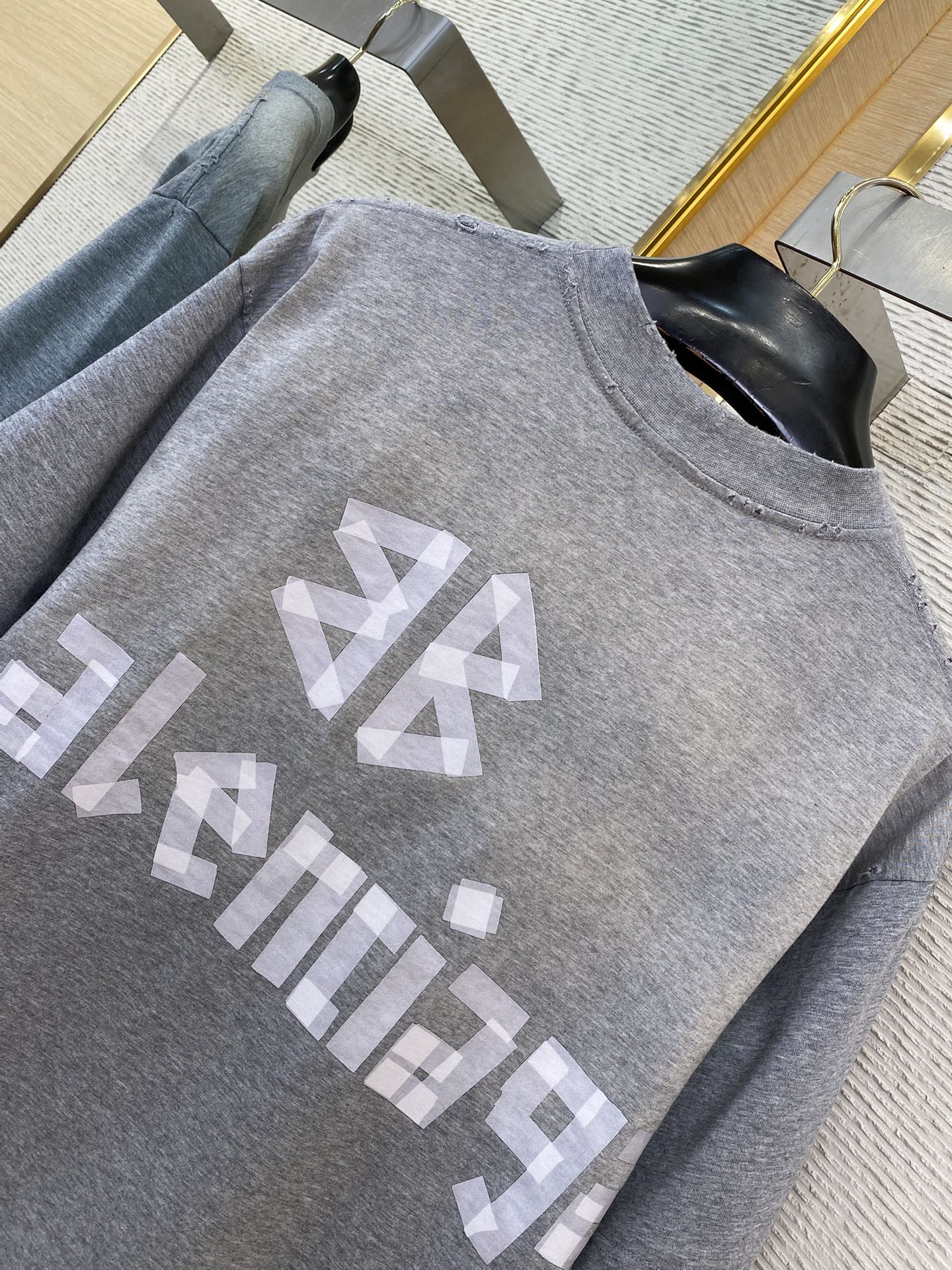 专柜同步在售,采用 6s单纱精梳棉平纹面料,克重 6 g,配套新款 * 十字格型纹织法螺纹收口,面料定织定染,前幅采用椭圆机丝网+数码直喷一体化机器打印,进口环保胶浆+透明浆打底后刮 次数码浆料,采用数码直喷打印颜色,根据Y版精修图稿,在字母接驳位置颜色加深,整体视觉像美纹纸手工贴花效果,字母接驳位置全部手工画虚化笔画,整体视觉效果字母更加立体 成衣进行手工磨破+剪烂破洞,添加柔软剂砂洗炒色做旧做软,定制辅料,三标齐全,男女同款!