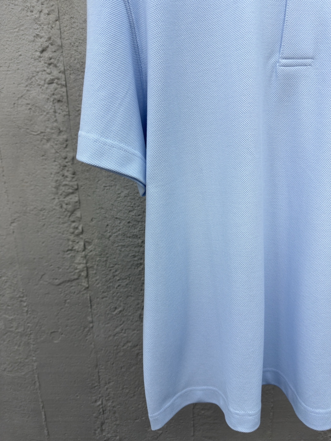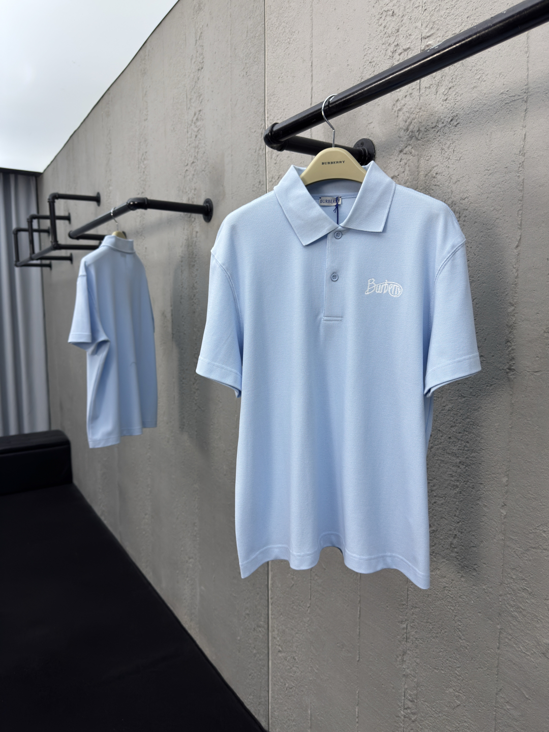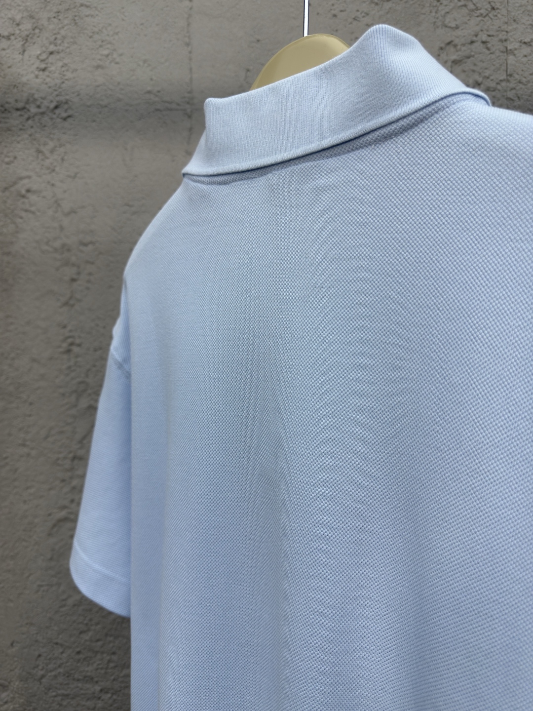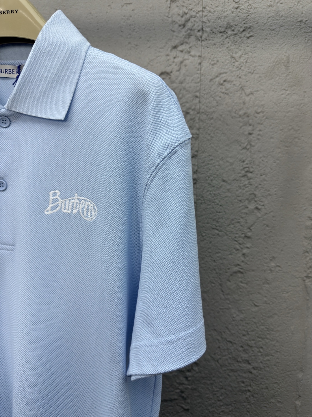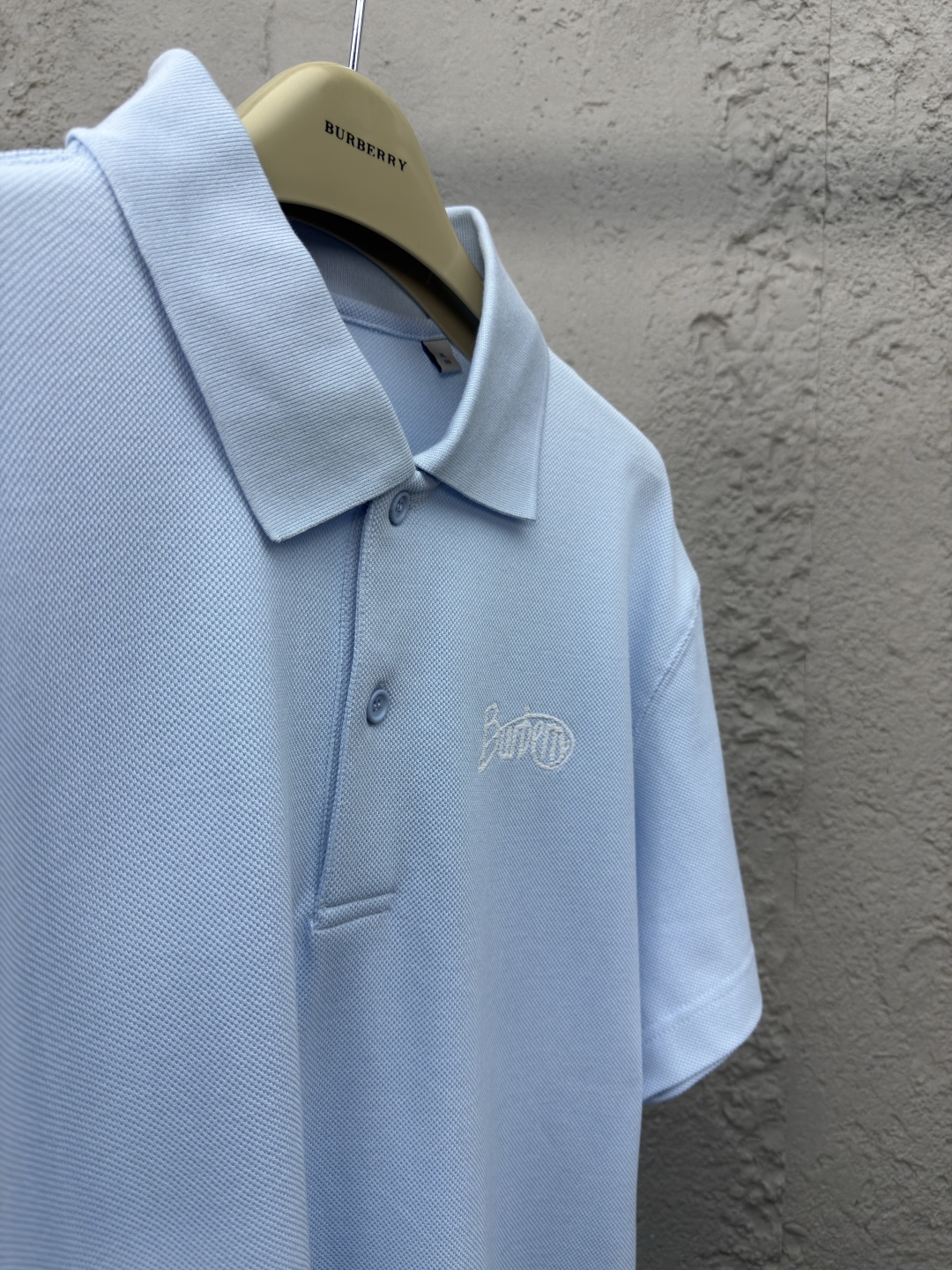 BURBERRY 刺绣字母POLO衫 工艺说明:选用珠地网眼布棉质面料打造,采用双罗纹针织工艺,形成凹凸交替的蜂巢状立体纹理,表面分布细密的网眼结构,增强其透气性。领口与衣身接缝处运用三针五线拷边工艺加固,防止变形。纽扣开襟,扣子手工打磨抛光,孔位用丝线缠绕,不易脱落。胸口饰以典藏字母徽标刺绣,使其更具时尚性和品牌辨识度。整体走线平直细腻,面料舒适柔软,颜色一致无色差 能与同款搭配营造时尚造型,驾驭各种场合,定制辅料,三标齐全,男女同款! ⚠️颜色:蓝色 ⚠️Size:S/M/L/XL