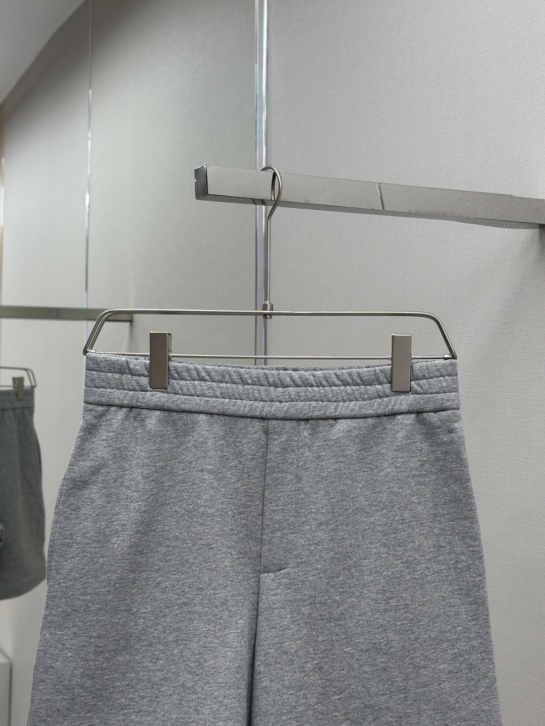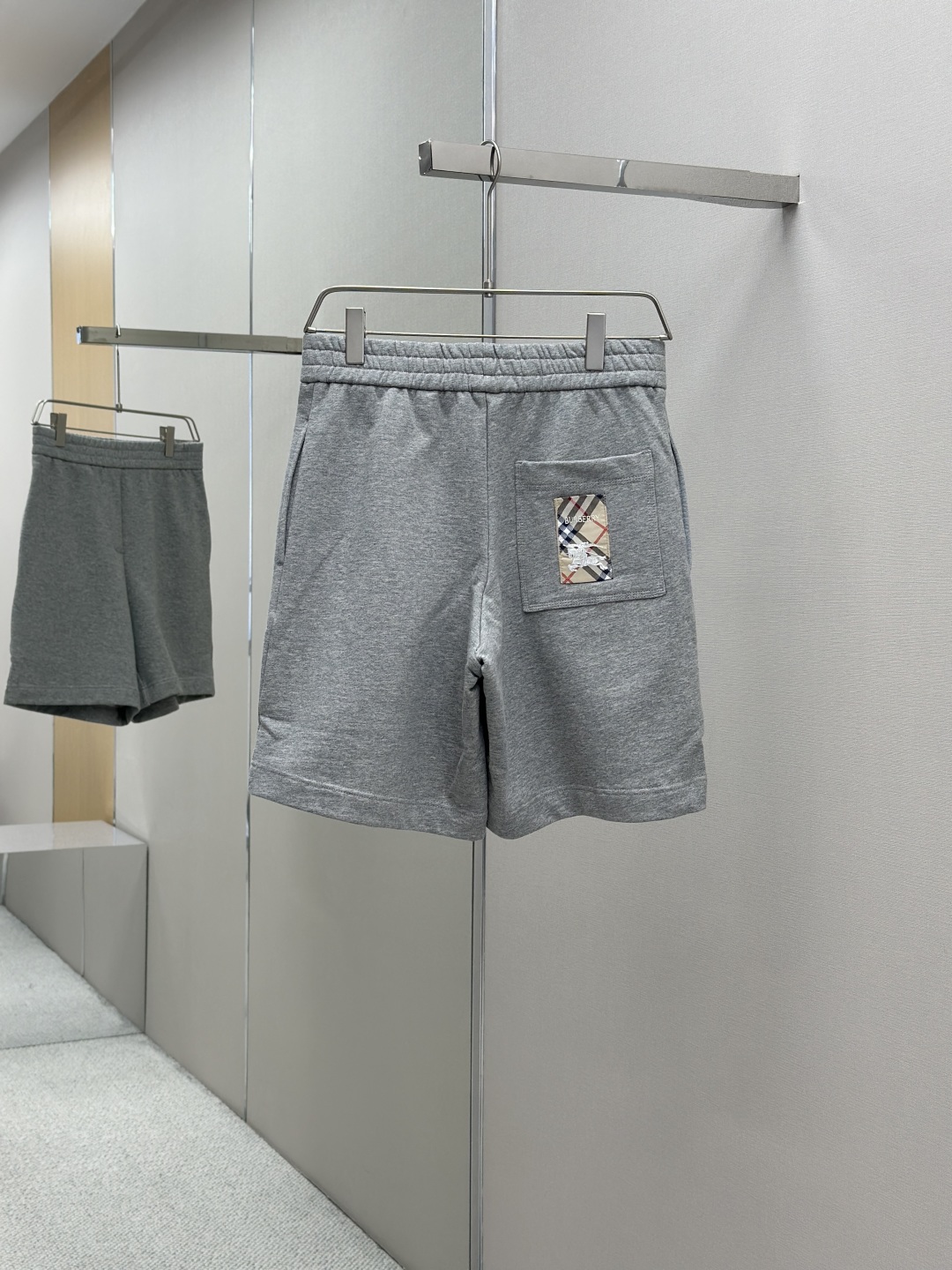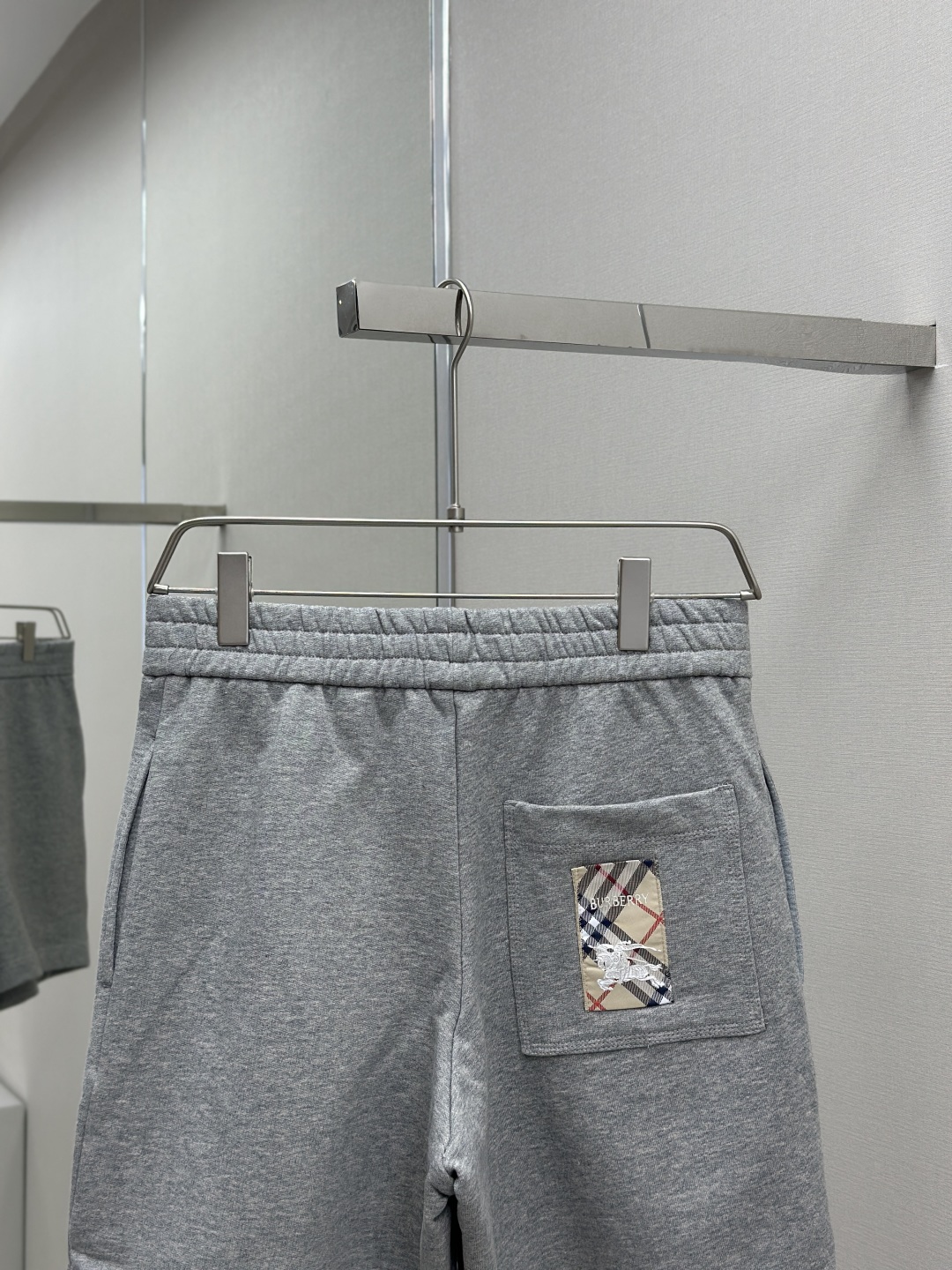 工艺和细节:腰部采用松紧带设计,搭配抽绳调节,运用橡筋车缝合腰部松紧带,线距紧密,使其更加牢固、平整和美观同时兼顾良好的弹性。两侧设有口袋,运用套结工艺加固袋口。后贴袋边缘处运用嵌车三针四线工艺缝制于臀位之上,强化视觉美观度和耐用性,袋体上饰有品牌经典的格纹战马徽标贴花.