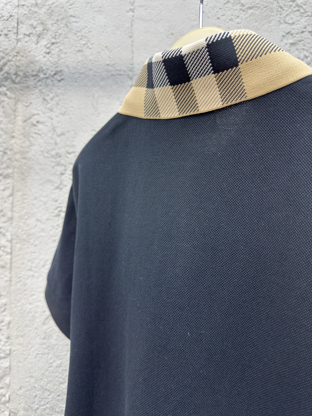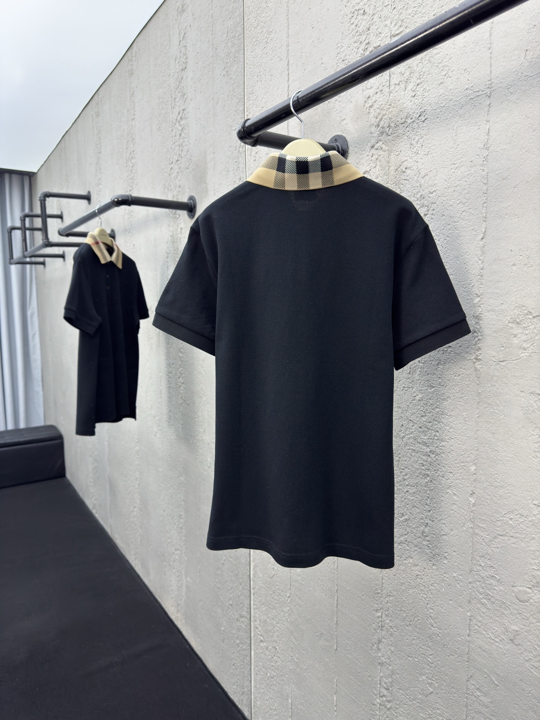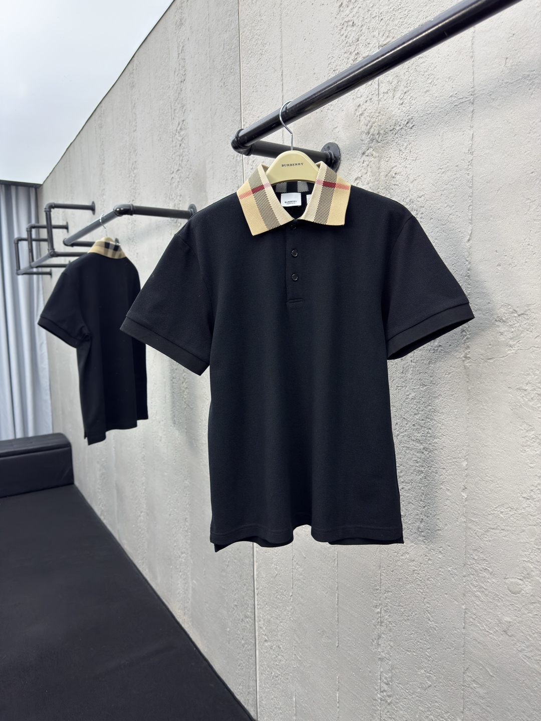 BURBERRY 翻领格纹POLO衫 工艺说明:棉质珠地网眼布面料打造,透气性好,珠地网眼结构赋予了它独特的纹理,提升质感。肩部采用双针包边工艺,更好的固定,不易脱线.袖口采用弹性螺纹针织,双针机编织的螺纹,螺纹清晰,弹性十足,整体走线平直细腻,面料舒适柔软,颜色一致无色差 能与同款搭配营造时尚造型,驾驭各种场合,定制辅料,三标齐全,男女同款! ⚠️颜色:黑色 ⚠️Size:S/M/L/XL