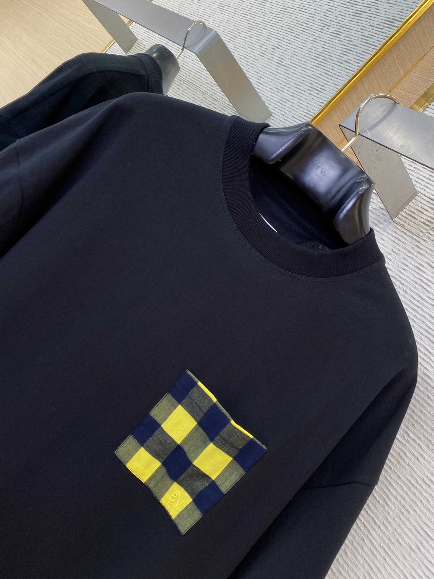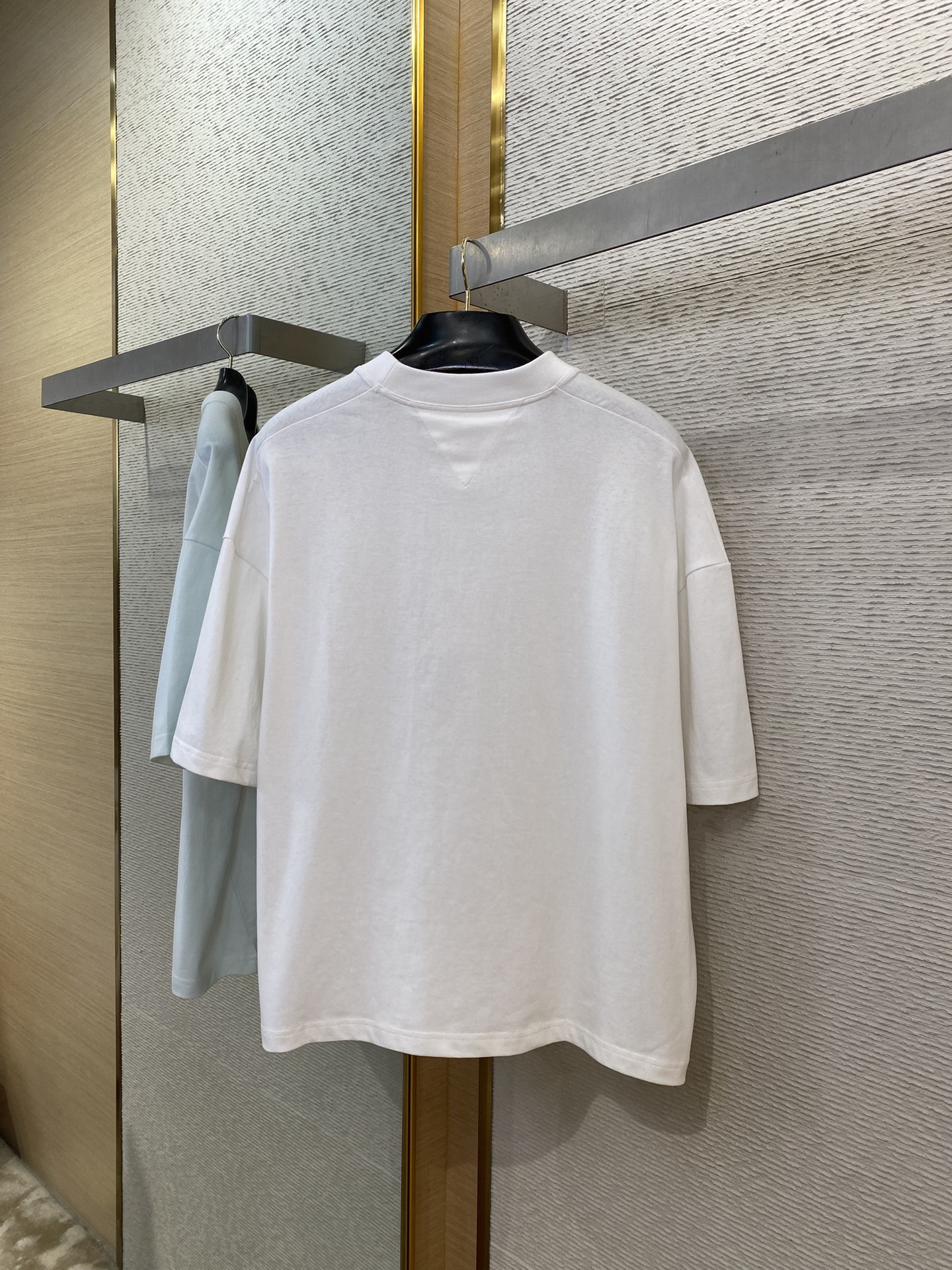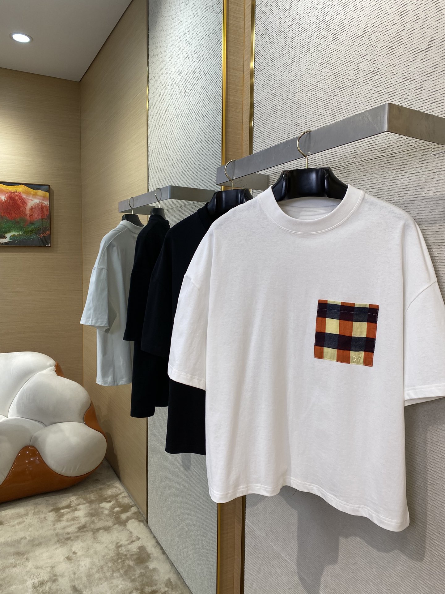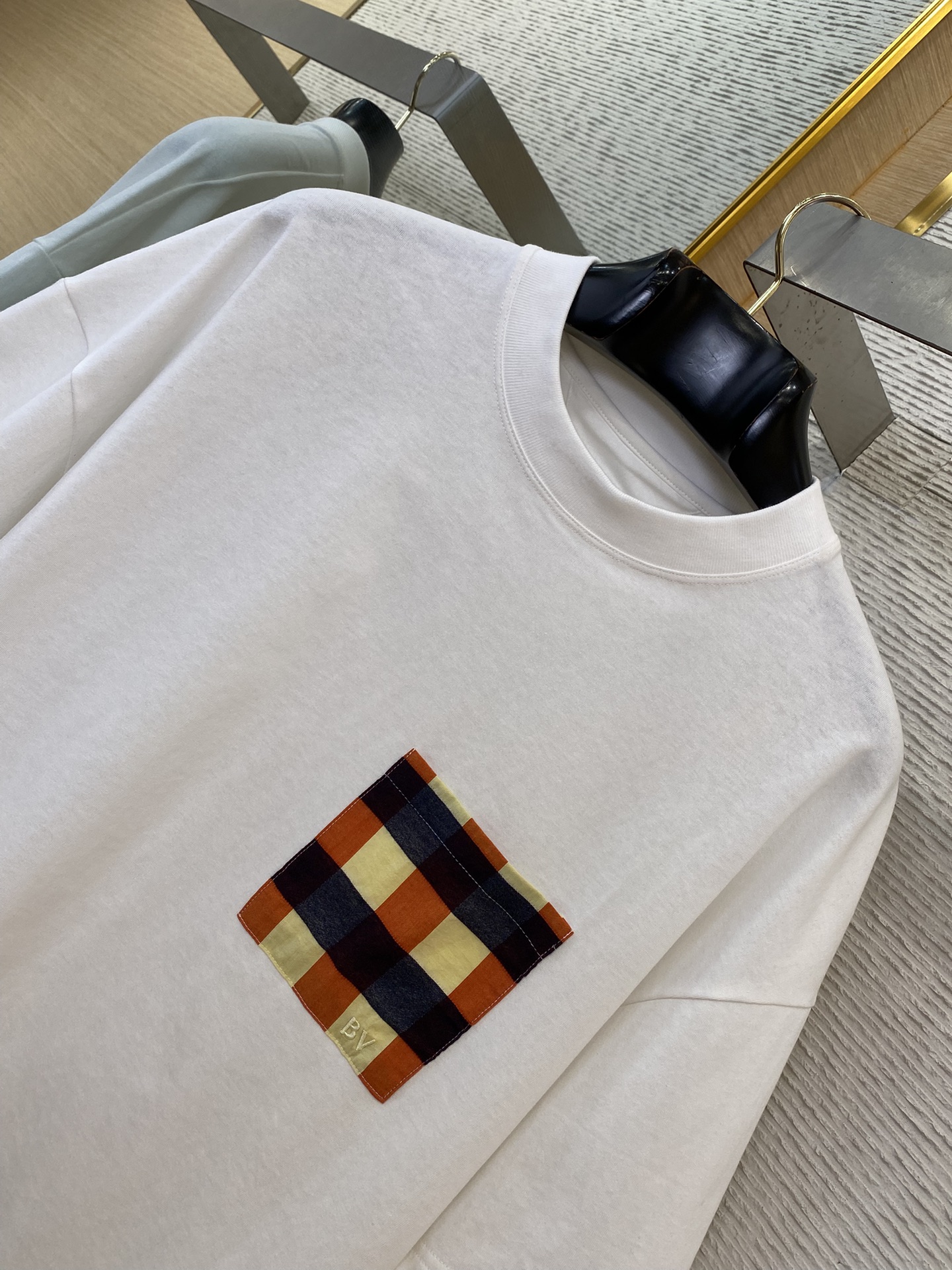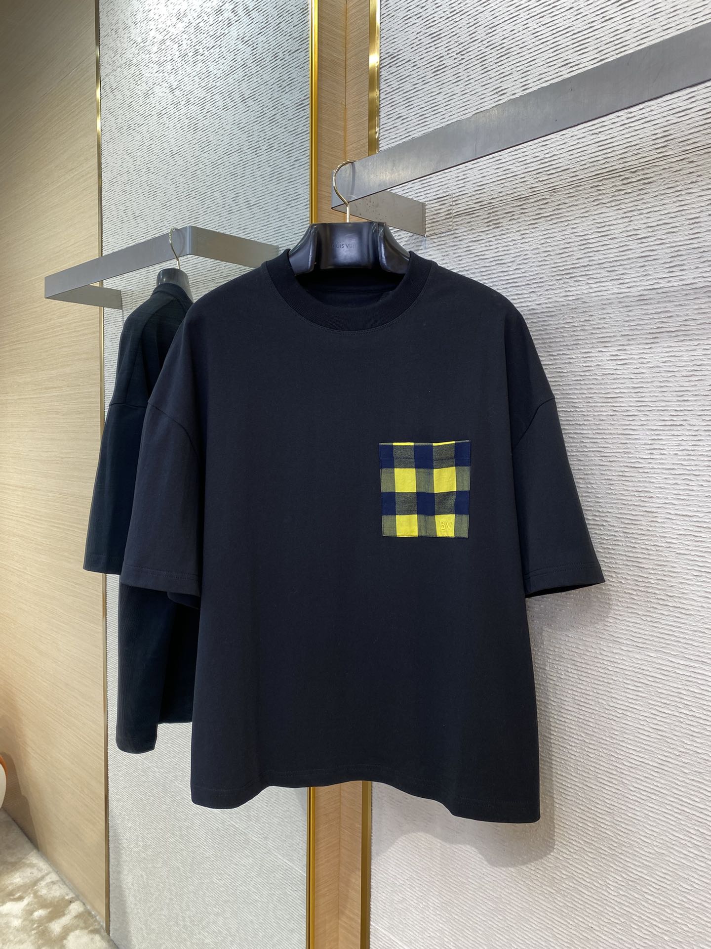 YB购入打版,采用定制精梳棉面料,面料水洗,胸前贴布口袋饰以BV刺绣点缀,面料柔软舒适透气性好,能与多类型下装搭配营造时尚造型,定制辅料,三标齐全,男女同款!
