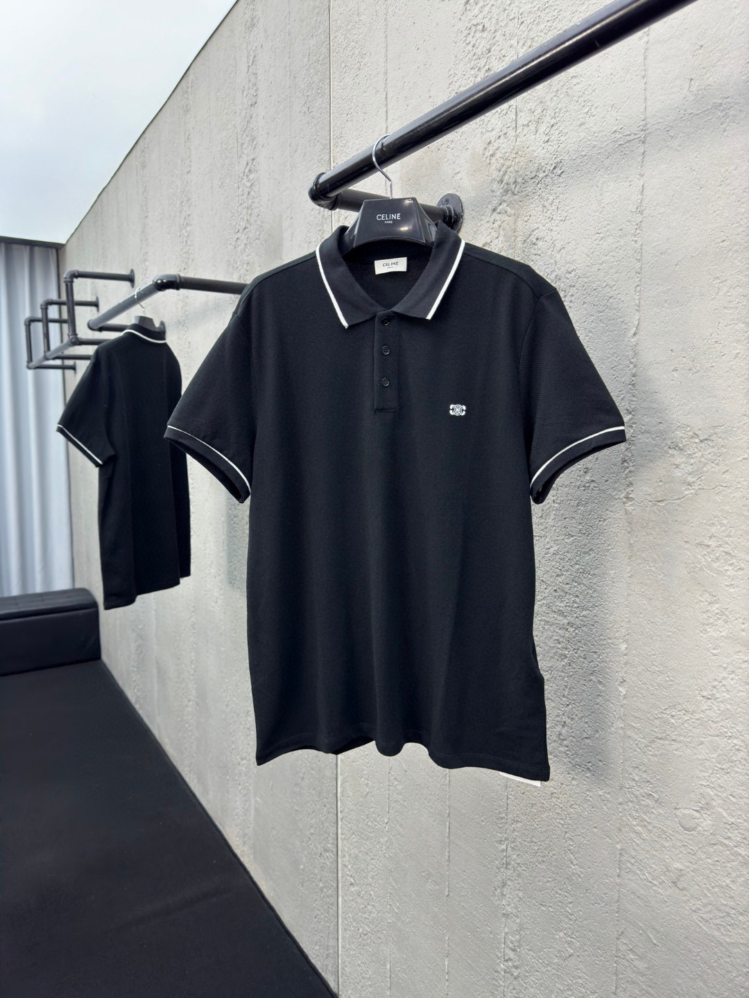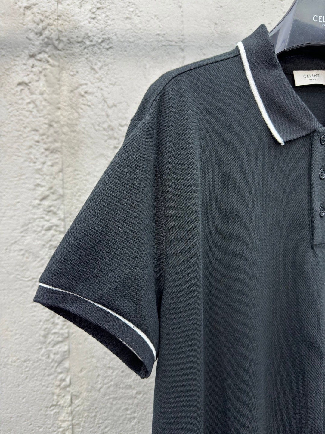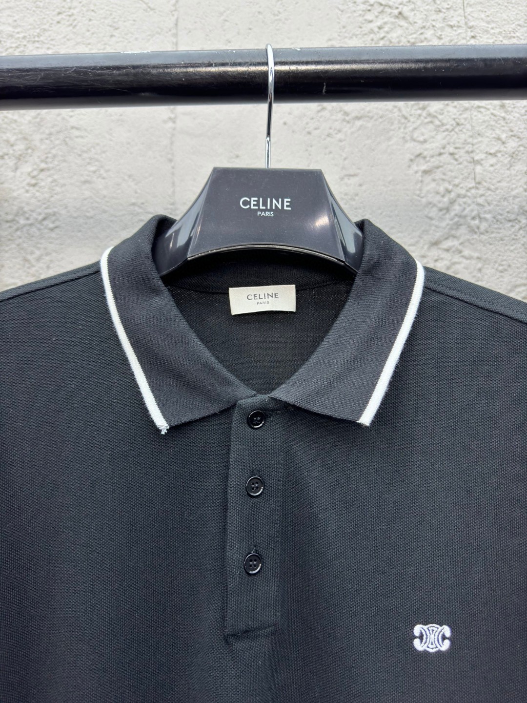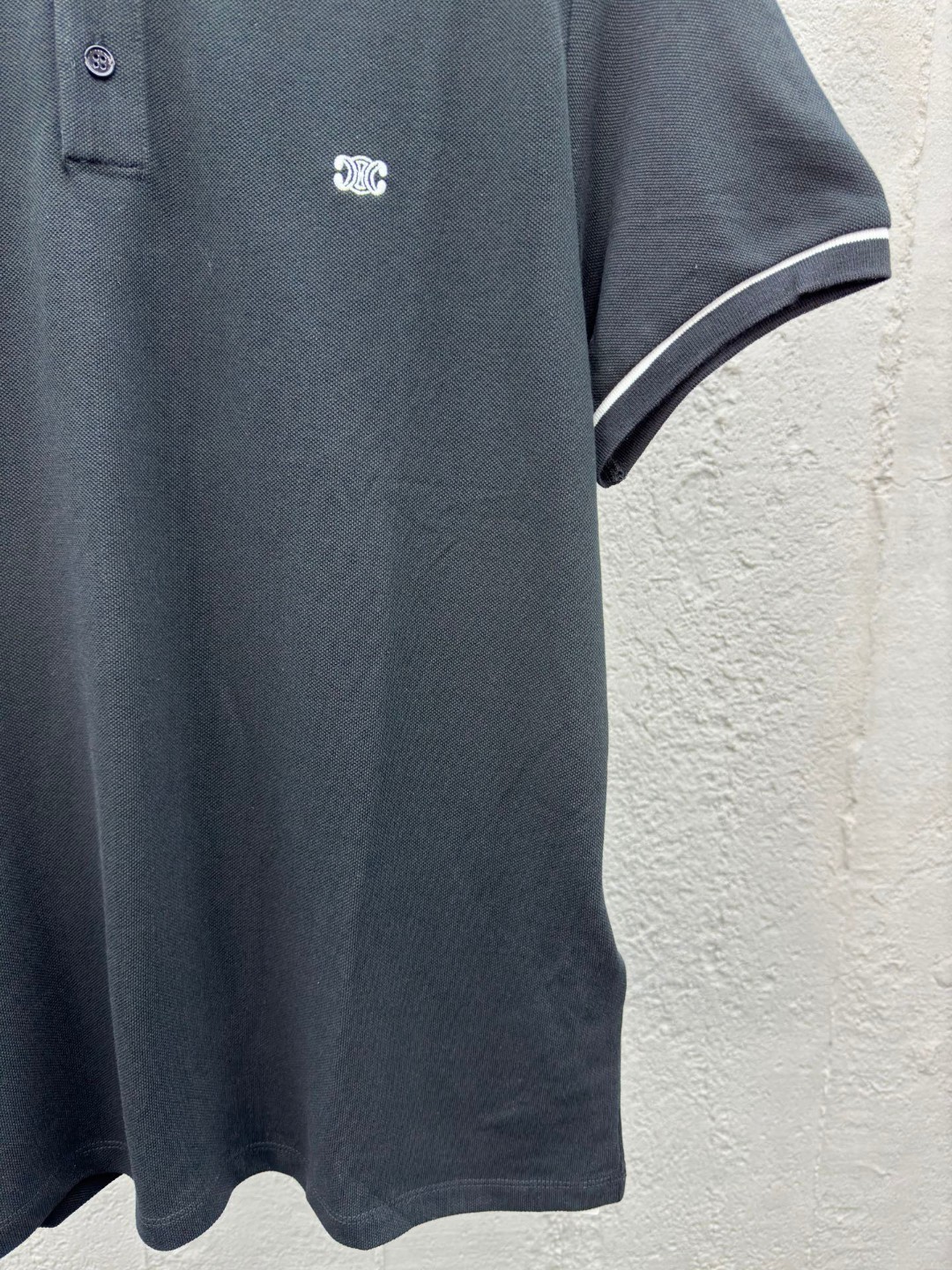 Celine 凯旋门刺绣Polo衫 工艺说明:采用采用250潮棉珠地 舒适透气 挺括性强 定制扁基螺纹领 标志性凯旋门刺绣点缀正面 饰以衣领和袖口饰撞色滚边 Clean fit拉满 简单到极致就是时髦 最简单的经典黑色Polo衫 刺绣采用进口机立体绣 Logo清晰 精度高 线条流畅而细腻 面料都经过浇洗 手感质感更佳 不易变形 不易缩水 不易褪色 保持长久的美观 ⚠️颜色:黑色 ⚠️Size:S/M/L/XL