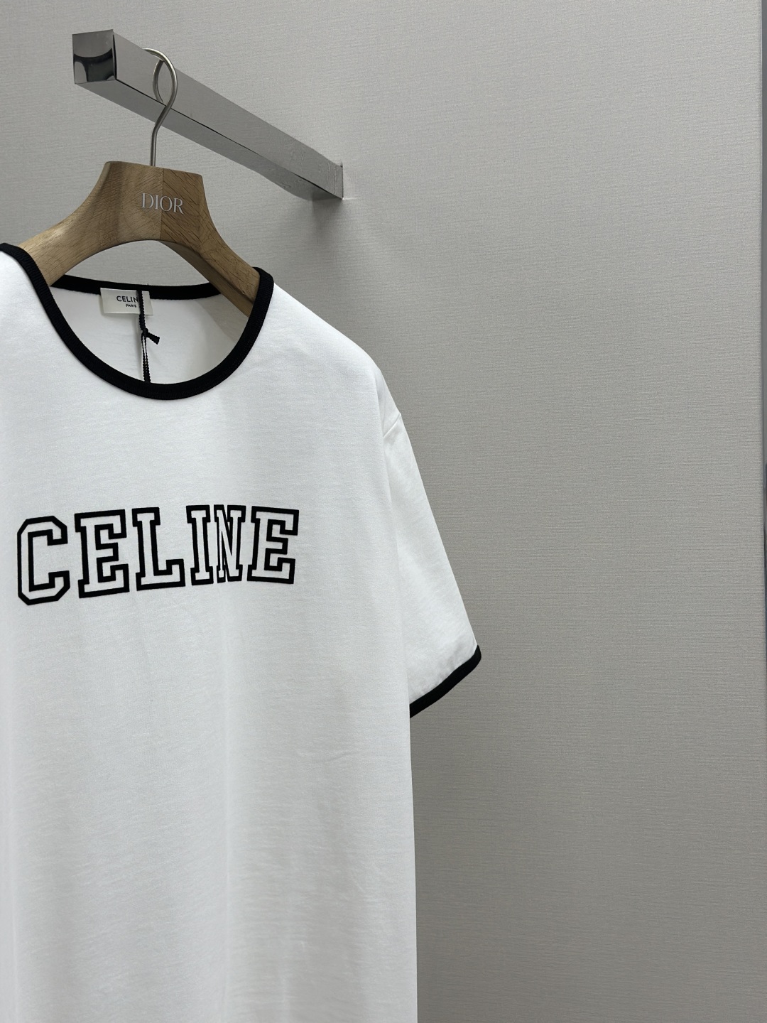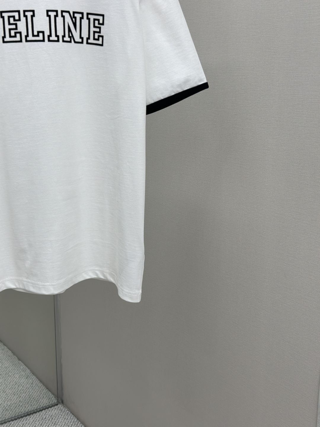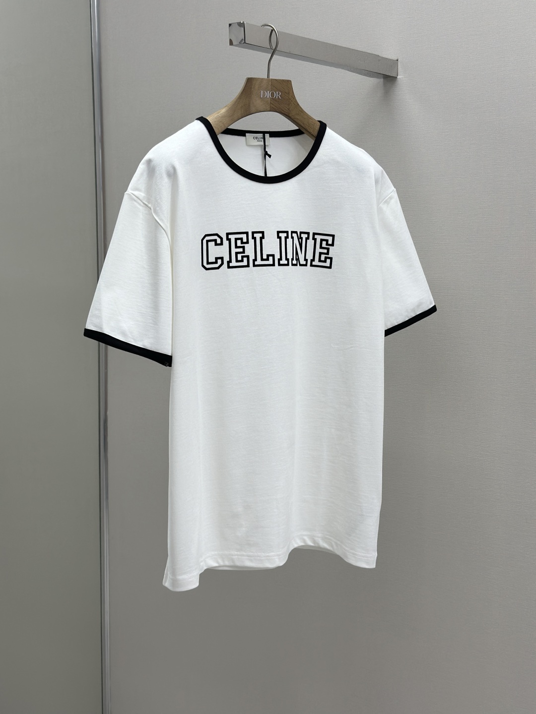 CELINE 25SS植绒印花圆领短袖 工艺说明:采用24S特种纺织紧密棉面料,185g;搭配32S双纱螺纹,220g。紧密纺强力比传统单纱高,紧密纱中的单纤维排列紧密,有助于提高纱线的强力。字母图案选用转移植绒工艺,以热转印技术加持牢固粘合剂成型印花图案。同时植绒印花的成分采用尼龙材质,尼龙本身具有良好的防污性能和防水功能。整体走线平直细腻,面料舒适柔软,颜色一致无色差 能与同款搭配营造时尚造型,驾驭各种场合,定制辅料,三标齐全,男女同款! 尺码S-XL