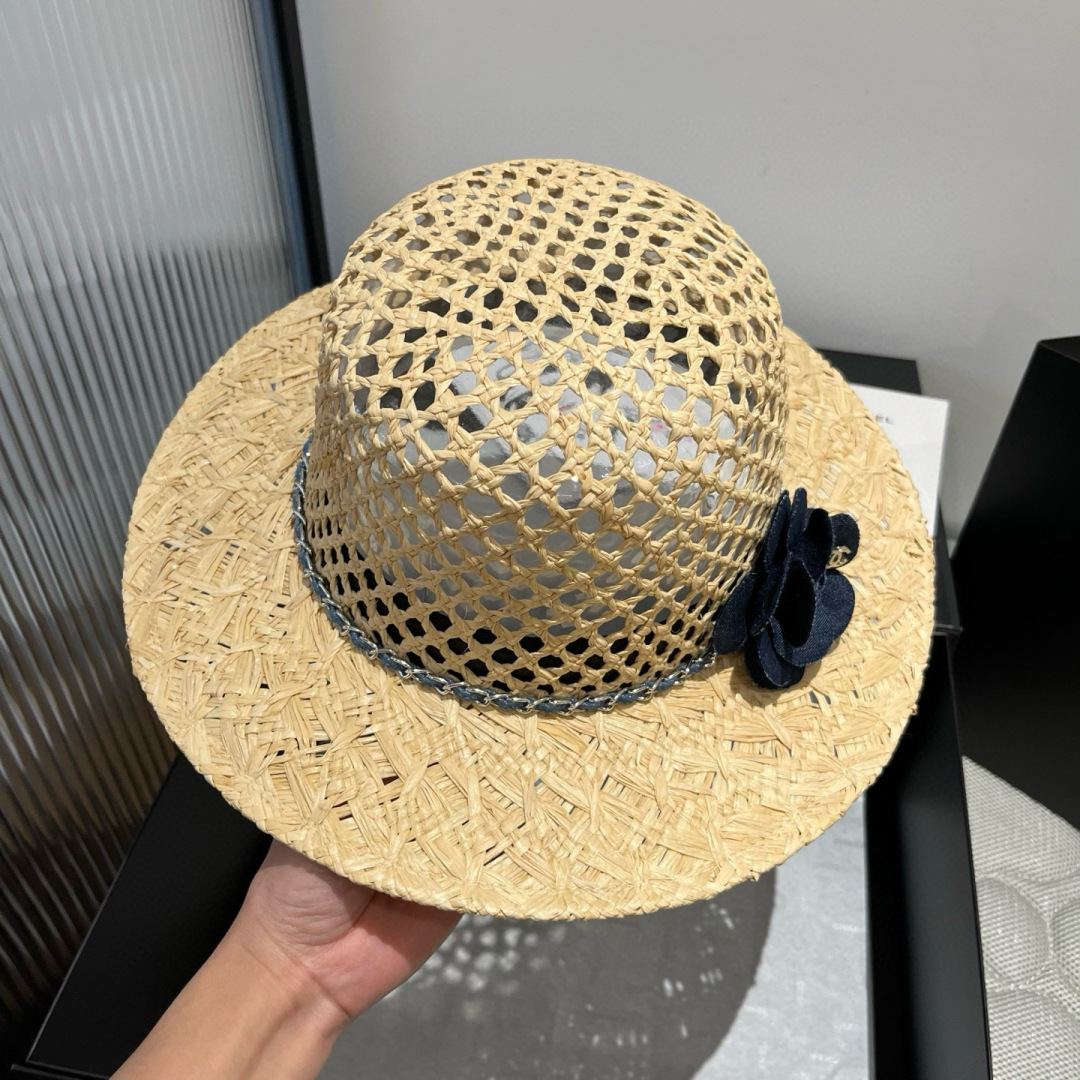 Chanel香奈儿拉菲草帽,高级定制,搭配山茶花朵,头围57cm