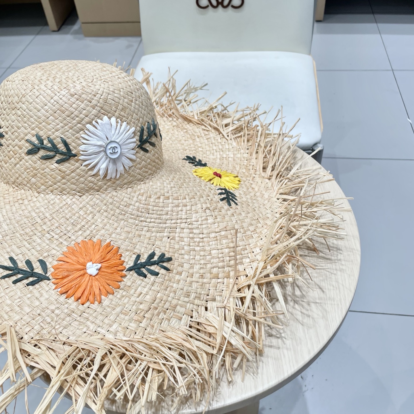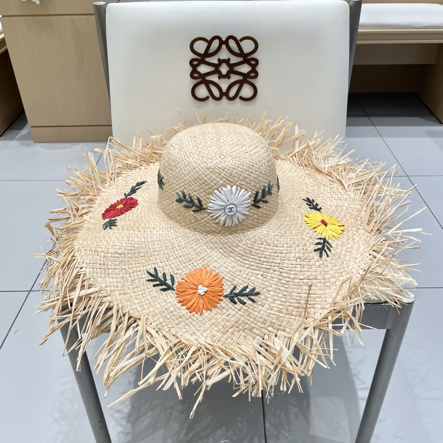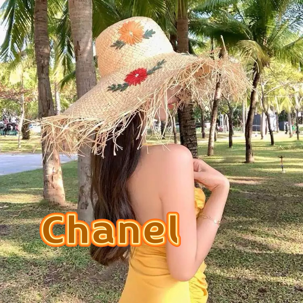 Chanel香奈儿花朵拉菲草帽女夏大帽檐草编遮阳防晒帽海边沙滩度假太阳帽子