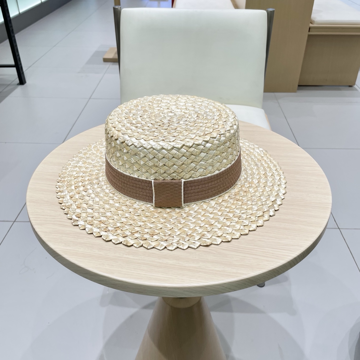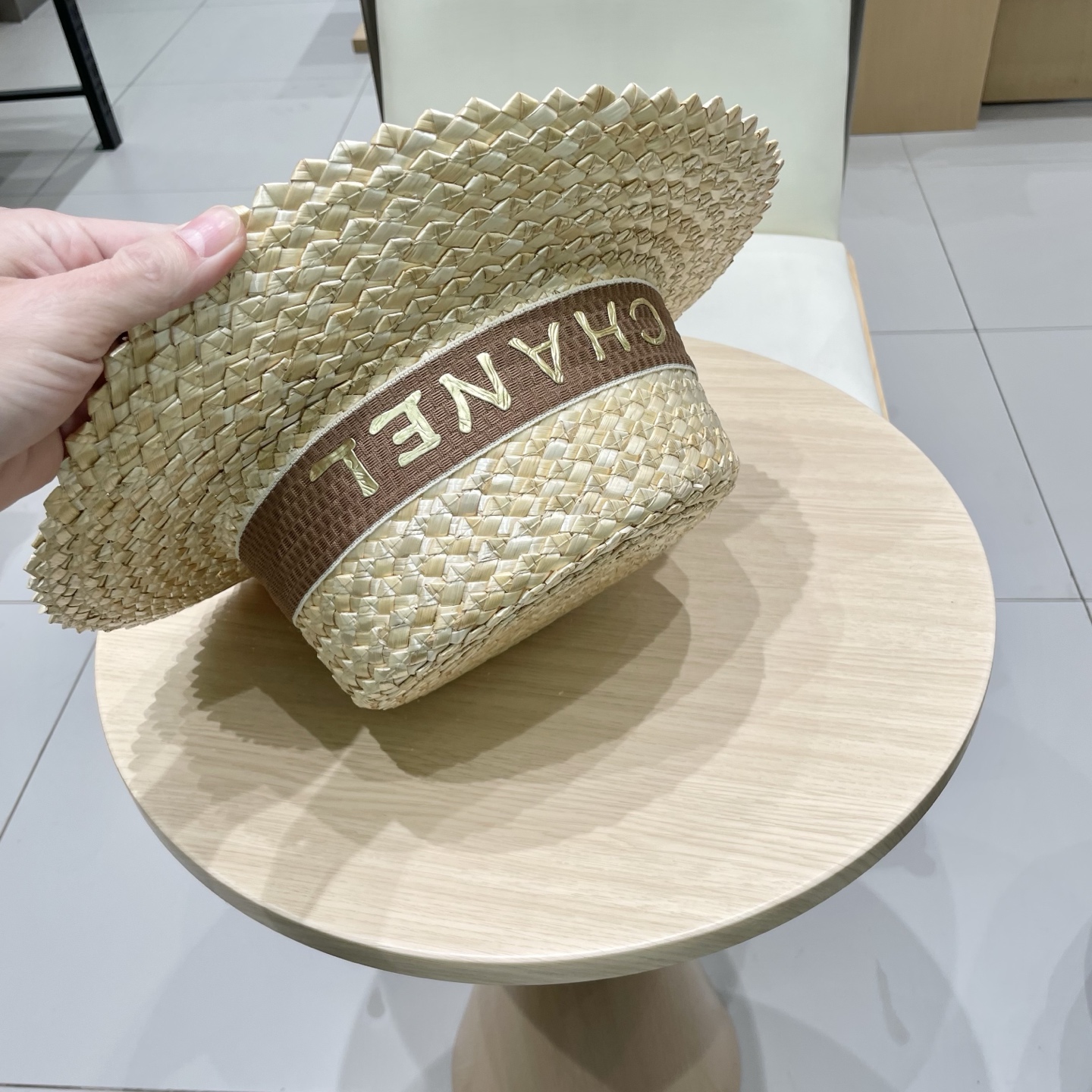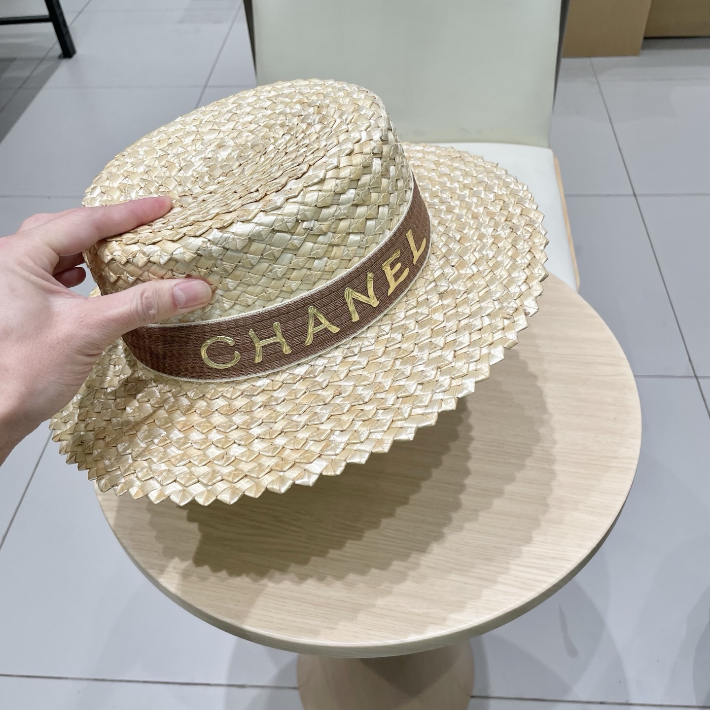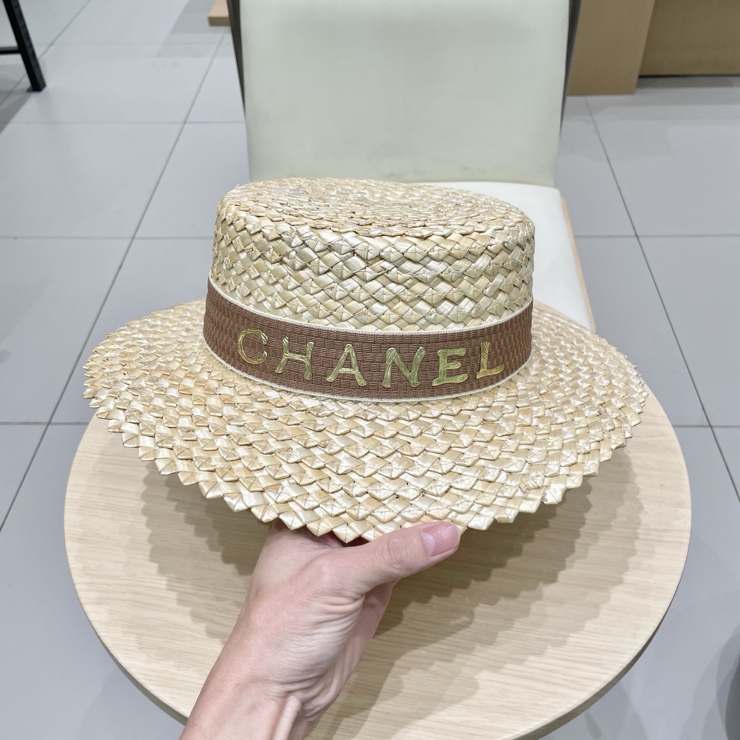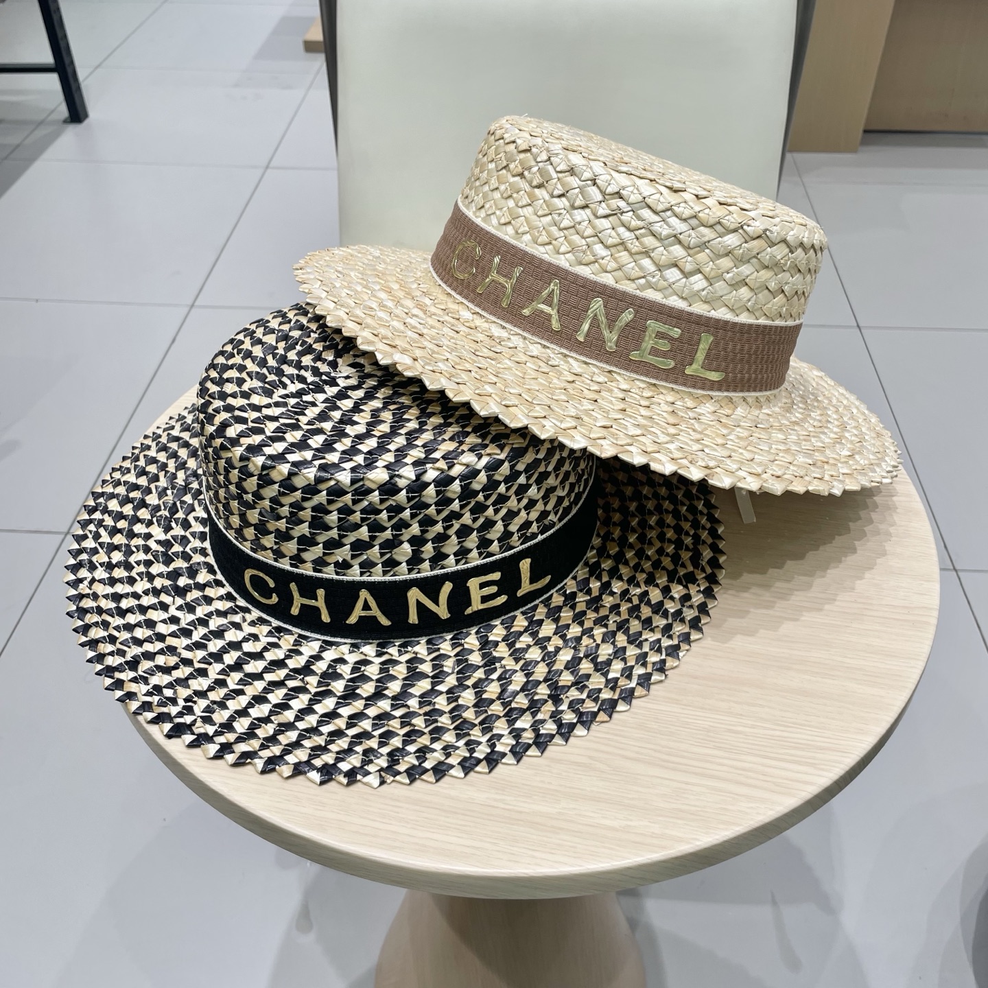 Chanel香奈儿跨境新款菠萝花麦秆草帽黑边草帽夏季凹造型防晒帽子女士平顶帽潮