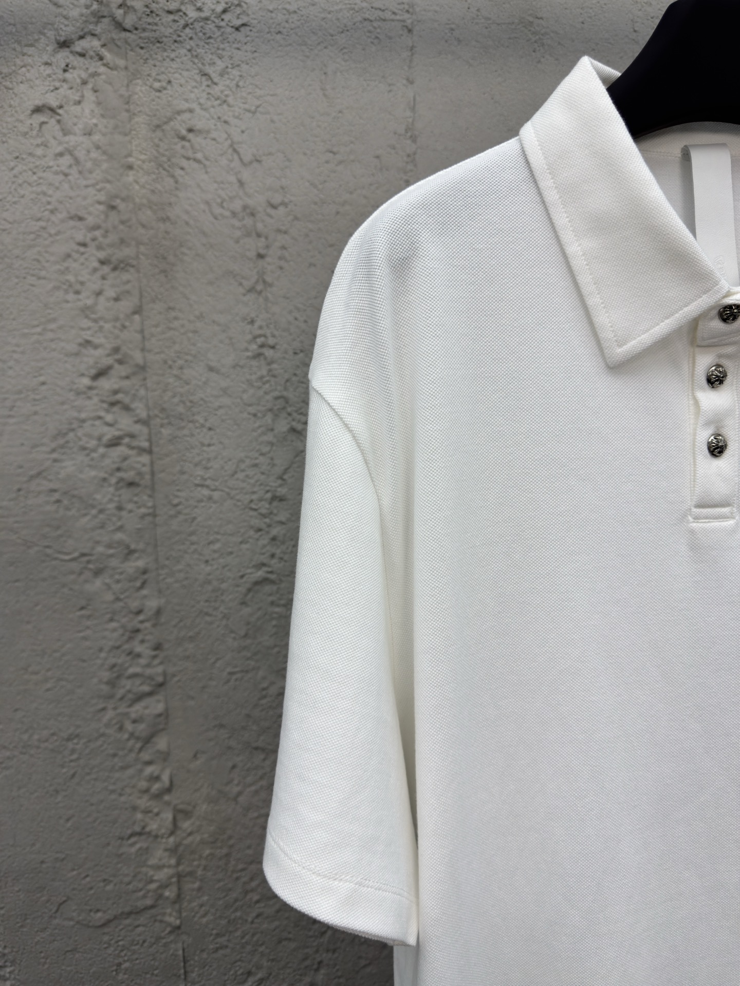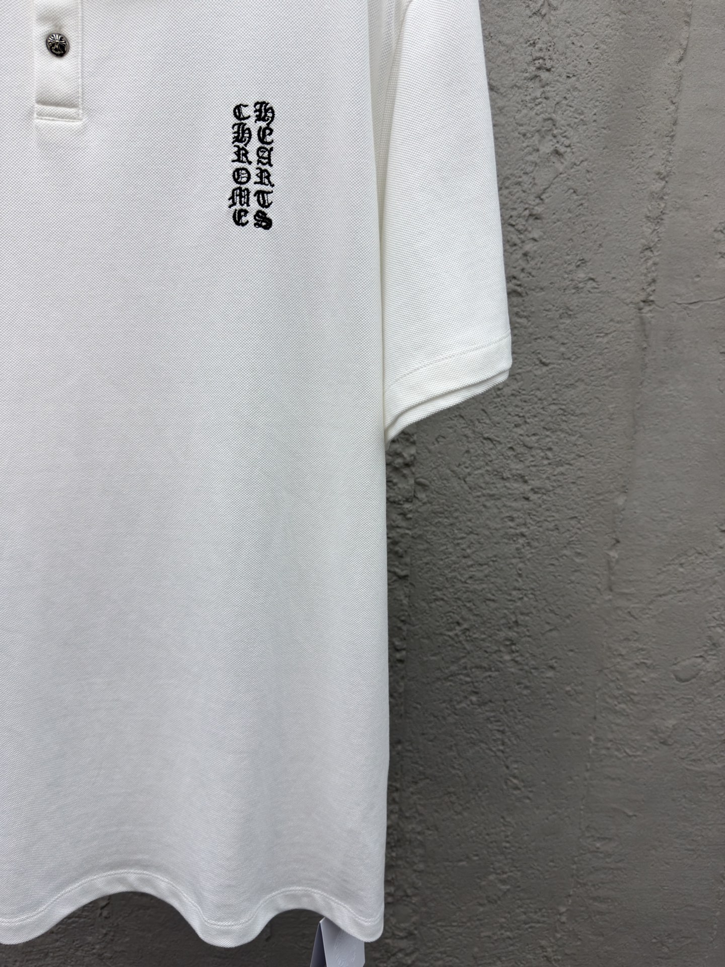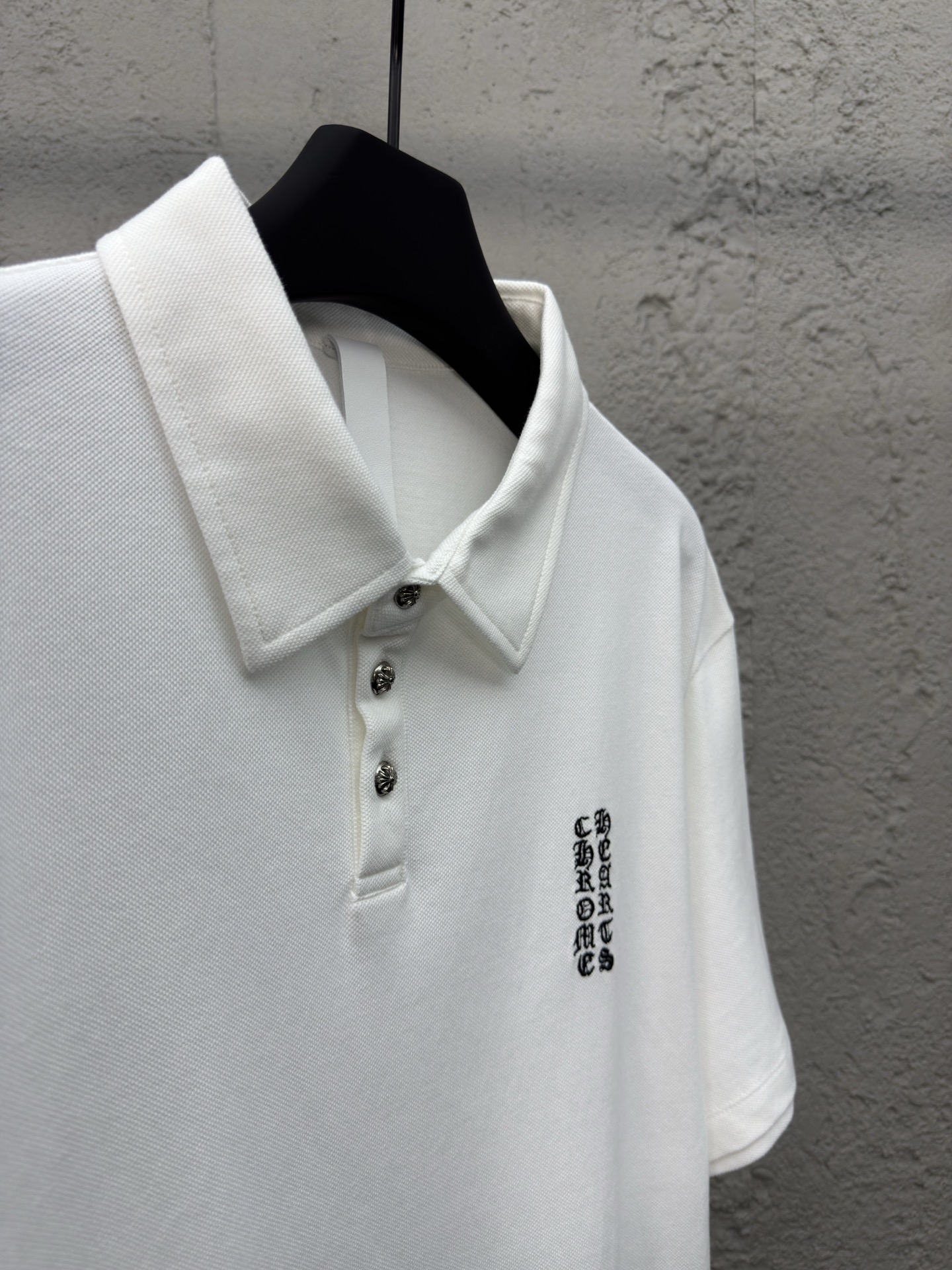 Chrome Hearts 日本限定 POLO衫 工艺说明:面料采用230G纯棉珠地布,胸口以及袖口处通过进口绣花机 高精度刺绣,皮牌采用小羊皮,整体走线平直细腻,面料舒适柔软,颜色一致无色差 能与同款搭配营造时尚造型,驾驭各种场合,定制辅料,三标齐全,男女同款! ⚠️颜色:白色 ⚠️Size:S/M/L