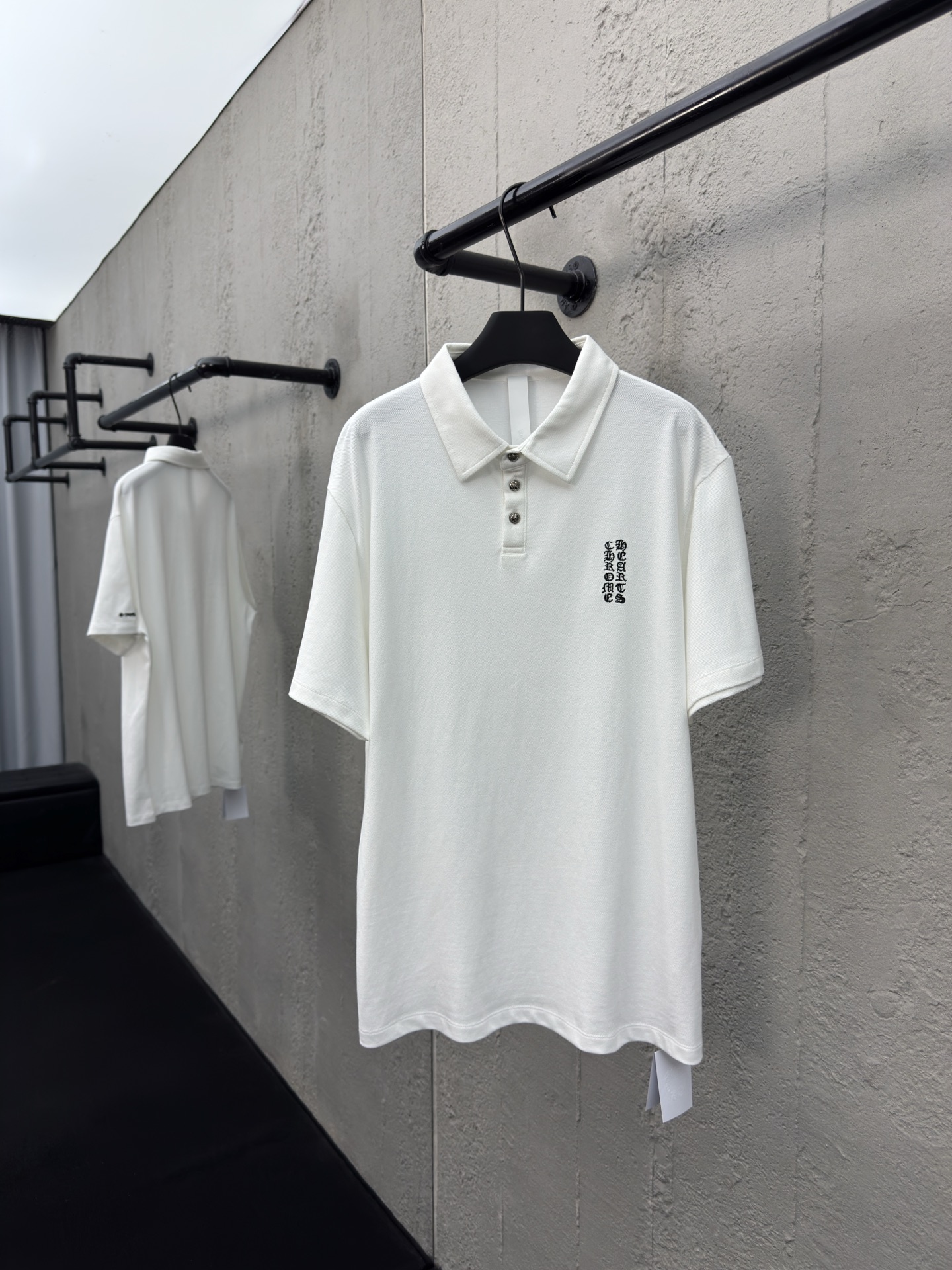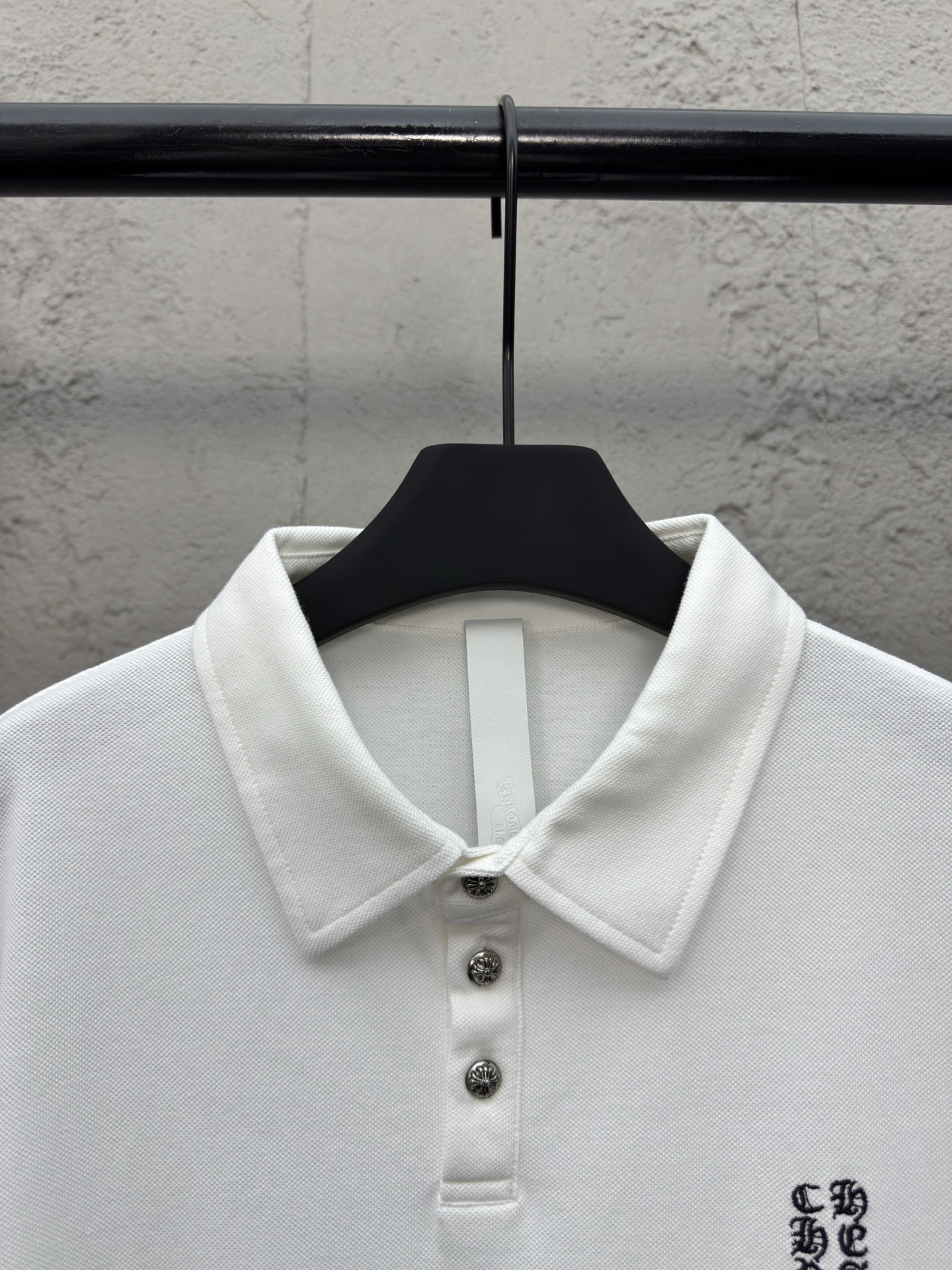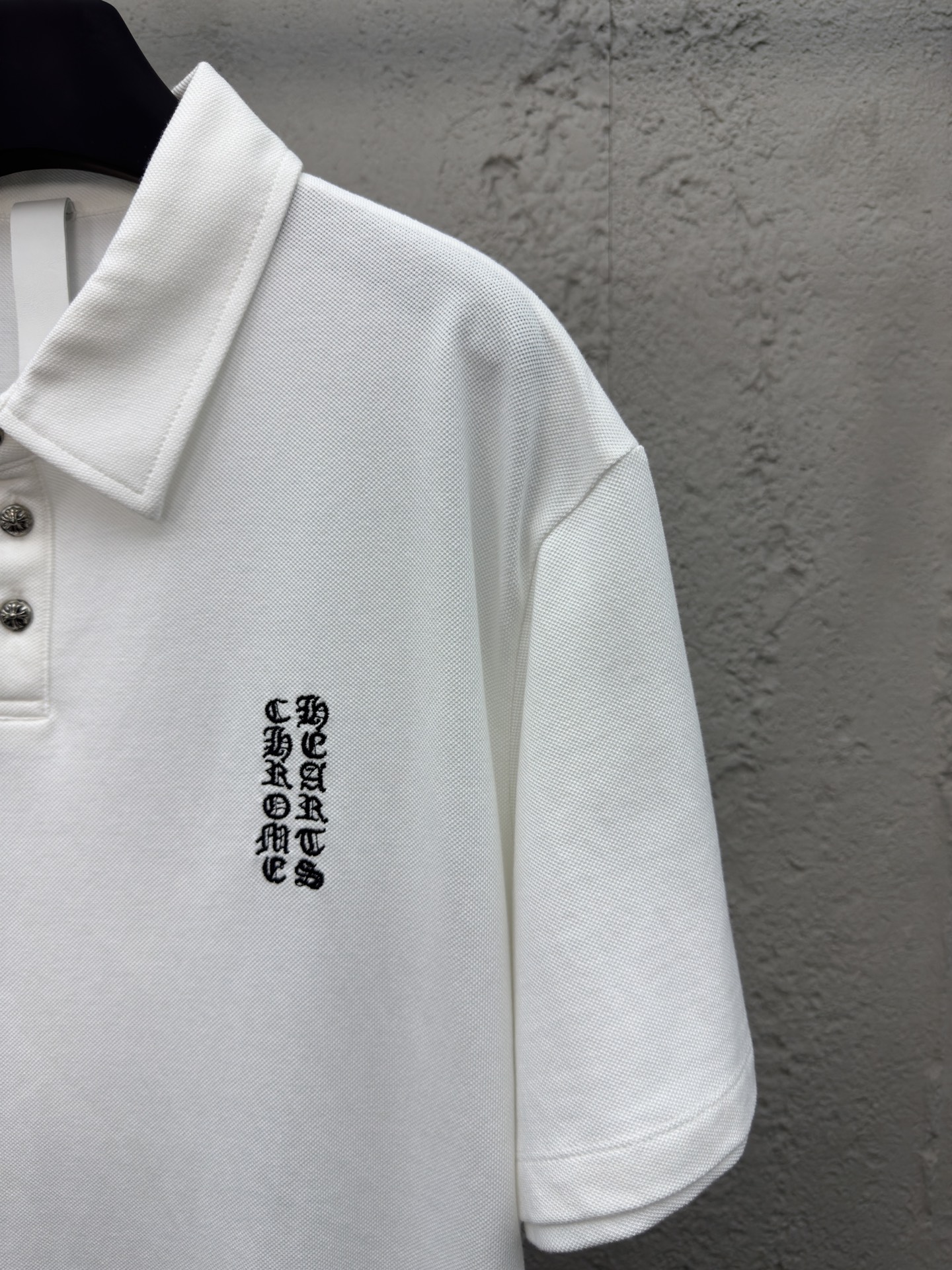 Chrome Hearts 日本限定 POLO衫 工艺说明:面料采用230G纯棉珠地布,胸口以及袖口处通过进口绣花机 高精度刺绣,皮牌采用小羊皮,整体走线平直细腻,面料舒适柔软,颜色一致无色差 能与同款搭配营造时尚造型,驾驭各种场合,定制辅料,三标齐全,男女同款! ⚠️颜色:白色 ⚠️Size:S/M/L