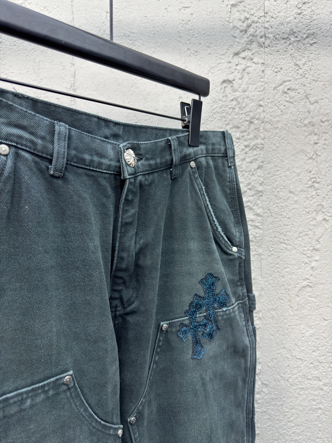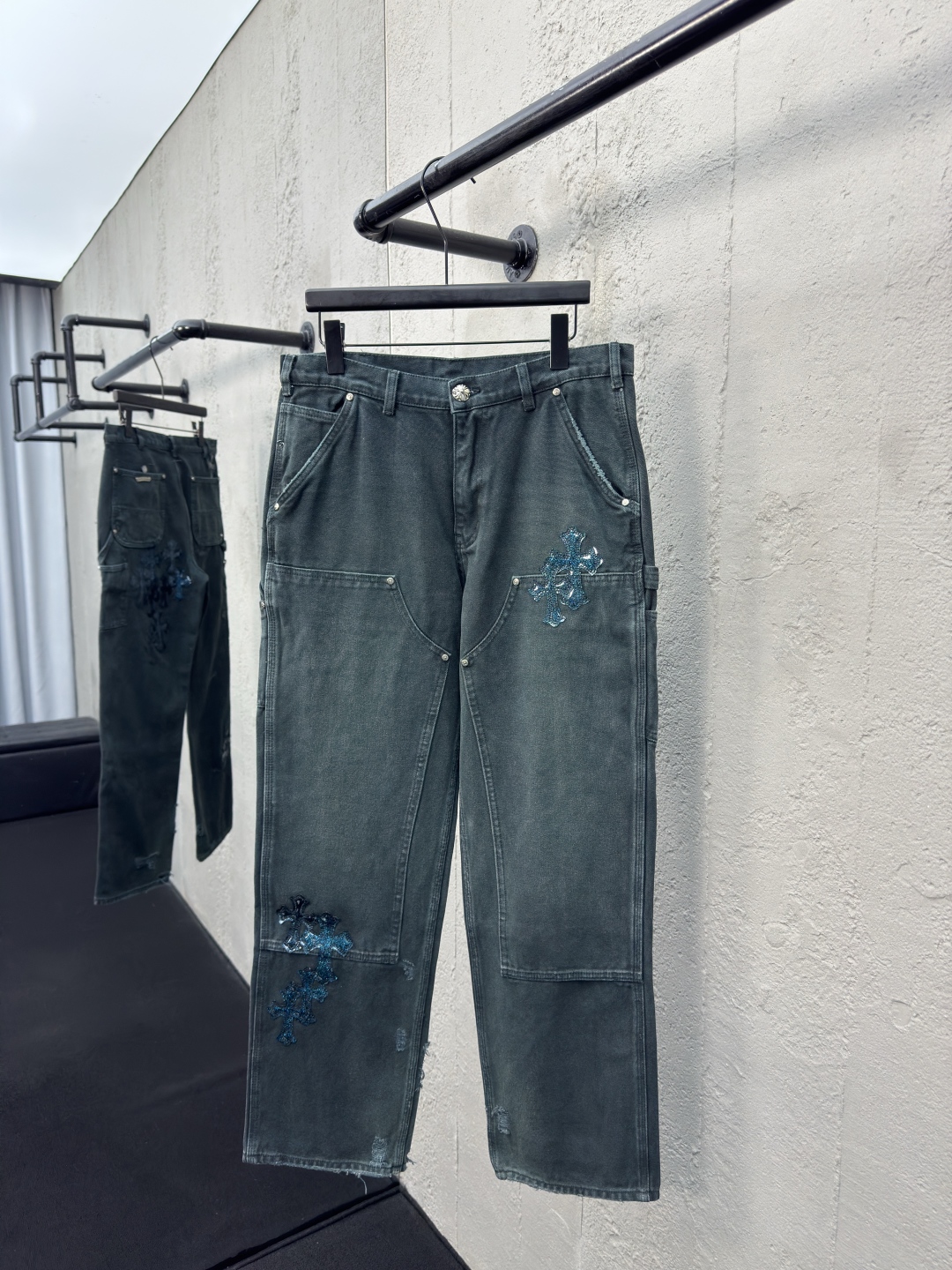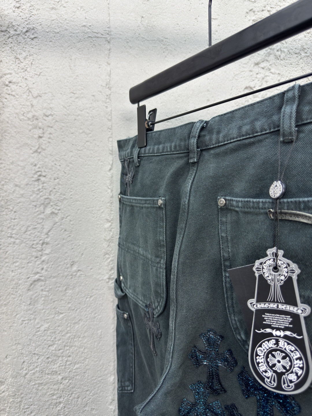 Chrome Hearts 真皮十字架工装牛仔裤 工艺说明:面料采用竹节牛仔布料,洗水工艺采用重酵洗炒花色,喷马骝等等多工艺结合。真皮贴饰 直筒下摆设计,整体走线平直细腻,面料舒适柔软,颜色一致无色差 能与同款搭配营造时尚造型,驾驭各种场合,定制辅料,三标齐全,男女同款! ⚠️颜色:青色 ⚠️Size:31/32/33/34
