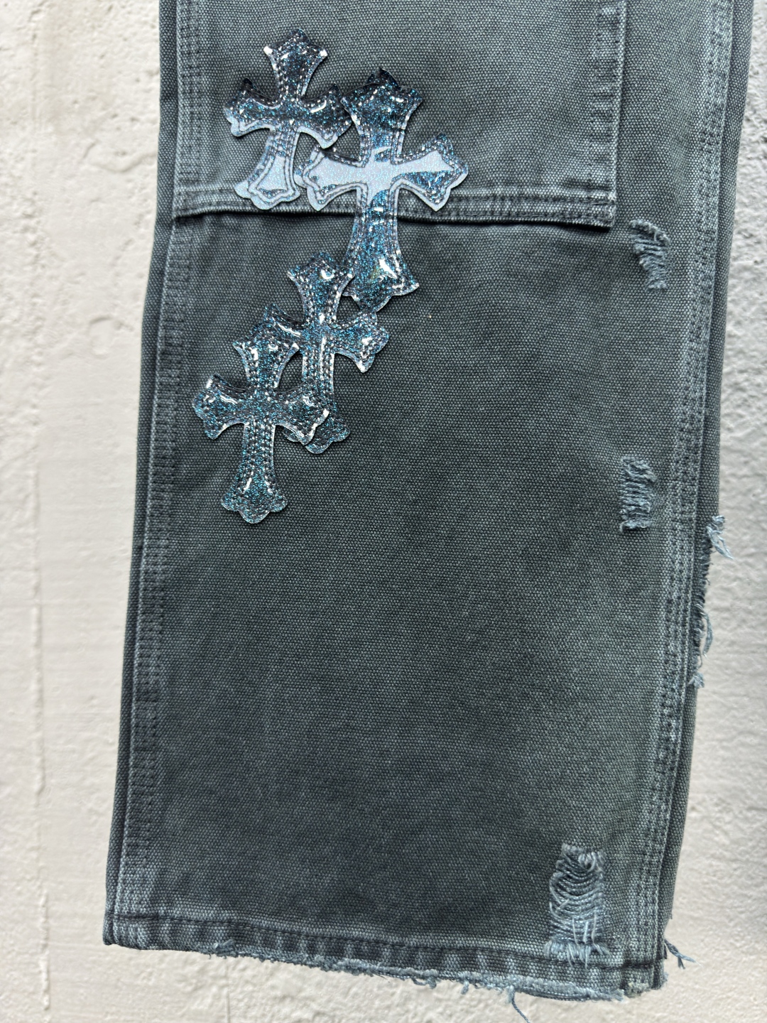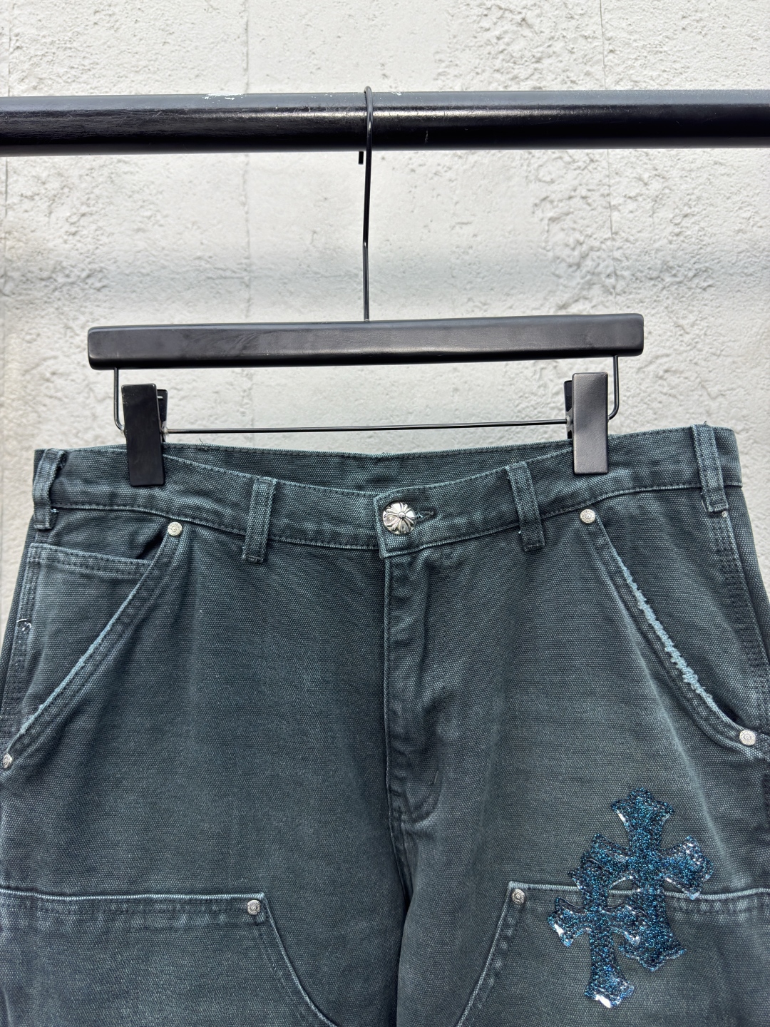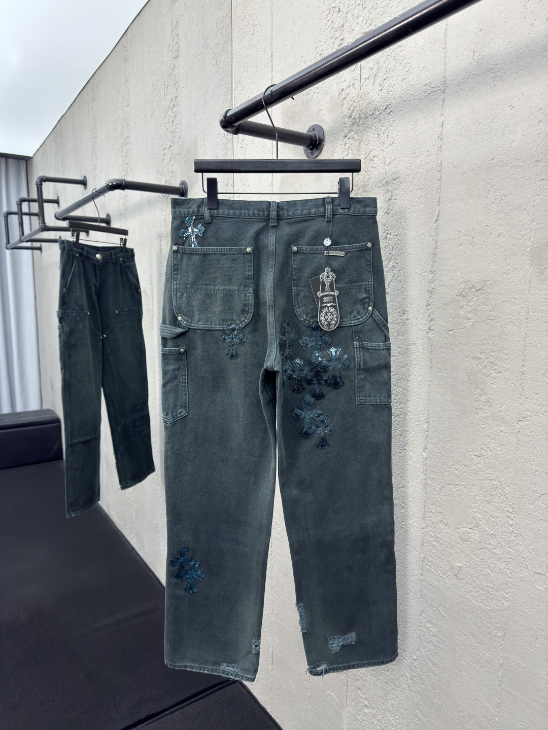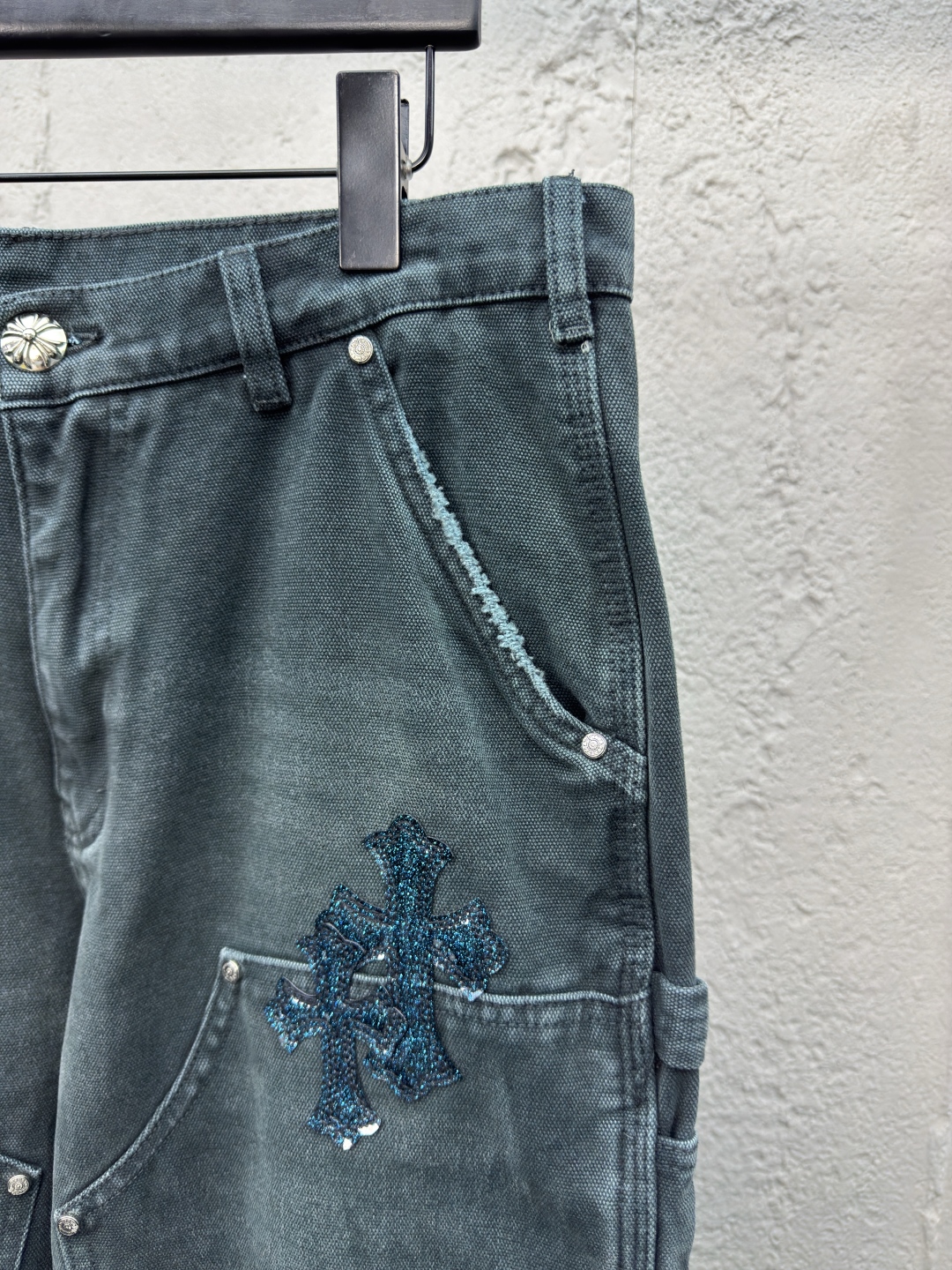 Chrome Hearts 真皮十字架工装牛仔裤 工艺说明:面料采用竹节牛仔布料,洗水工艺采用重酵洗炒花色,喷马骝等等多工艺结合。真皮贴饰 直筒下摆设计,整体走线平直细腻,面料舒适柔软,颜色一致无色差 能与同款搭配营造时尚造型,驾驭各种场合,定制辅料,三标齐全,男女同款! ⚠️颜色:青色 ⚠️Size:31/32/33/34