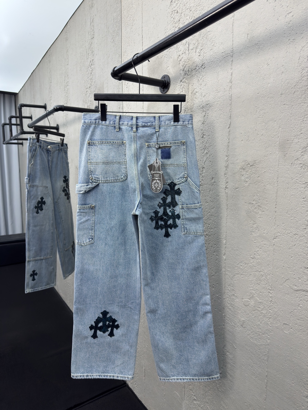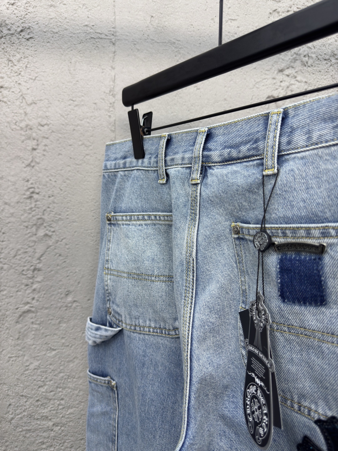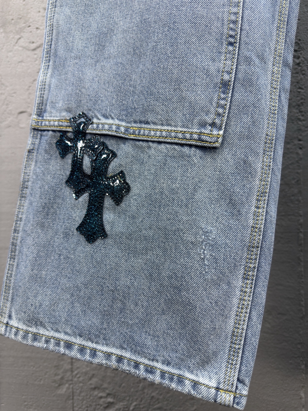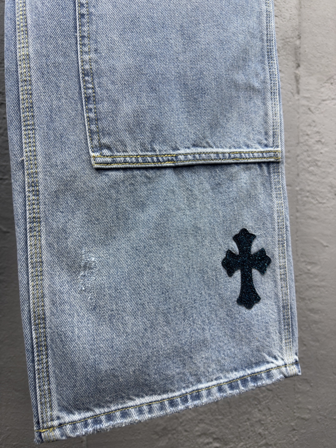 Chrome Hearts 真皮十字架工装牛仔裤 工艺说明:面料采用竹节牛仔布料,洗水工艺采用重酵洗炒花色,喷马骝等等多工艺结合。真皮贴饰 直筒下摆设计,整体走线平直细腻,面料舒适柔软,颜色一致无色差 能与同款搭配营造时尚造型,驾驭各种场合,定制辅料,三标齐全,男女同款! ⚠️颜色:蓝色 ⚠️Size:30/32/34/36