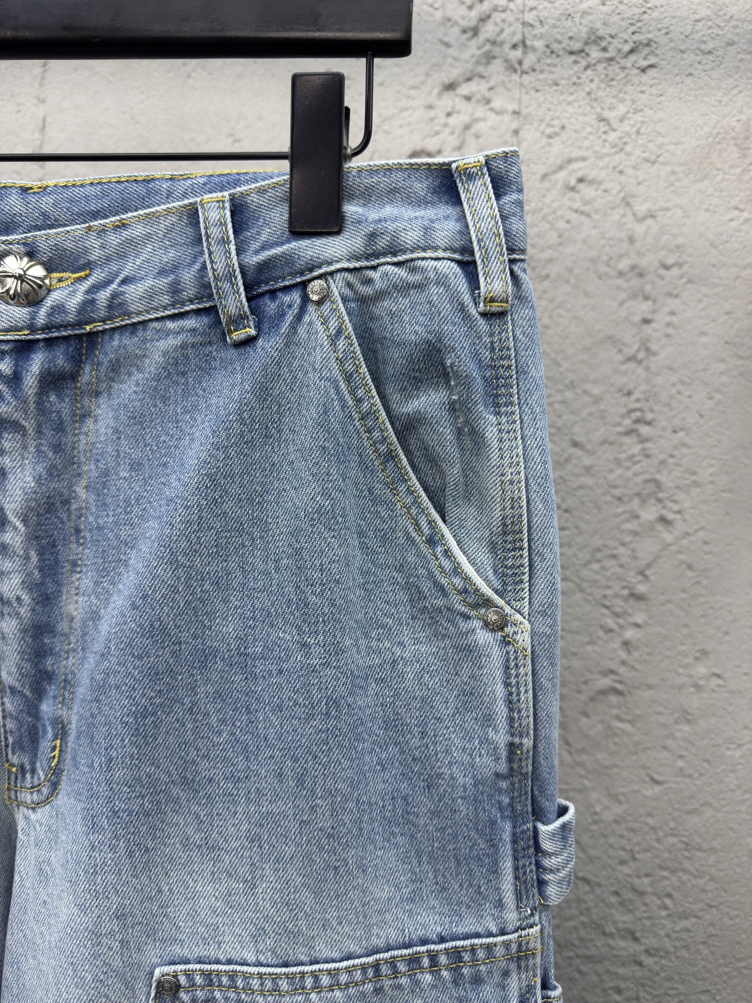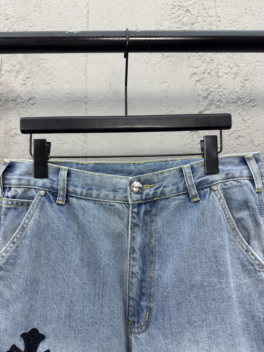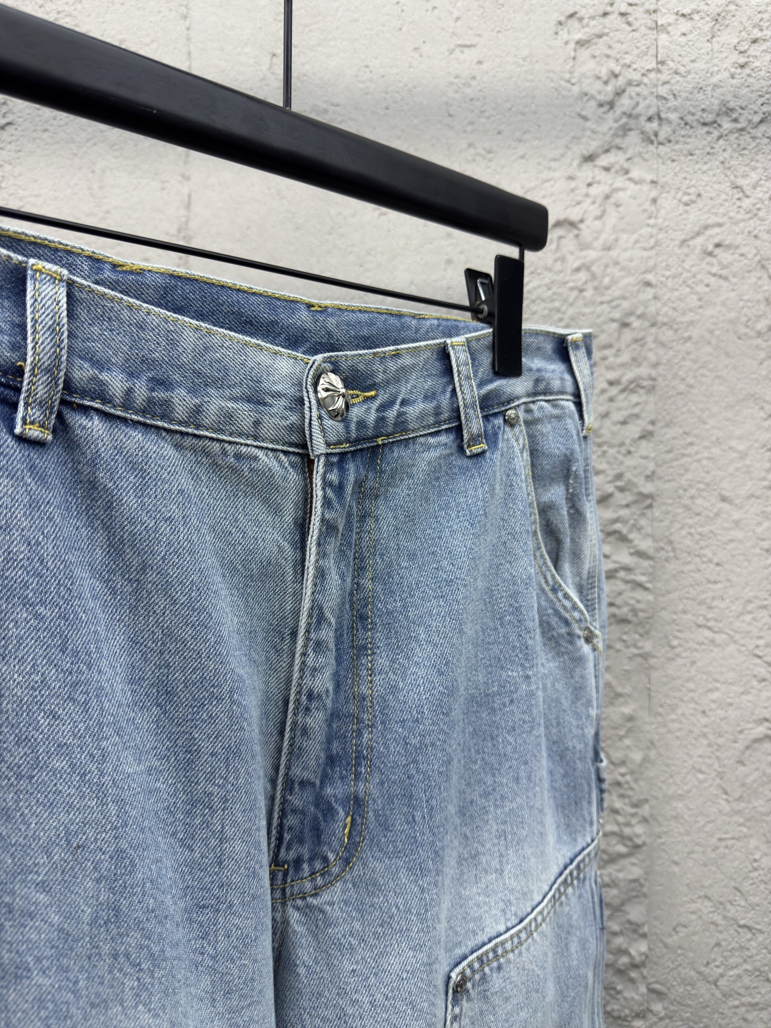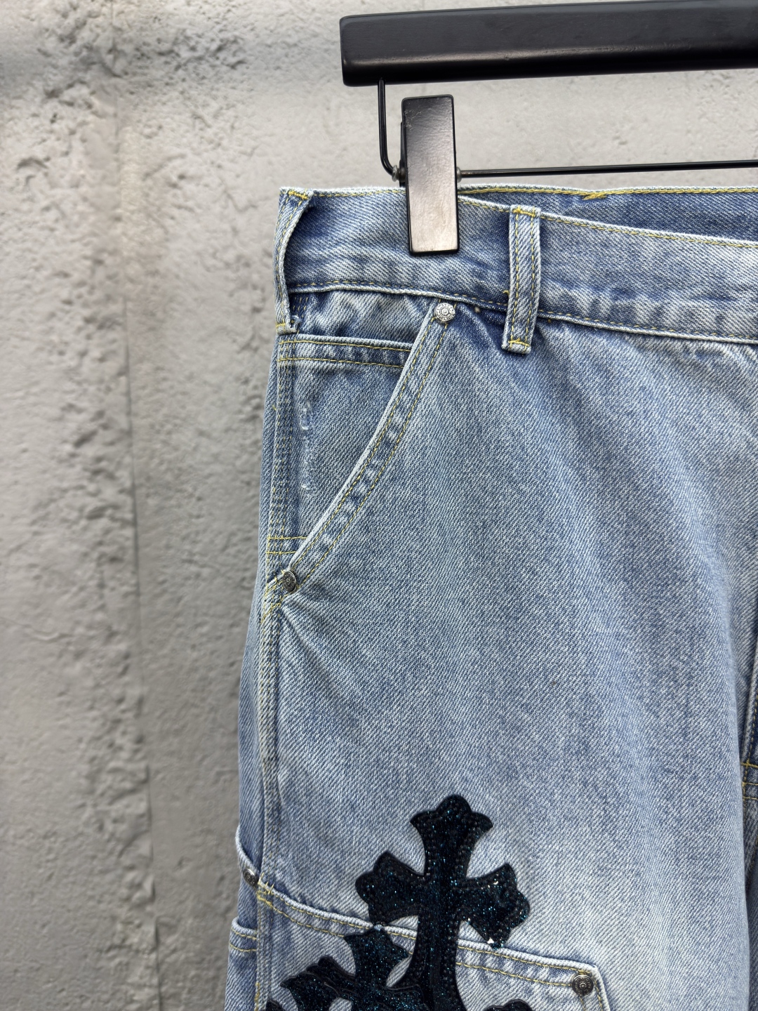 Chrome Hearts 真皮十字架工装牛仔裤 工艺说明:面料采用竹节牛仔布料,洗水工艺采用重酵洗炒花色,喷马骝等等多工艺结合。真皮贴饰 直筒下摆设计,整体走线平直细腻,面料舒适柔软,颜色一致无色差 能与同款搭配营造时尚造型,驾驭各种场合,定制辅料,三标齐全,男女同款! ⚠️颜色:蓝色 ⚠️Size:30/32/34/36