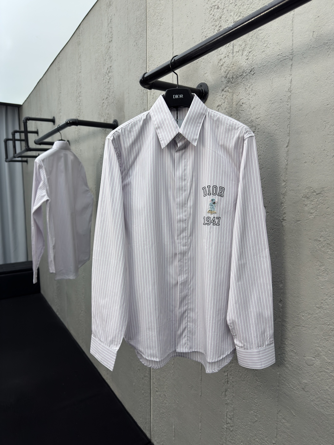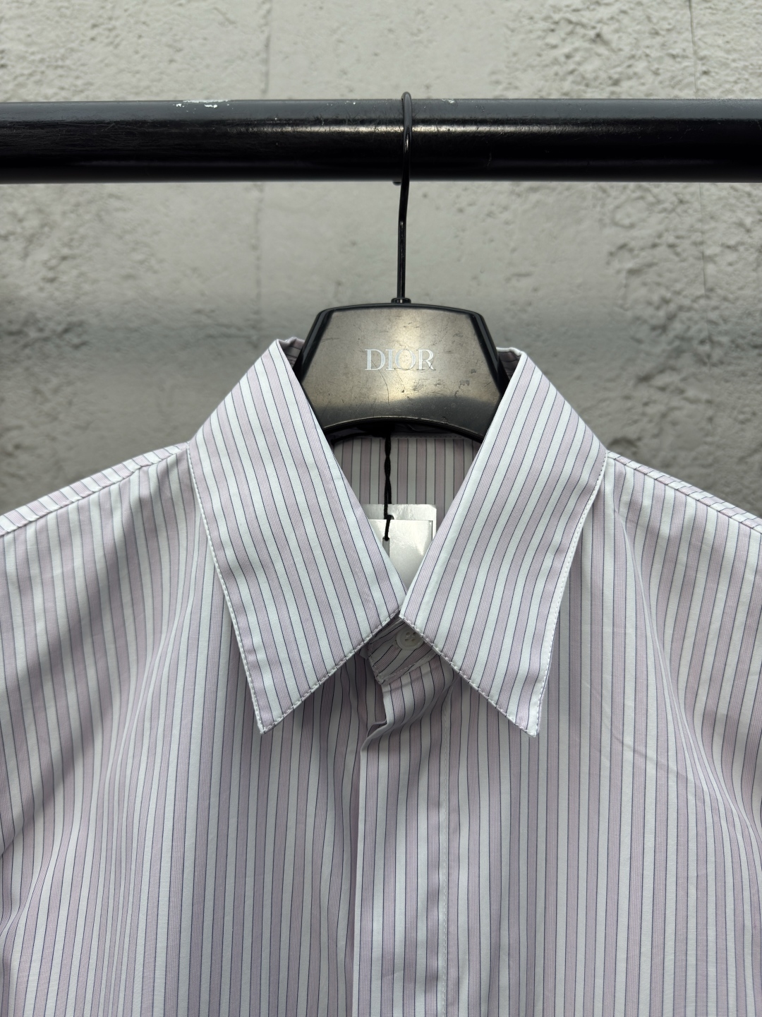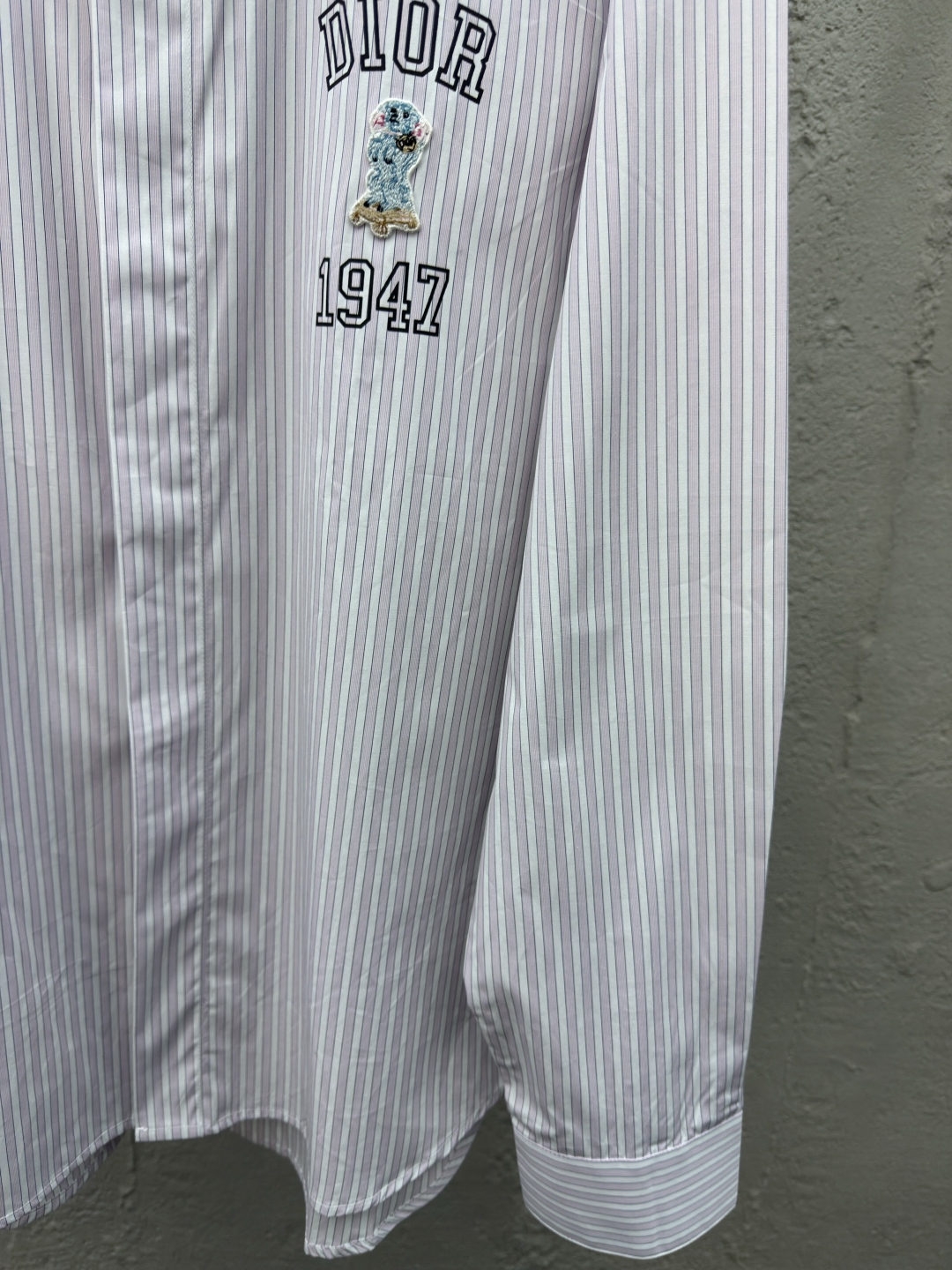 DIOR 条纹小狗刺绣衬衫 工艺说明:定制浅紫色条纹棉质面料,前胸狗狗刺绣章仔,品牌标识性字母和数字印花,隐藏式纽扣开合门襟,整体走线平直细腻,面料舒适柔软,颜色一致无色差 能与同款搭配营造时尚造型,驾驭各种场合,定制辅料,三标齐全,男女同款! ⚠️颜色:粉色 ⚠️Size:38/39/40/41