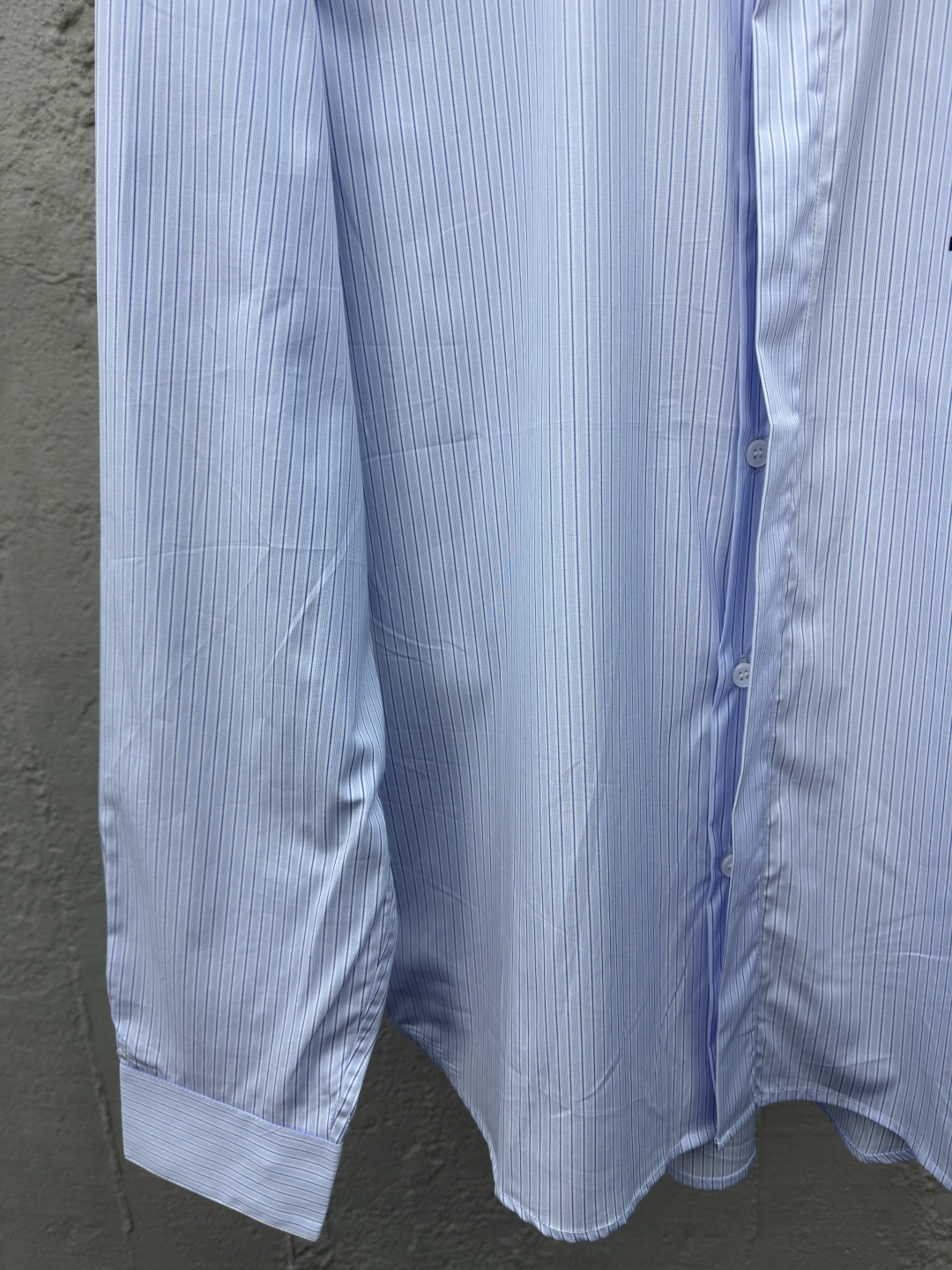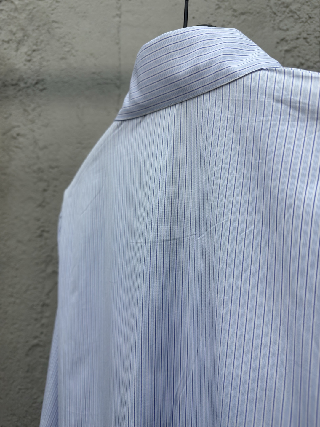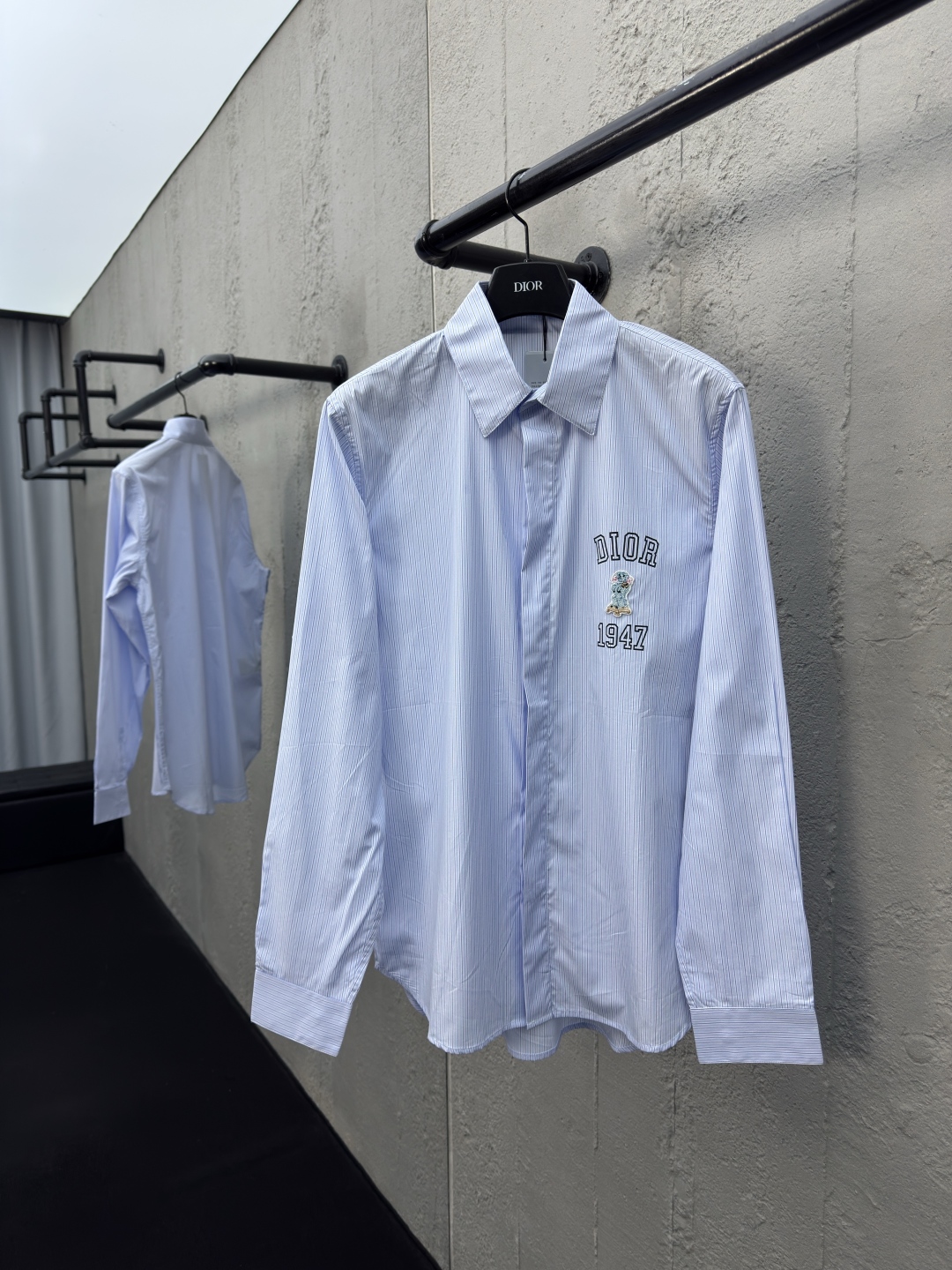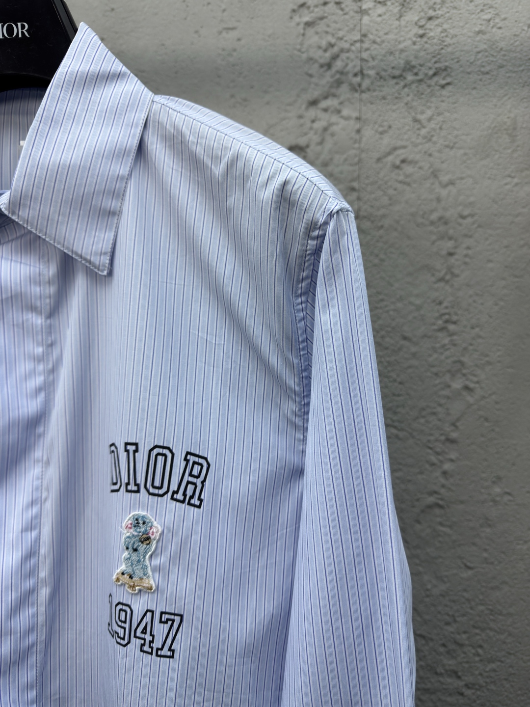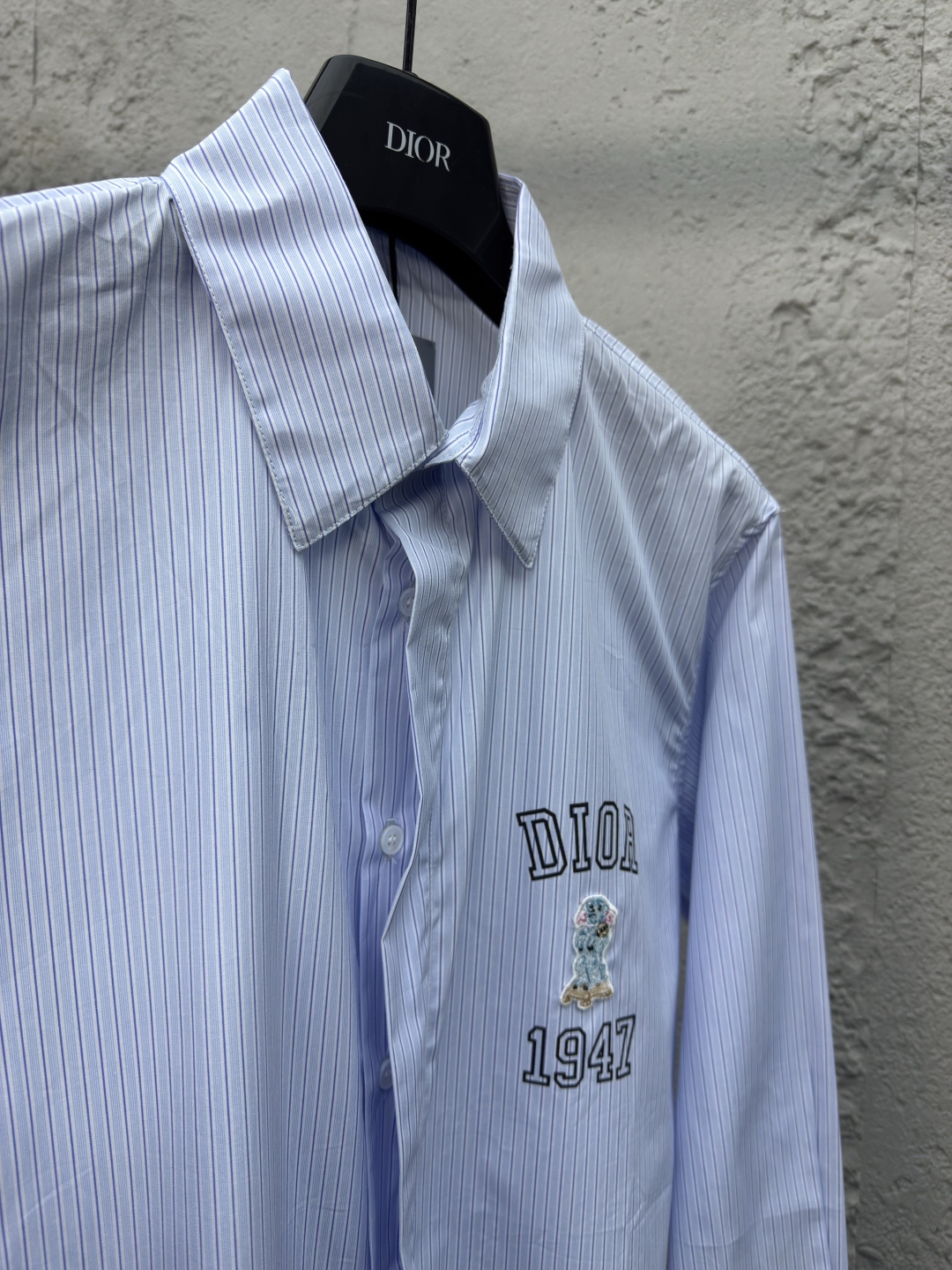 DIOR 条纹小狗刺绣衬衫 工艺说明:定制浅紫色条纹棉质面料,前胸狗狗刺绣章仔,品牌标识性字母和数字印花,隐藏式纽扣开合门襟,整体走线平直细腻,面料舒适柔软,颜色一致无色差 能与同款搭配营造时尚造型,驾驭各种场合,定制辅料,三标齐全,男女同款! ⚠️颜色:浅蓝色 ⚠️Size:38/39/40/41