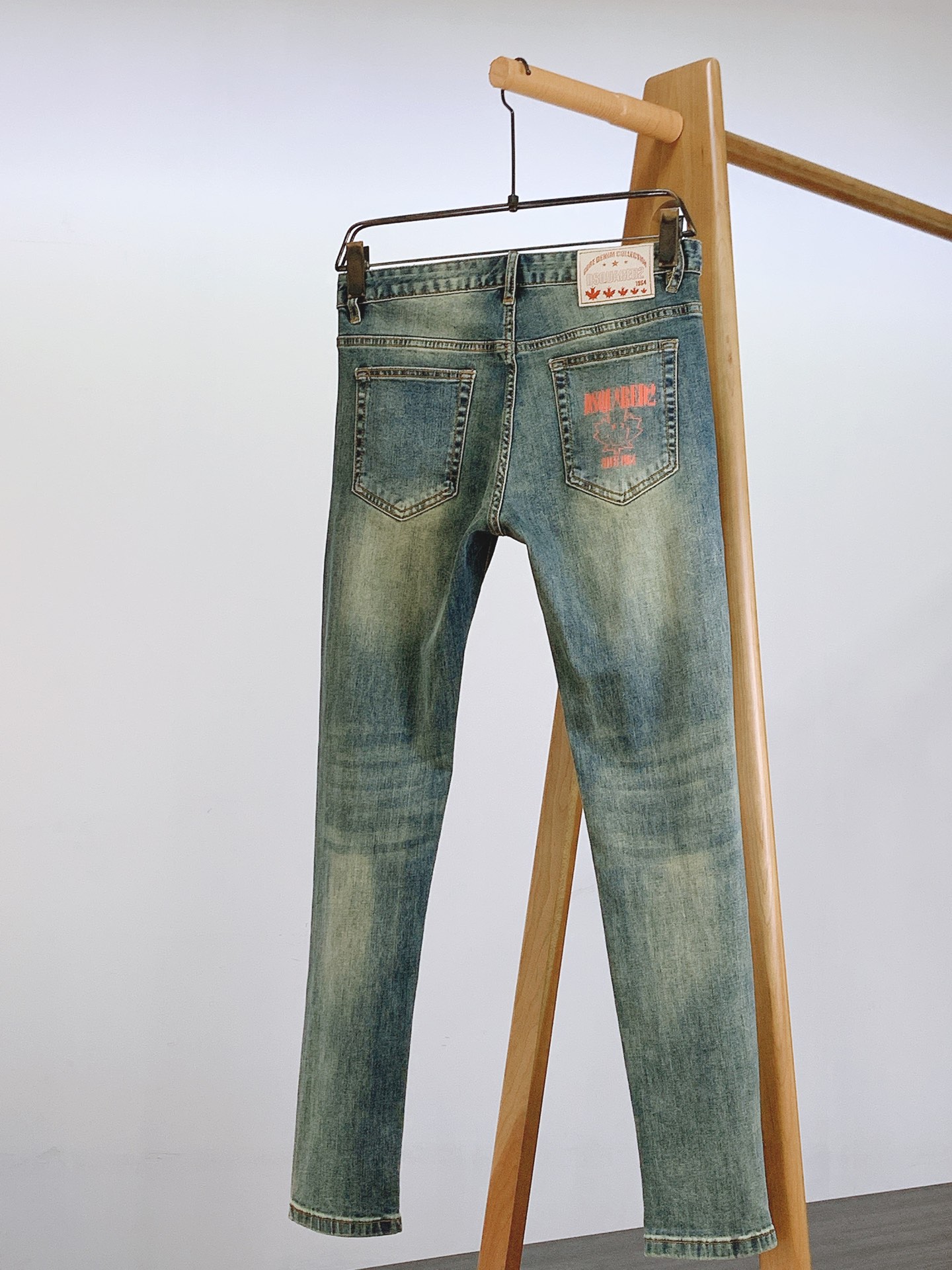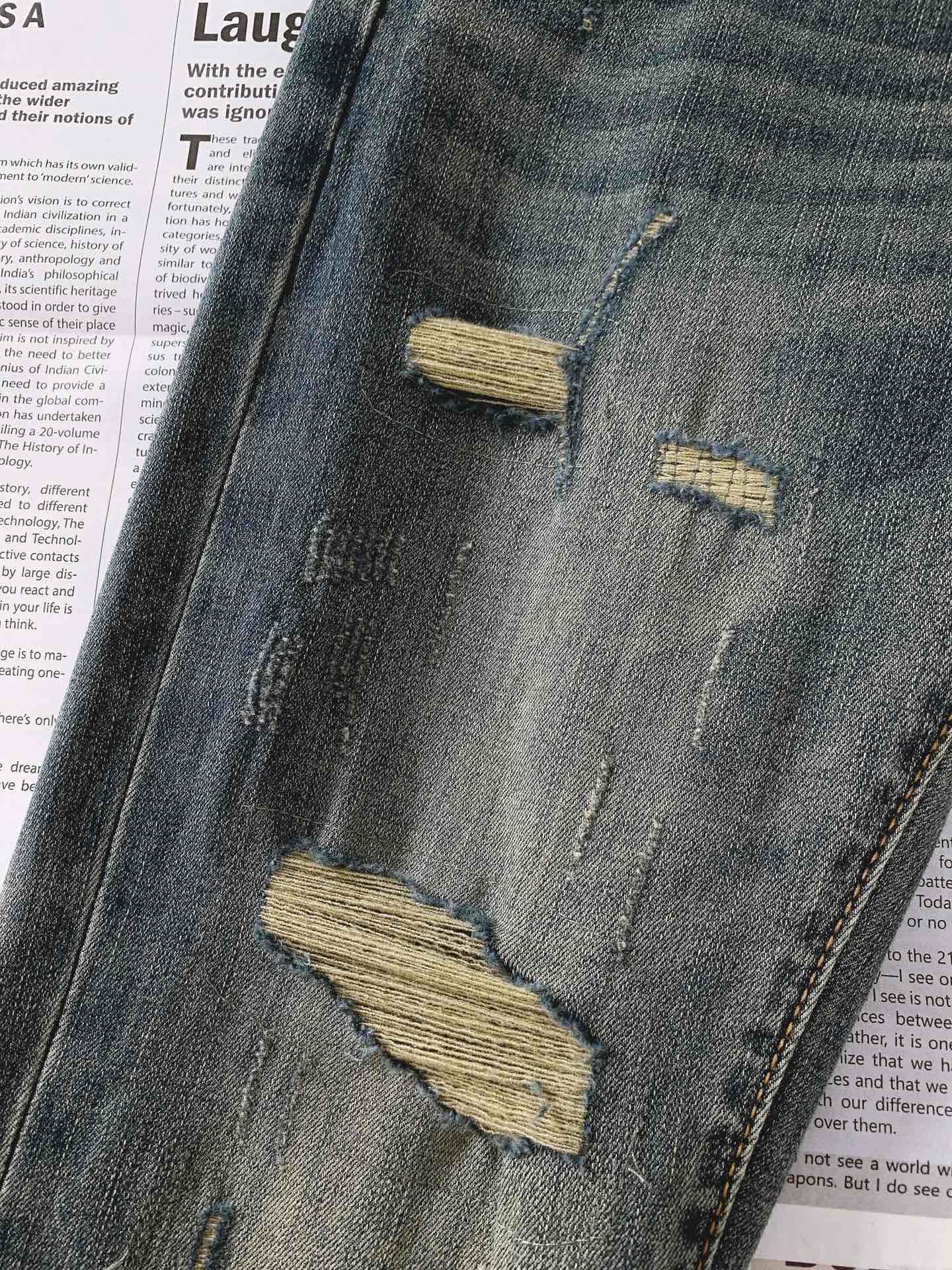 重工破洞印花牛仔裤 ,进口水洗弹力面料,超重工洗水工艺,上身舒适透气有弹力,客供五金辅料装饰,裤腿做旧破洞设计,工艺精湛,版型超正,全品相订单款,上身帅气十足