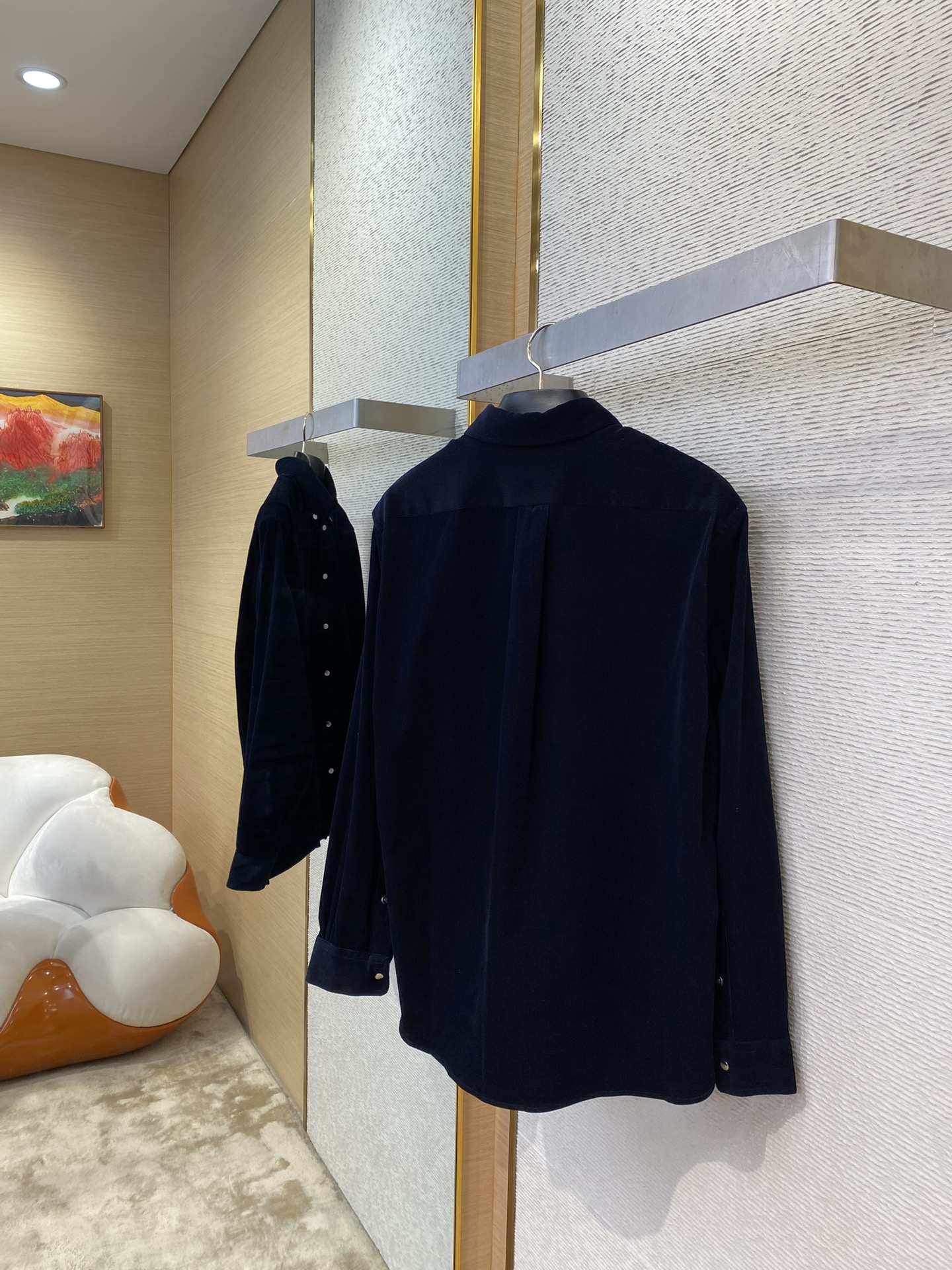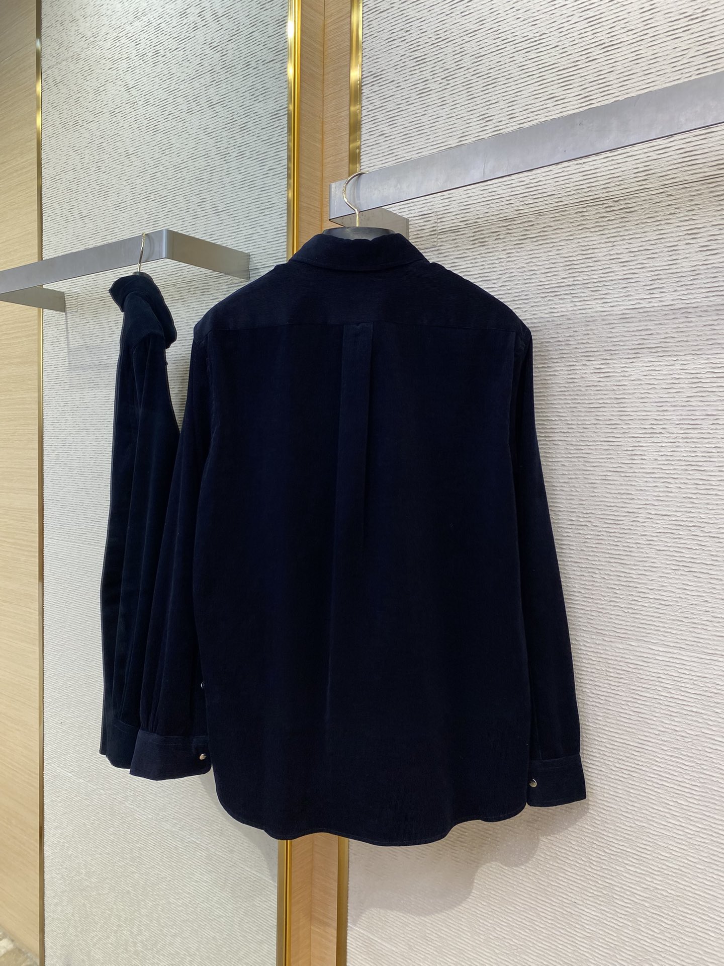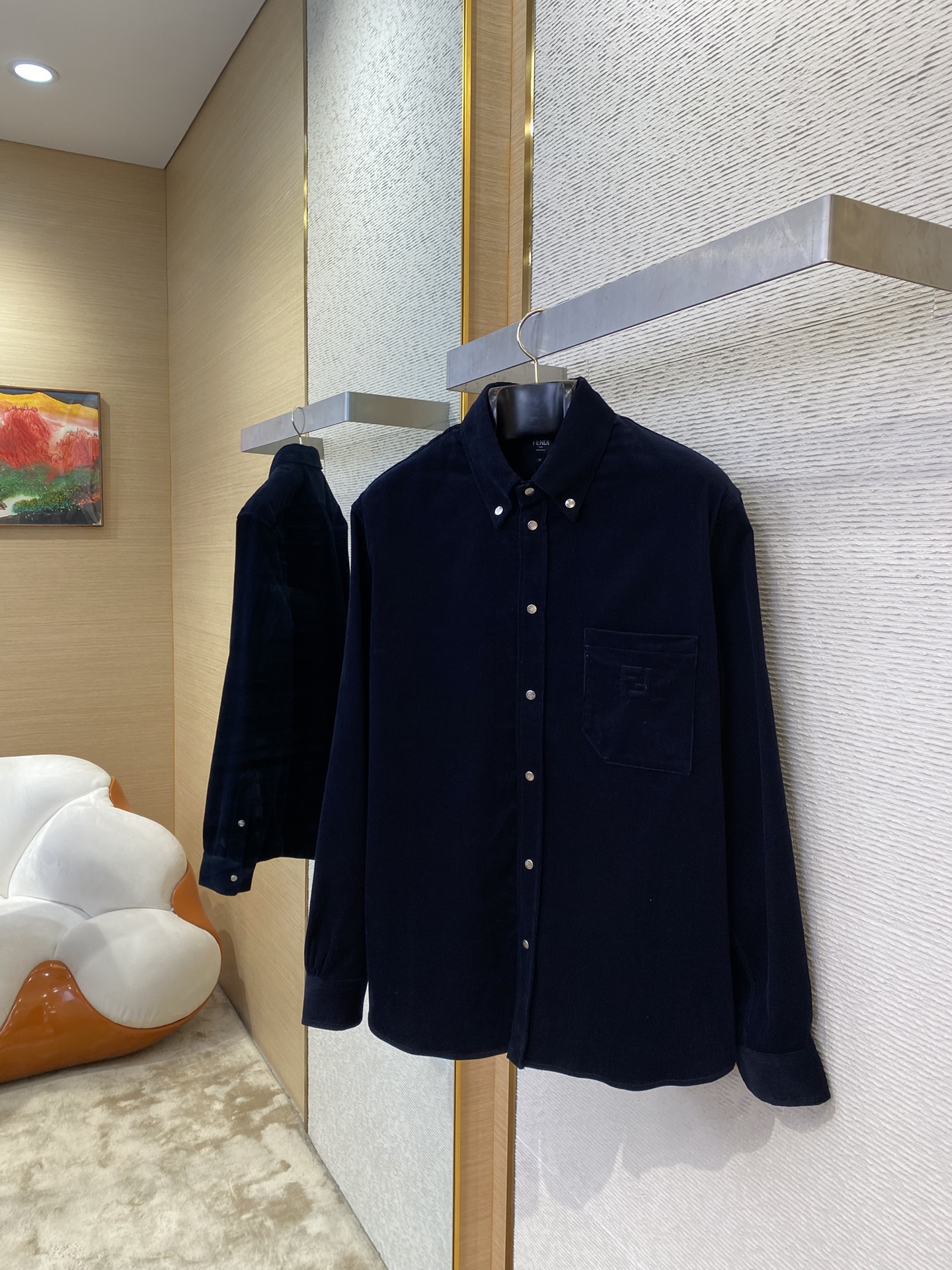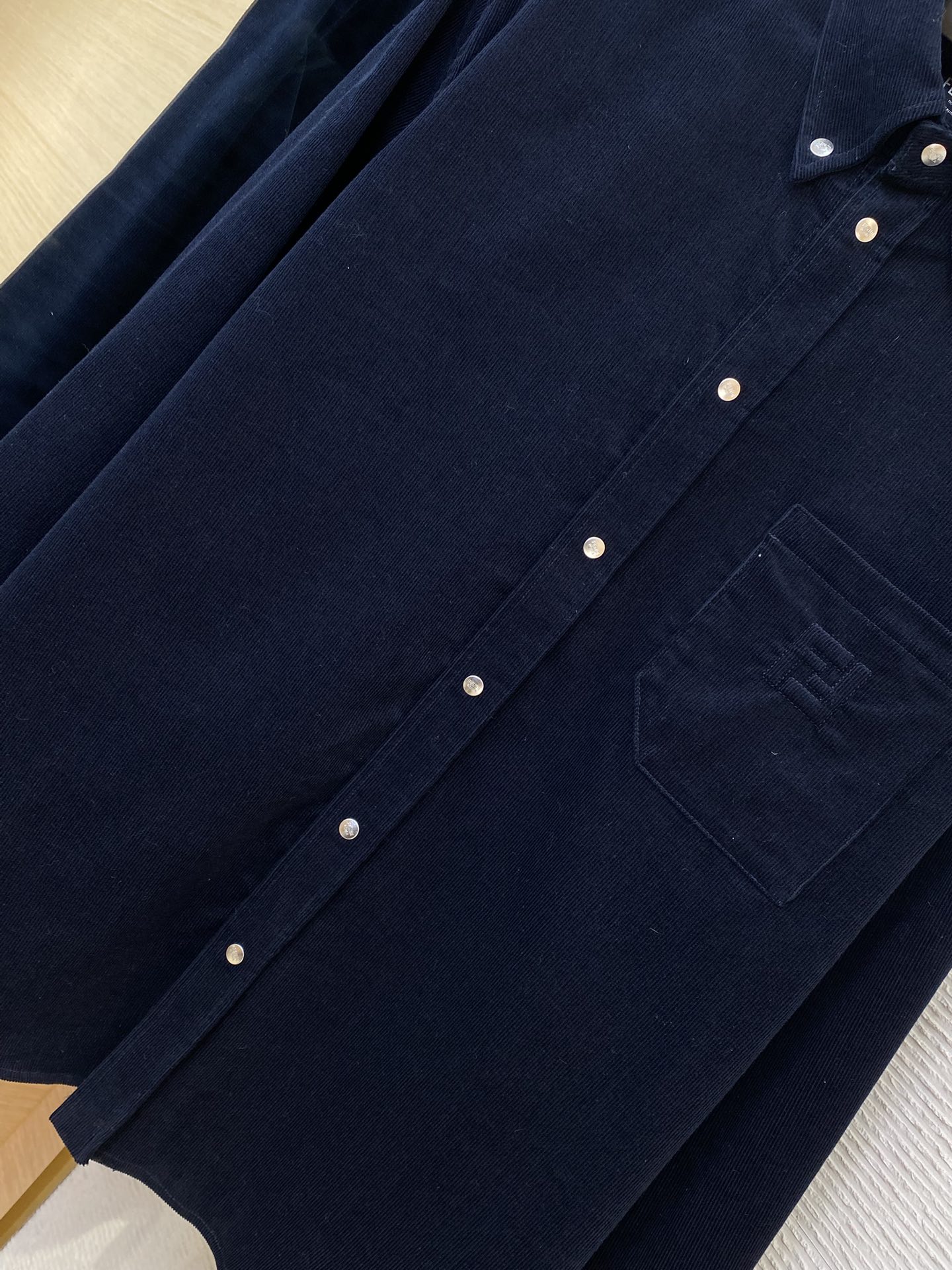 YB购入打版,采用定制灯芯绒面料,胸口贴袋上0.2mm极细绣线勾勒双F图案,12色撞色丝线叠出立体光影,刺绣边缘用军工级回针缝加固,通过外露纽扣固定显得更加休闲且不易变形,面扣外露部分带有FEN家字母LOGO,区别传统衬衫的纽扣方式,肩部接缝处采用双针车缝制而成,立体剪裁版型,定制辅料,三标齐全,男女同款!