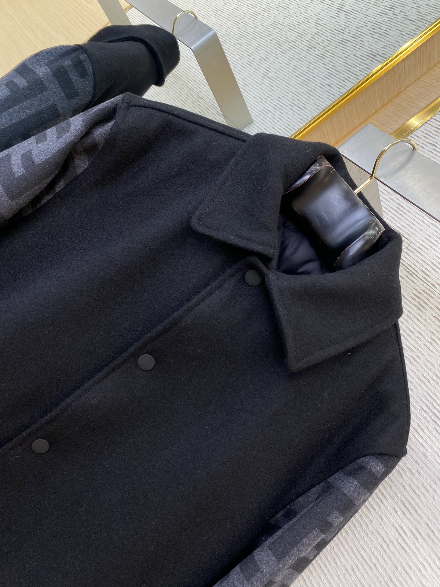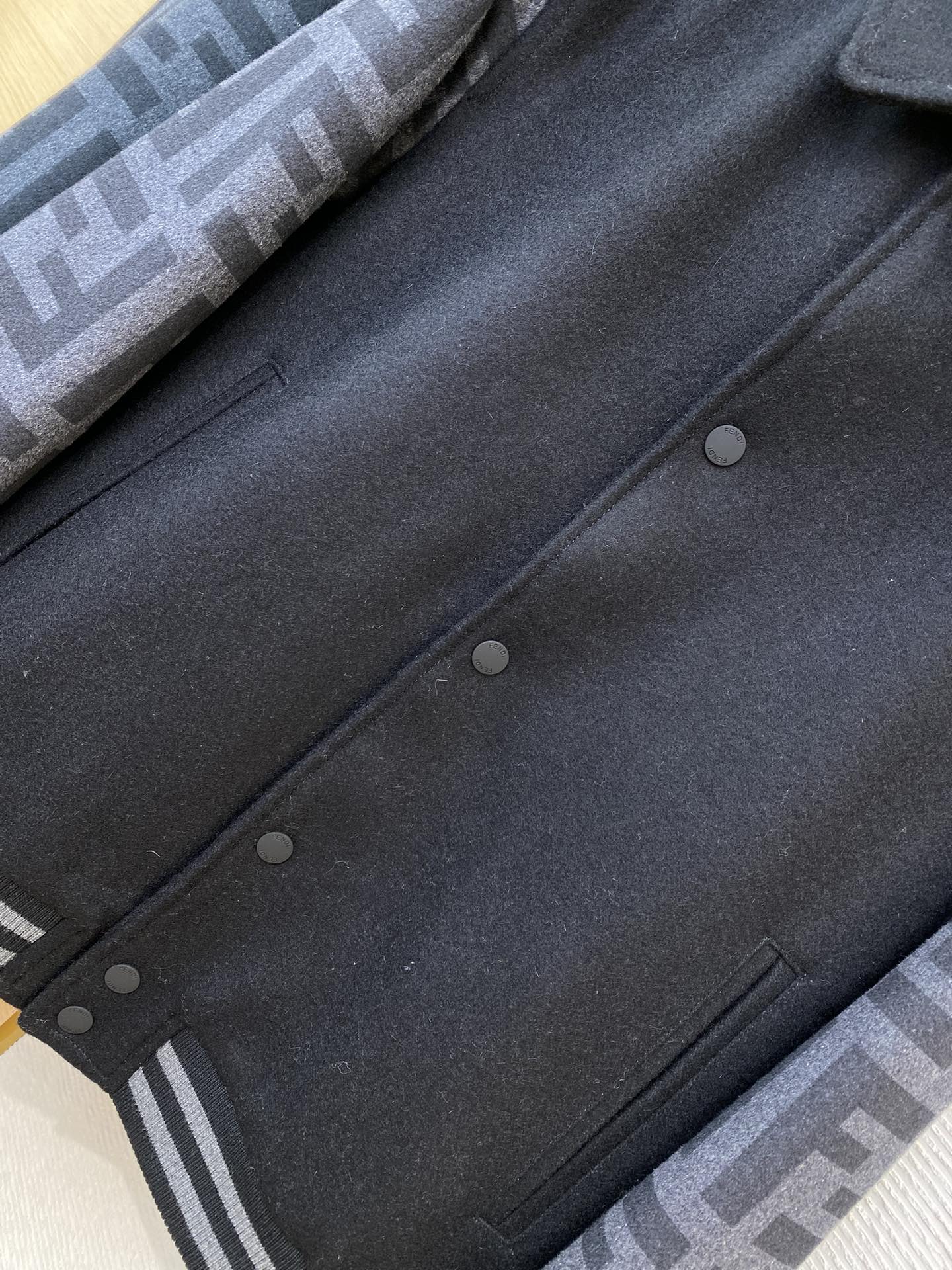 YB购入打版,采用定制羊毛混纺面料,市面混纺比例不佳或工艺差,羊毛粗硬,可能刺激皮肤,尤其敏感肤质人群,通过拔染印花技术将芬家经典的双F提花,呈现于袖子点缀,因印花的独特效果使提花细致精密,轮廓清晰,做到了一比一的还原,既保留了毛呢的质感,又增添了品牌辨识度,定制四合扣开合,面扣刻有FEN家字母,整体更轻便,美观,两侧均设侧插袋,袋口做了包边,使其更牢固平整,袖口和下摆采用棉质双色螺纹装饰,使用双针床针织机编制而成,定制辅料,三标齐全,男女同款!