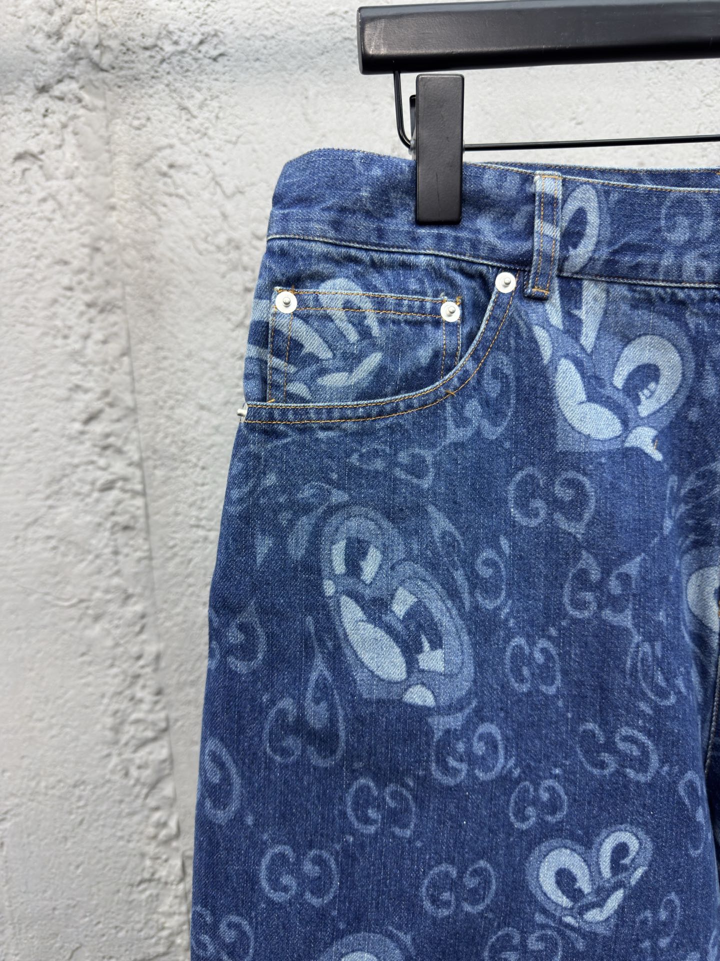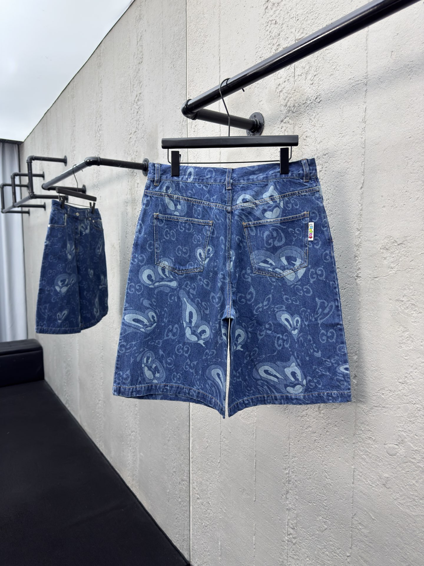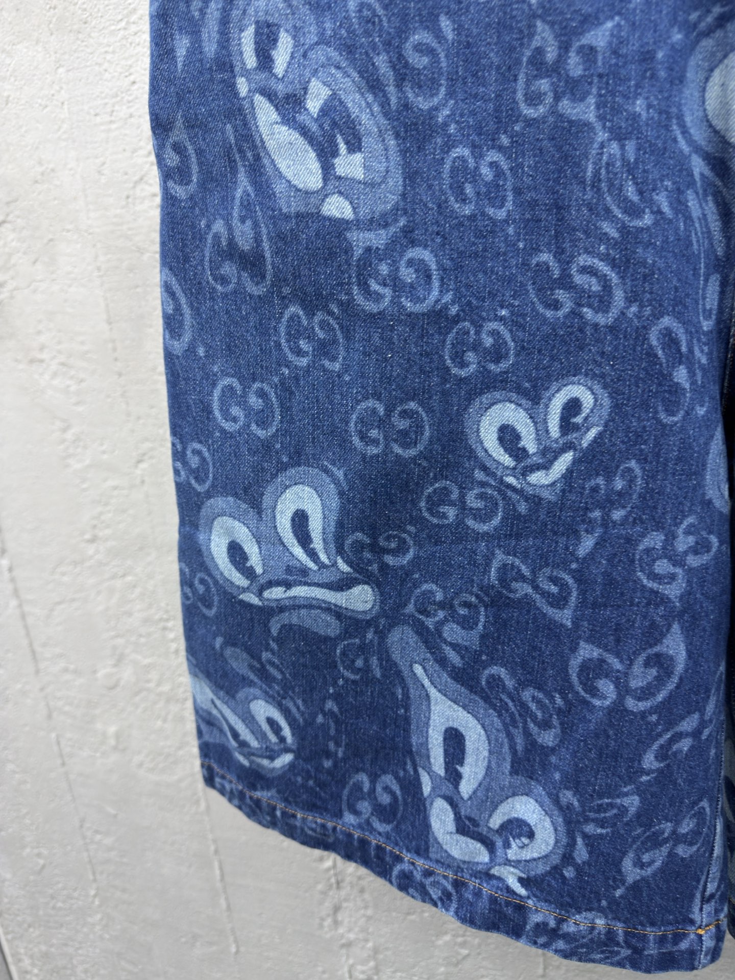 GUCCI 兔耳图案牛仔短裤 工艺说明:定织定染竹节 兔耳朵图案提花面料,红外线定位裁剪 全部对格对位,成衣水洗酵磨工艺,定制原版黄铜金属链条、工字扣、铆钉,专车全麦夹工艺,定制原版真皮皮标,整体走线平直细腻,面料舒适柔软,颜色一致无色差 能与同款搭配营造时尚造型,驾驭各种场合,定制辅料,三标齐全,男女同款! ⚠️颜色:蓝色 ⚠️Size:46/48/50/52