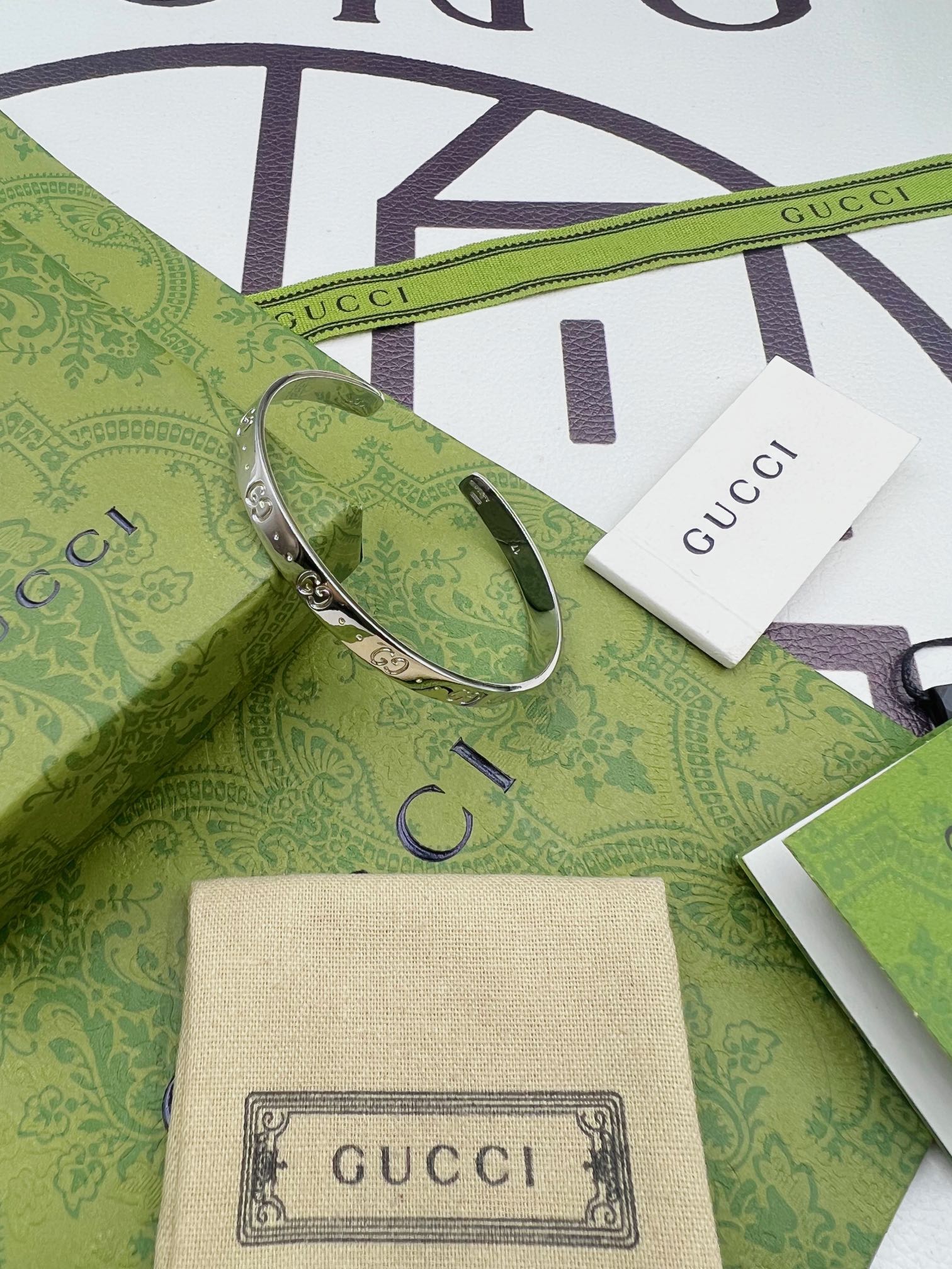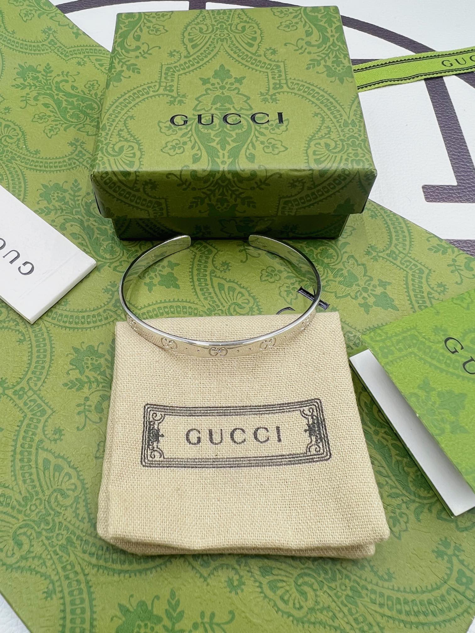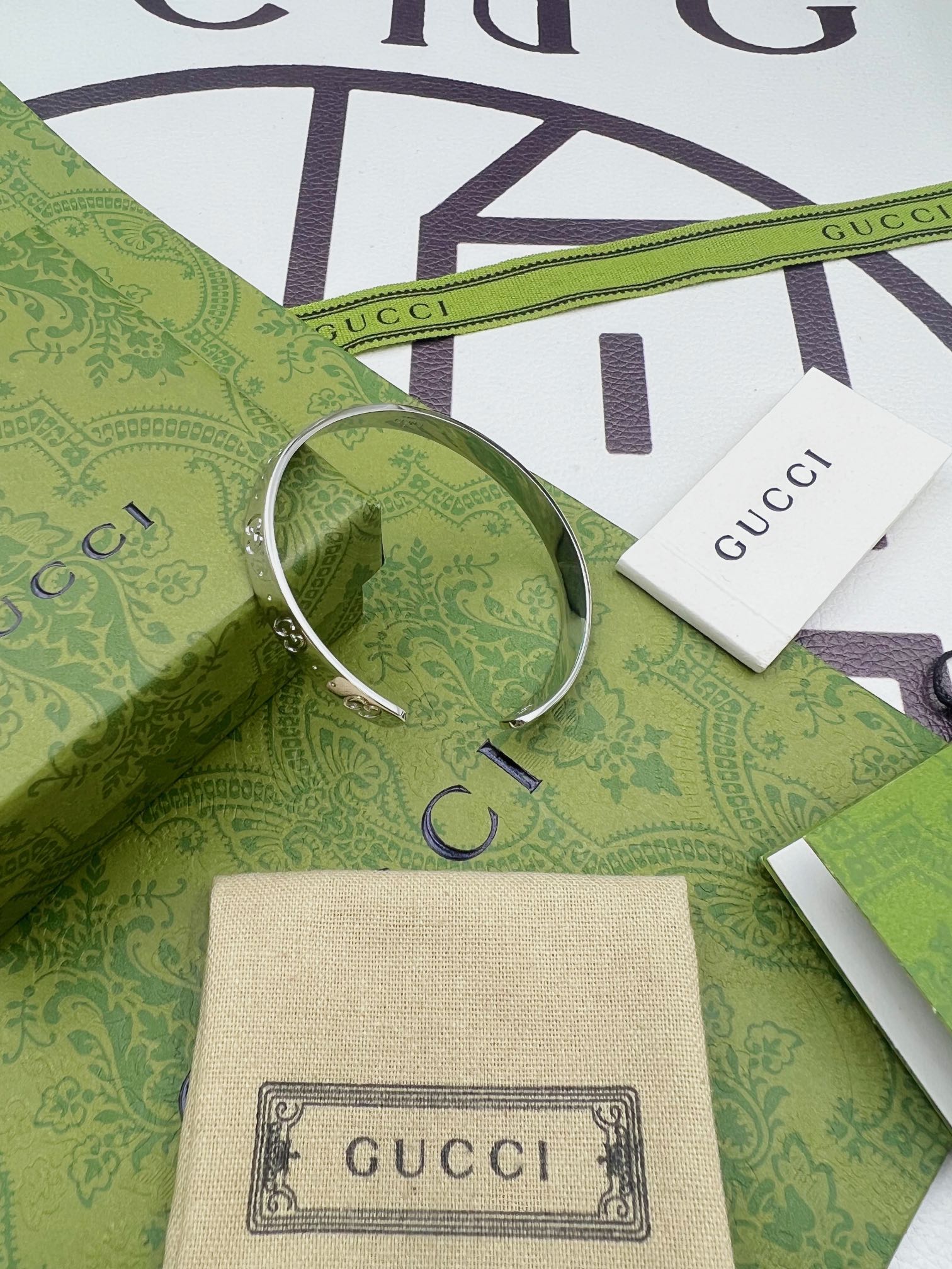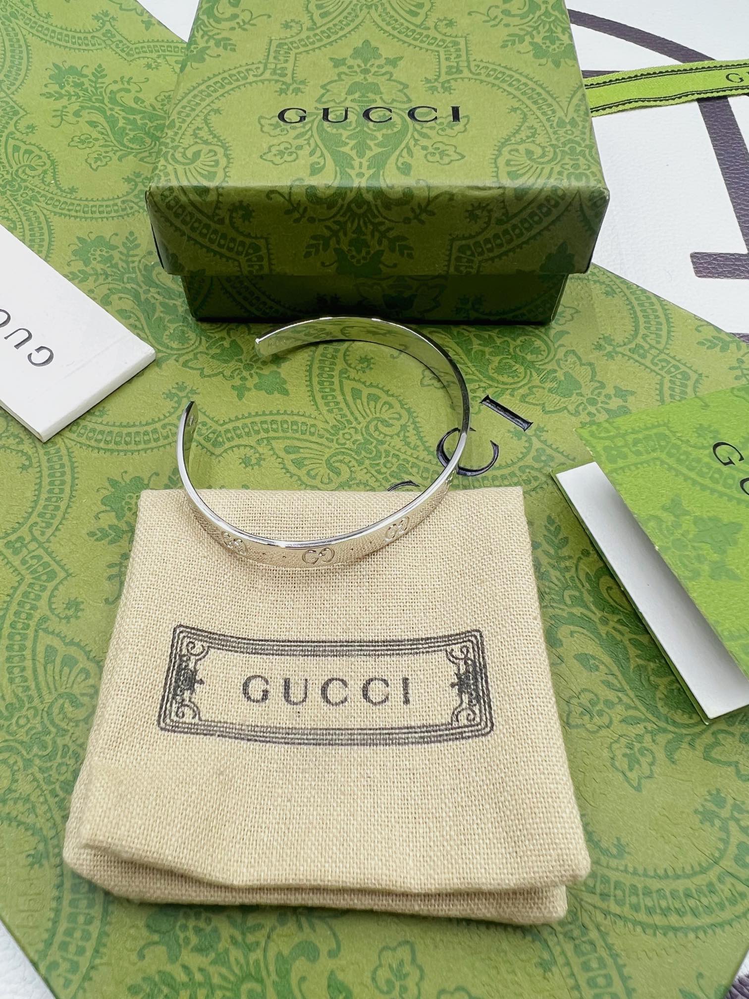 Gucci双G手镯 银色 尺寸:19cm内圈周长 材料:925纯银 14克 细节:原版开版,尺寸1比1原版,还原原版克重,拒绝偷工减料。 独家专属:可备注定制刻字,加上属于自己的专属字母➕ 独家实拍 自己工厂1比1制作 需要图片包装➕