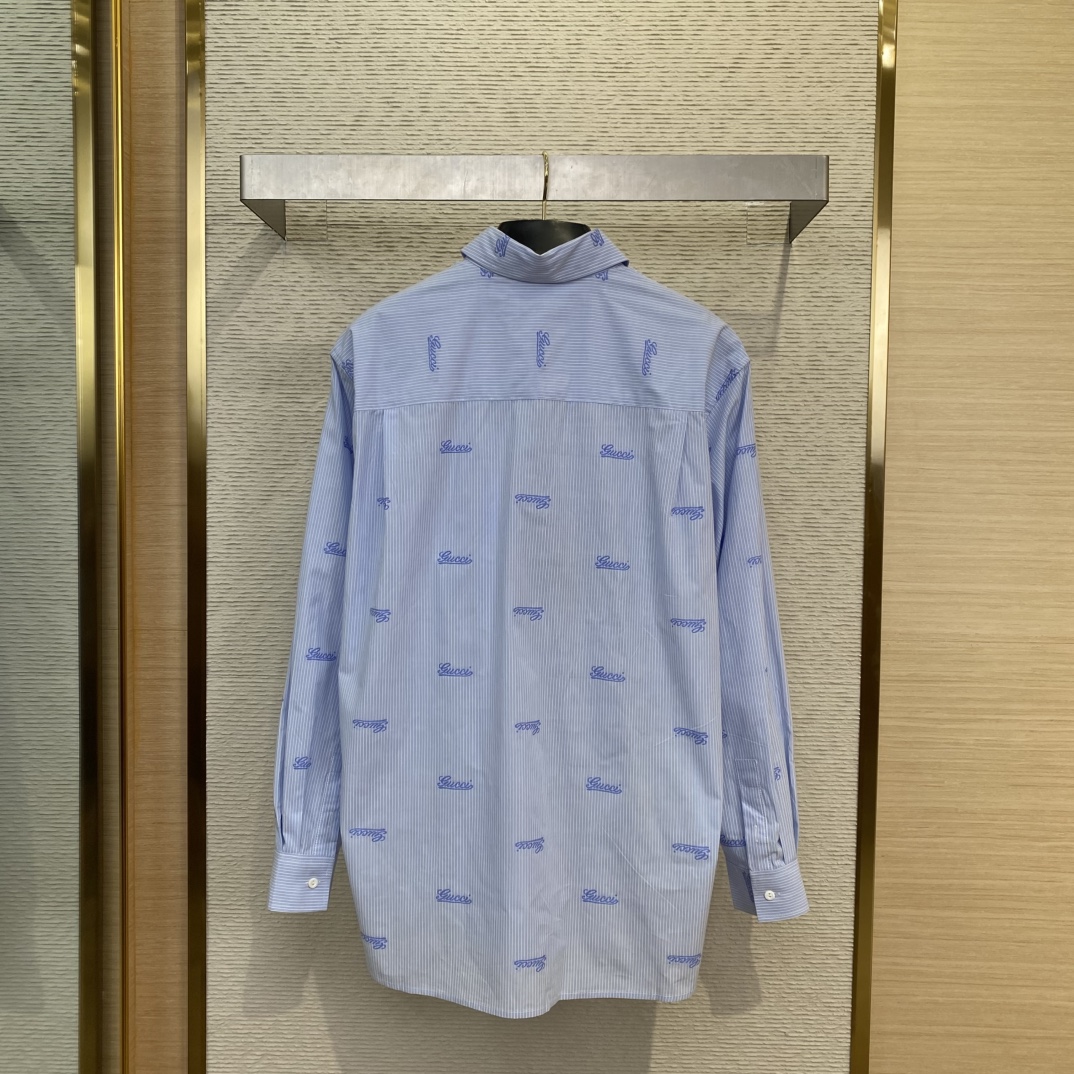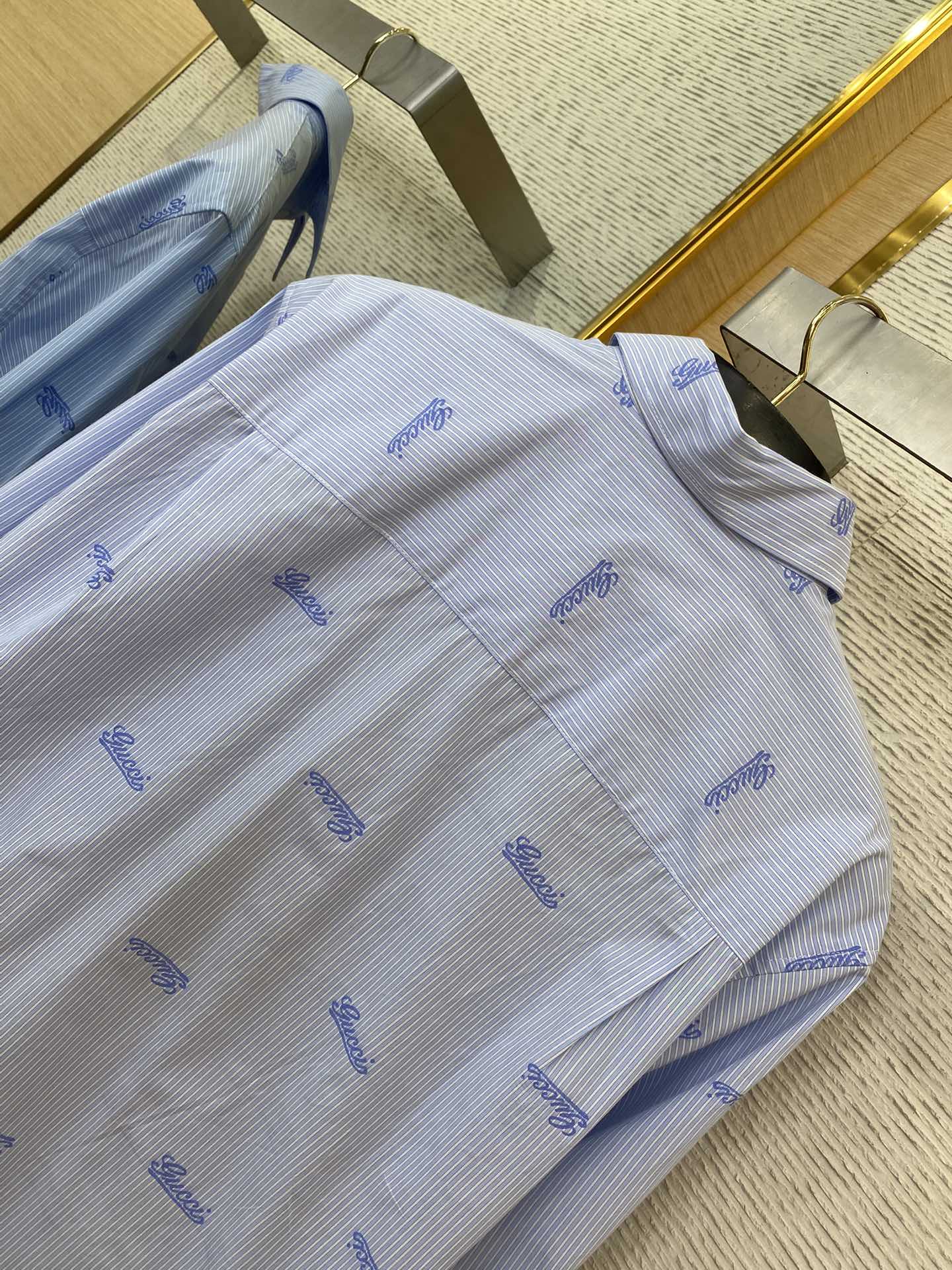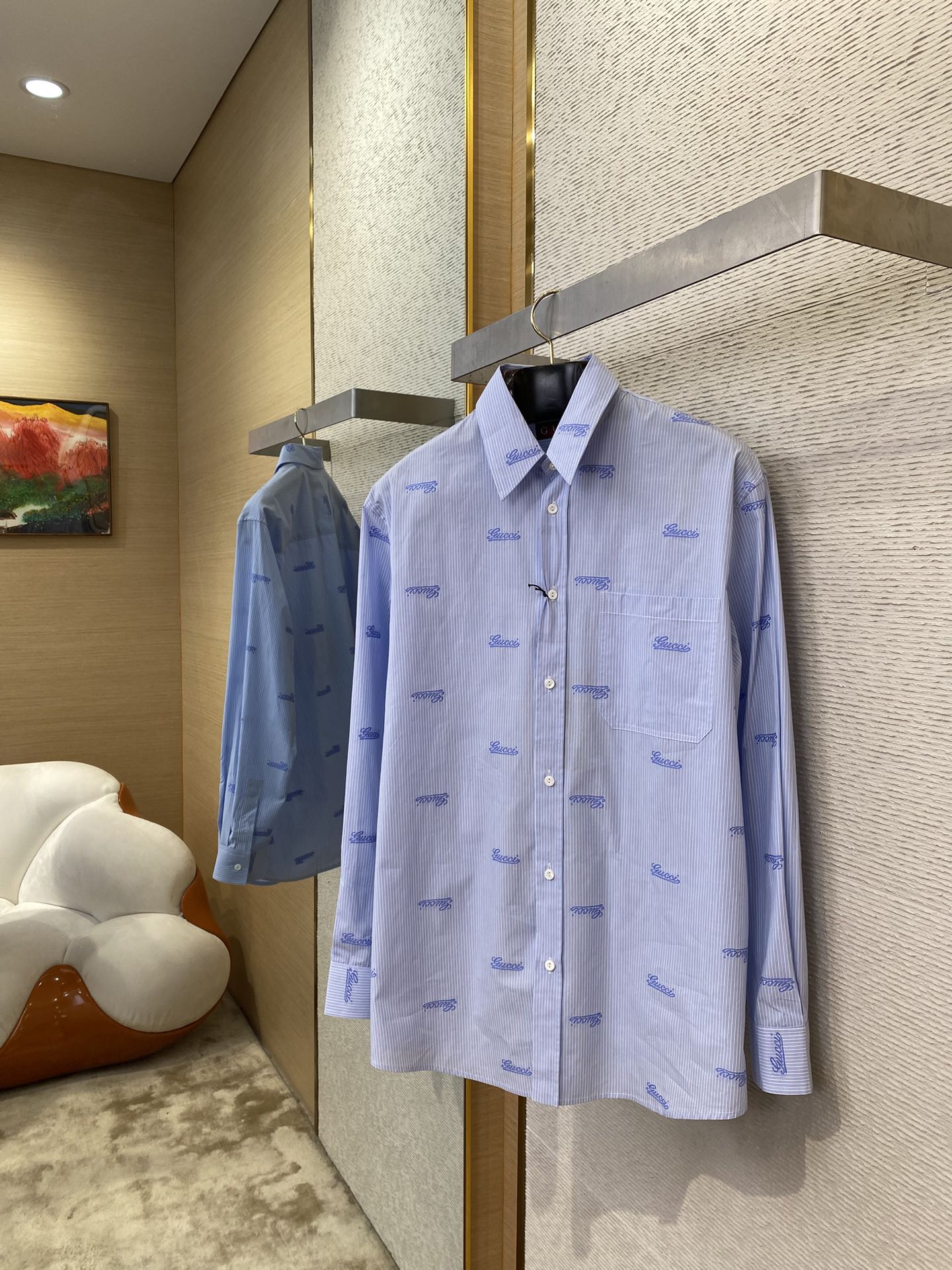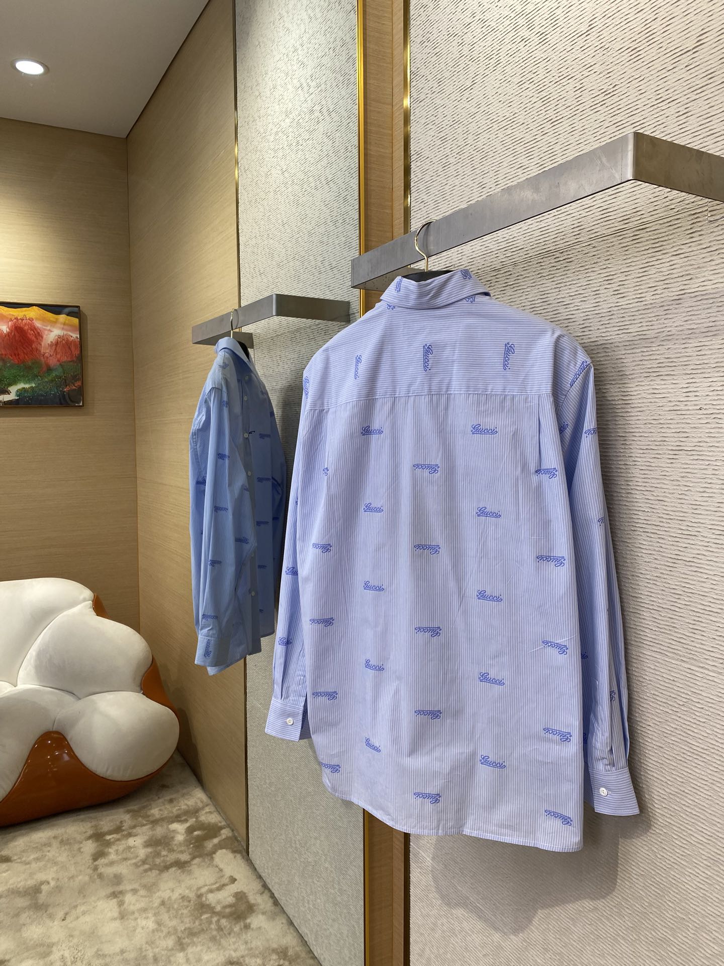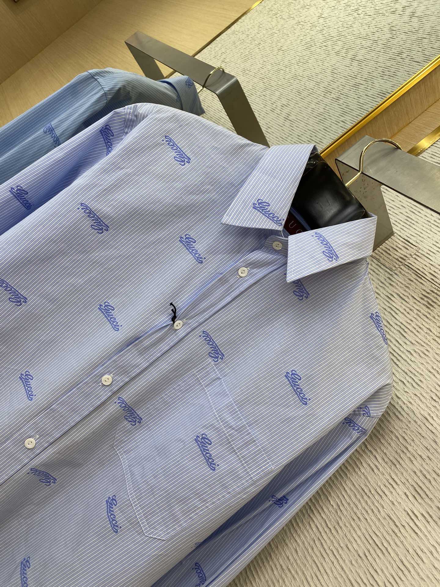 GUCCI古驰徽标字母刺绣翻领衬衫 【正确价格咨询客服】 【 】 YB购入打版,采用蓝色棉质面料精心制作,胸口贴袋设计,通体饰以经典的徽标手写字母刺绣点缀,成衣后整件重酵加柔洗水,保证无缩率,手感柔软,可与牛仔裤或短裤搭配,打造休闲时尚造型,定制辅料,三标齐全,男女同款! ⚠️洗涤方式:建议干洗或反面冷水单独快速机洗 ⚠️售后无忧-顶级服务、效率、品质! ⚠️正确价格请添加客服微信咨询 ➖➖➖➖➖➖ ⚠️ 版型 宽松 ⚠️ 颜色 蓝色 ⚠️ 尺码 S/M/L/XL
