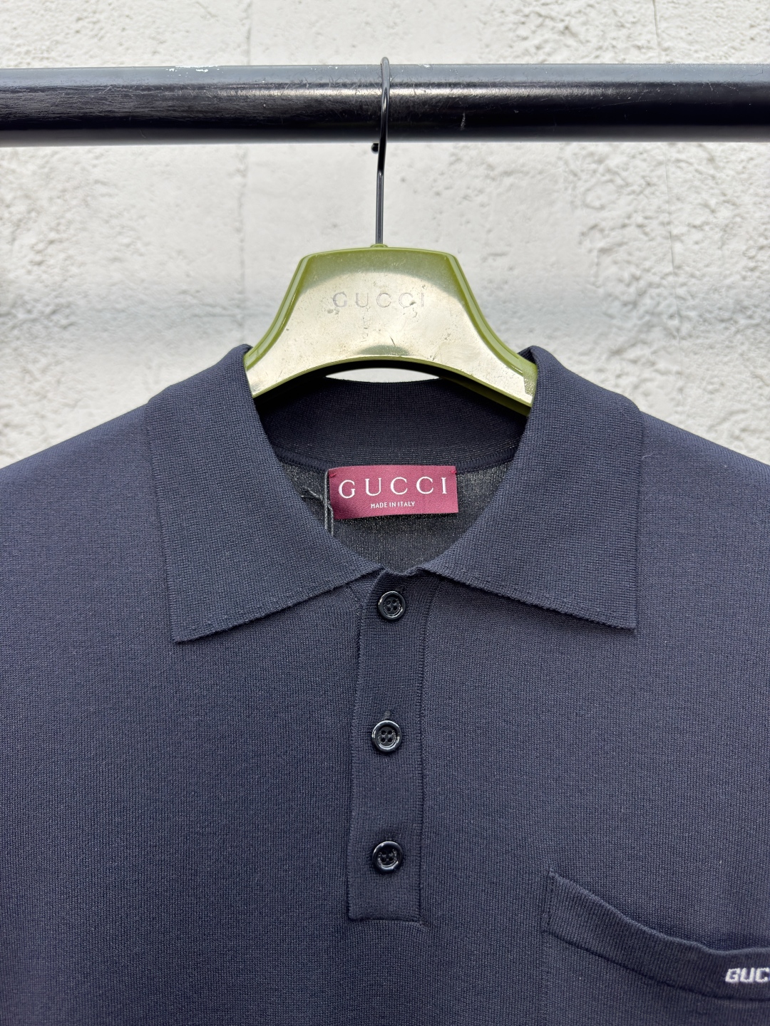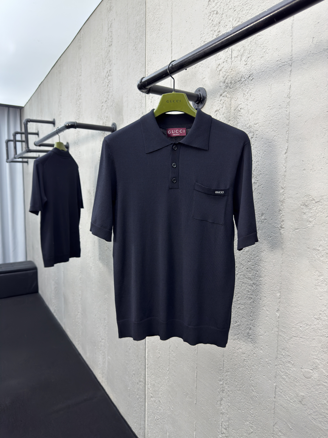 GUCCI 嵌花字母针织POLO衫 工艺说明:定制冰漾超细60支针织绸 嵌花提花织法 通过交织不同颜色的纱线 在织物上形成图案和纹理 精细编织不仅确保了图案的清晰度 采用接缝立体缝线 它通过在接缝处使用特定的缝纫方法 领口部位与腋袖部采用缝盘机作收针 收边明花提花效果 通过特定的编织工艺在织物上形成的突出花纹 增添视觉效果 整体走线平直细腻,面料舒适柔软,颜色一致无色差 能与同款搭配营造时尚造型,驾驭各种场合,定制辅料,三标齐全,男女同款! ⚠️颜色:黑色 ⚠️Size:XS/S/M