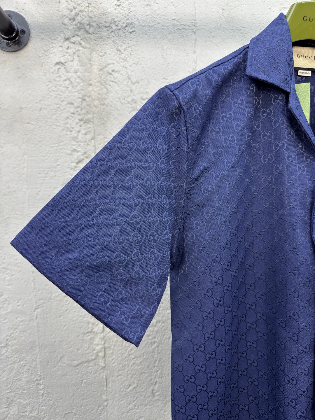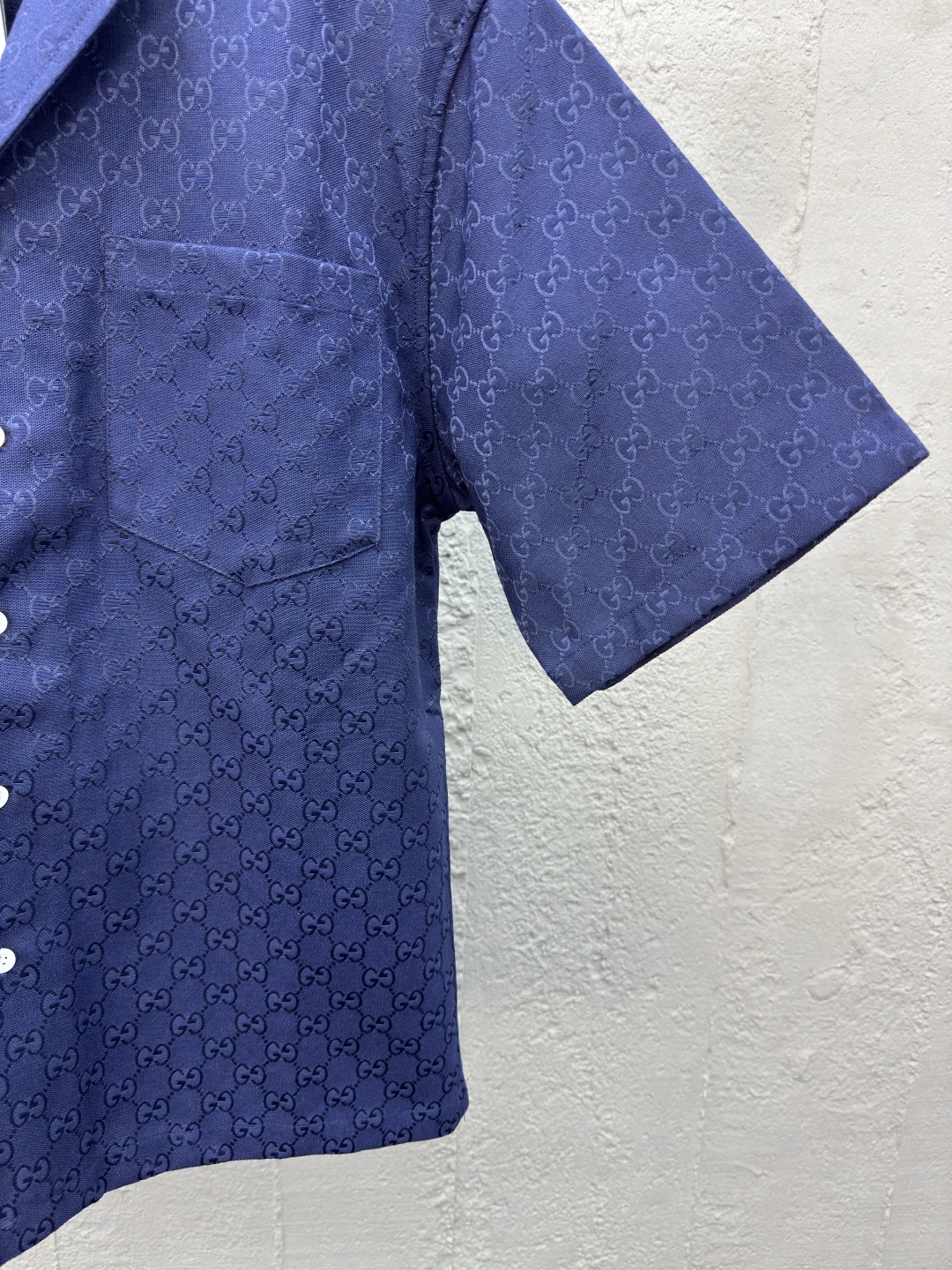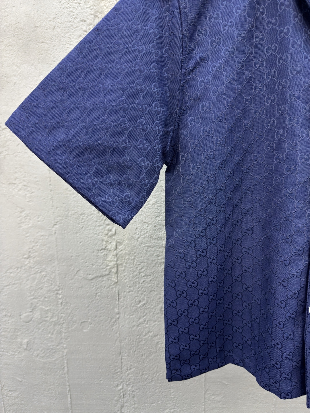 GUCCI 提花满印双G短袖外套 工艺说明:定制经典提花面料,满身经典双G互扣logo。松紧弹力带腰围设计,手缝压花皮质吊粒,微廓形裤脚设计,整体走线平直细腻,面料舒适柔软,颜色一致无色差 能与同款搭配营造时尚造型,驾驭各种场合,定制辅料,三标齐全,男女同款! ⚠️颜色:蓝色 ⚠️Size:S/M/L/XL