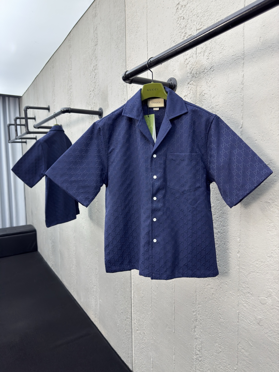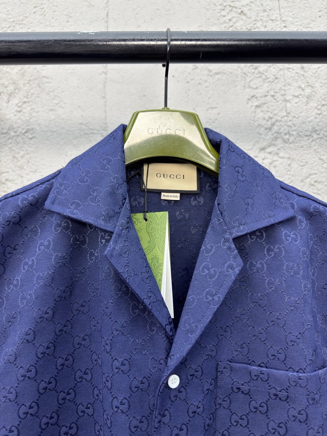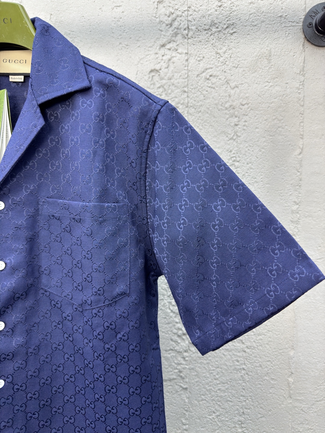 GUCCI 提花满印双G短袖外套 工艺说明:定制经典提花面料,满身经典双G互扣logo。松紧弹力带腰围设计,手缝压花皮质吊粒,微廓形裤脚设计,整体走线平直细腻,面料舒适柔软,颜色一致无色差 能与同款搭配营造时尚造型,驾驭各种场合,定制辅料,三标齐全,男女同款! ⚠️颜色:蓝色 ⚠️Size:S/M/L/XL