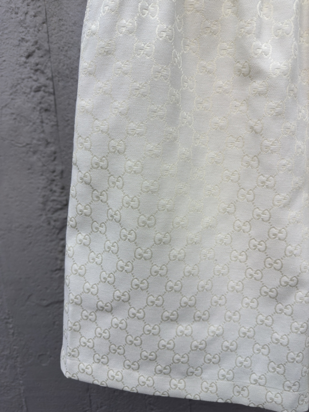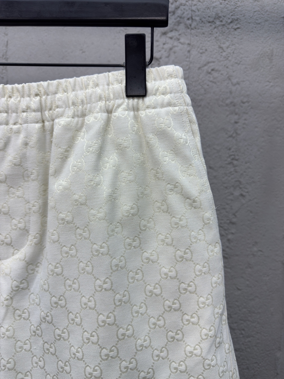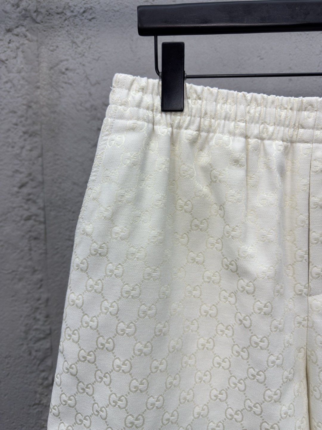 GUCCI 提花满印双G短裤 工艺说明:定制经典提花面料,满身经典双G互扣logo。松紧弹力带腰围设计,手缝压花皮质吊粒,微廓形裤脚设计,整体走线平直细腻,面料舒适柔软,颜色一致无色差 能与同款搭配营造时尚造型,驾驭各种场合,定制辅料,三标齐全,男女同款! ⚠️颜色:米白色 ⚠️Size:S/M/L/XL